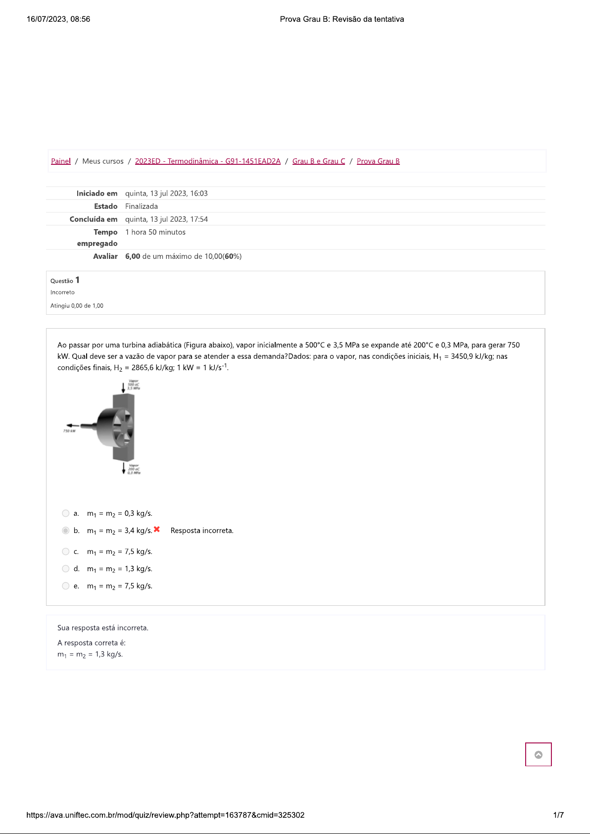 16/07/2023, 08:56 Prova Grau B: Revisão da tentativa Painel / Meus cursos / 2023ED - Termodinâmica - G91-1451EAD2A / Grau B e Grau Prova Grau B Iniciado em quinta, 13 jul 2023, 16:03 Estado Finalizada Concluída em quinta, 13 jul 2023, 17:54 Tempo 1 hora 50 minutos empregado Avaliar 6,00 de um máximo de 10,00(60%) Questão 1 Incorreto Atingiu 0,00 de 1,00 Ao passar por uma turbina adiabática (Figura abaixo), vapor inicialmente a 500°C e 3,5 MPa se expande até 200°C e 0,3 MPa, para gerar 750 kW. Qual deve ser a vazão de vapor para se atender a essa demanda?Dados: para vapor, nas condições iniciais, = 3450,9 kJ/kg; nas condições finais, H₂ = 2865,6 kJ/kg; 1 kW = 200 a. = m₂ = 0,3 kg/s. b. m₁ = m₂ = 3,4 kg/s. Resposta incorreta. C. m₁ = m₂ = 7,5 kg/s. d. m₁ = m₂ 1,3 kg/s. e. m₁ = m₂ = 7,5 kg/s. Sua resposta está incorreta. A resposta correta é: = m₂ = 1,3 kg/s. 1/716/07/2023, 08:56 Prova Grau B: Revisão da tentativa Questão 2 Correto Atingiu 1,00 de 1,00 Uma cozinheira distraiu-se e encostou uma parte do antebraço em uma panela muito quente, sofrendo queimadura. Admitindo que, na área de sua pele que sofreu contato, a temperatura aumentou de 36,5 °C para 66,5 °C em 0,5 S, qual foi a potência da transferência de calor da panela para a pele da cozinheira? (Considere a capacidade térmica na pele afetada da cozinheira como 0,02 cal/°C e 1 caloria = 4,2 Joules.) a. 7.13 W b. 17.44 W C. 8.95 W d. Parabéns! Você acertou. 5.04 W e. 12.43 W Sua resposta está correta. A resposta correta é: 5.04 W 2/716/07/2023, 08:56 Prova Grau B: Revisão da tentativa Questão 3 Completo Atingiu 3,00 de 4,00 Rudolf Diesel patenteou um motor a combustão interna de elevada eficiência, cujo ciclo esta esquematizado no diagrama pressão X volume. ciclo Diesel é composto por quatro etapas, duas das quais são transformações adiabáticas. motor de Diesel é caracterizado pela compressão de ar apenas, com a injeção do combustível no final. Pressão C D A V₂ Volume Explique as transformações que ocorrem partindo de As tranformações representadas no grafico são A->B Ocorre uma transformação adiabatica ou seja uma transformação sem troca de calor. B->C Ocorre uma expansão isobarica, atravez da execução do trabalho e do aumento da temperatura. C->D : Ocorre uma transformação adiabatica ou seja uma transformação sem troca de calor. D->A : Ocorre uma expansão isobarica, atravez da execução do trabalho e do aumento da temperatura. Comentário: A contração isotérmica B expansão isobárica em que sistema realiza trabalho e a temperatura se eleva. D expansão isotérmica D A - redução de pressão isovolumétrica 3/716/07/2023, 08:56 Prova Grau B: Revisão da tentativa Questão 4 Incorreto Atingiu 0,00 de 1,00 Água inicialmente a 40°C é bombeada a partir de um tanque de armazenagem a uma vazão de 100 kg/min e deve atingir um segundo tanque, localizado 25 m acima do primeiro, a 25°C (Figura abaixo). Qual deve ser a potência da bomba utilizada nesse transporte de água, se no caminho entre primeiro e segundo tanques ocorre uma perda de calor à taxa de 200 kJ/s? 25 Dados: entalpia da água líquida: 104,89 kJ/kg a entalpia da água líquida: 167,50 kJ/kg a a. Wₛ = 15 kW. Resposta incorreta. b. = 25 kW. C. Wₛ = 100 kW. d. Wₛ = 96 kW. e. = 96 kW. Sua resposta está incorreta. A resposta correta é: = 96 kW. 4/716/07/2023, 08:56 Prova Grau B: Revisão da tentativa Questão 5 Incorreto Atingiu 0,00 de 1,00 Um problema que muitas vezes deve ser enfrentado em engenharia é a interpolação de valores. Nem todos os valores de propriedades físicas estão tabelados, e é comum precisarmos de um valor que não está tabelado. Neste caso é preciso obter este valor via interpolação entre os dois valores tabelados mais próximos. Um exemplo desta aplicação é para vapor d'água saturado. balanço de massa e energia de evaporadores pode depender da necessidade de valores obtidos por interpolação, especialmente quando se utiliza vapor troca térmica, ou quando vapor é retirado de uma mistura sendo concentrada (Figura abaixo). Calcule a entalpia do vapor d'água a 13 kPa que sai de um processo de concentração de café. Qual é a temperatura do vapor saturado nesta pressão? Dados: entalpia do vapor d'água saturado a 10 kPa e 45,81°C é 2584,7 kJ/kg entalpia do vapor d'água saturado a 15 kPa e 53,97°C é 2599,1 kJ/kg Café a. T = 8,16°C. C. T = 49,89°C. Resposta incorreta. d. T e. T 50,7°C. Sua resposta está incorreta. A resposta correta é: T = 50,7°C. 5/716/07/2023, 08:56 Prova Grau B: Revisão da tentativa Questão 6 Correto Atingiu 1,00 de 1,00 Uma máquina térmica opera segundo o ciclo JKLMJ mostrado no diagrama T-S da figura. T(K) K T1 M L S₂ S(J/K) Pode-se afirmar que: a. durante o processo LM, uma quantidade de calor QLM = S₁) é absorvida pelo sistema. b. processo JK corresponde a uma compressão isotérmica. C. outra máquina térmica que opere entre T₂ e T1 poderia eventualmente possuir um rendimento maior que a desta. d. rendimento da máquina é dado por n = 1 e. Parabéns! Você acertou. trabalho realizado pela máquina em um ciclo é W = T₁)(S₂ Sua resposta está correta. A resposta correta é: o trabalho realizado pela máquina em um ciclo 6/716/07/2023, 08:56 Prova Grau B: Revisão da tentativa Questão 7 Correto Atingiu 1,00 de 1,00 Ar a 1 bar e 25 °C é comprimido até 5 bar e 25 através de um resfriamento a pressão constante seguido por aquecimento a volume constante. Calcule q, W, Ди e h para a trajetória e assinale a alternativa com as respostas corretas abaixo. As capacidades caloríficas do ar podem ser consideradas independentes da temperatura: Cv = 20,78 e = 29,10 J/mol/K. Admita também para o ar que Pv/T é uma constante. A 298,15 K e 1 bar, o volume molar do ar é de 0,02479 m³/mol. a. q = -9915 J/mol, W = -q, Ди = = 0 J/mol b. q = -9915 J/mol, w = q, = h = 0 J/mol C. q = -1983 J/mol, w =