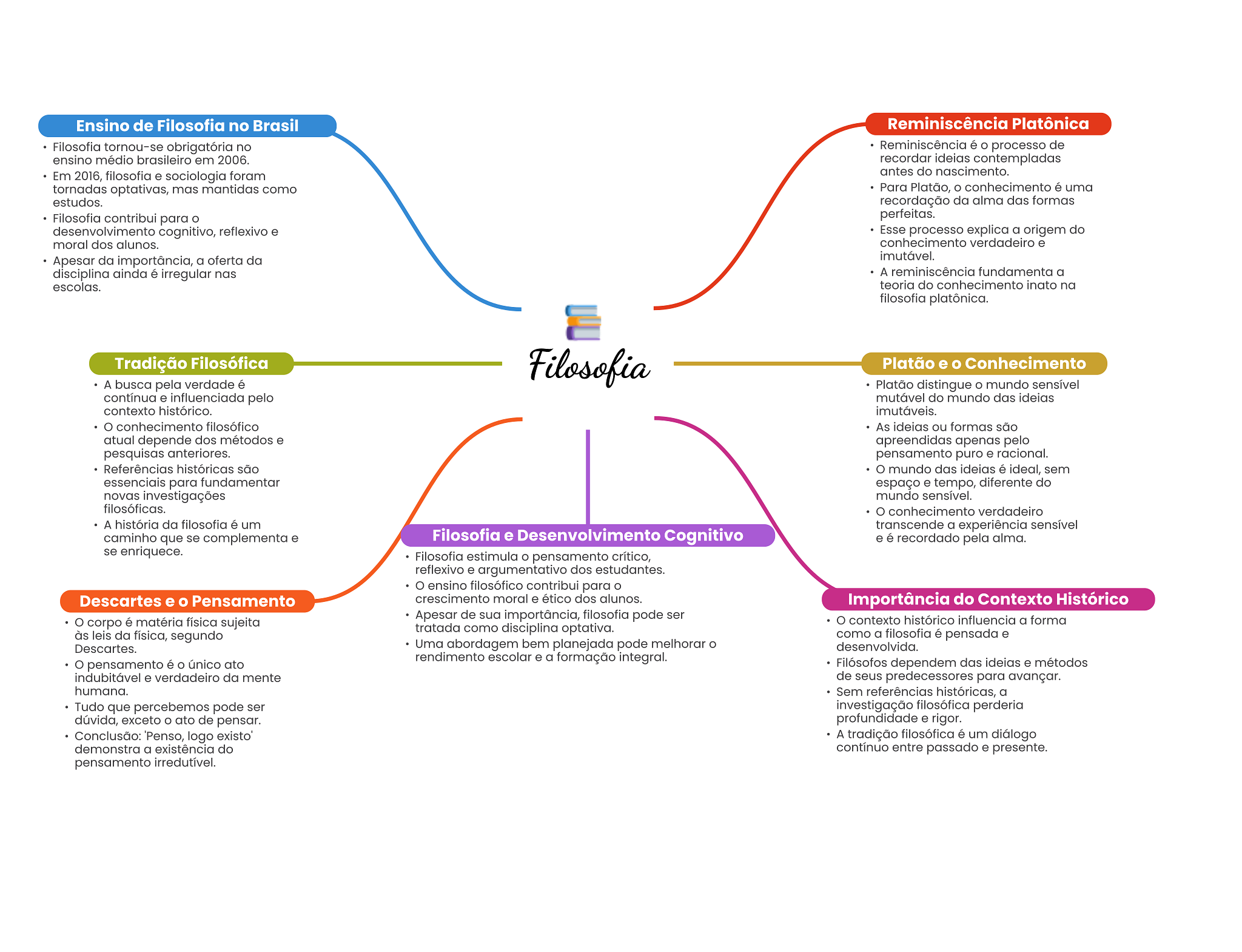 Ensino de Filosofia no Brasil Reminiscência Platônica Filosofia tornou-se obrigatória no Reminiscência é processo de ensino médio brasileiro em 2006. recordar ideias contempladas Em 2016, filosofia e sociologia foram antes do nascimento. tornadas optativas, mas mantidas como Para Platão, conhecimento é uma estudos. recordação da alma das formas Filosofia contribui para perfeitas. desenvolvimento cognitivo, reflexivo e Esse processo explica a origem do moral dos alunos. conhecimento verdadeiro e Apesar da importância, a oferta da imutável. disciplina ainda é irregular nas A reminiscência fundamenta a escolas. teoria do conhecimento inato na filosofia platônica. Tradição Filosófica Filosofia Platão e Conhecimento A busca pela verdade é Platão distingue mundo sensível contínua e influenciada pelo mutável do mundo das ideias contexto histórico. imutáveis. conhecimento filosófico As ideias ou formas são atual depende dos métodos e apreendidas apenas pelo pesquisas anteriores. pensamento puro e racional. Referências históricas são mundo das ideias é ideal, sem essenciais para fundamentar espaço e tempo, diferente do novas investigações mundo sensível. filosóficas. conhecimento verdadeiro A história da filosofia é um transcende a experiência sensível caminho que se complementa e Filosofia e Desenvolvimento Cognitivo e é recordado pela alma. se enriquece. Filosofia estimula pensamento crítico, reflexivo e argumentativo dos estudantes. ensino filosófico contribui para O Descartes e Pensamento crescimento moral e ético dos alunos. Importância do Contexto Histórico Apesar de sua importância, filosofia pode ser corpo é matéria física sujeita contexto histórico influencia a forma tratada como disciplina optativa. às leis da física, segundo como a filosofia é pensada e Descartes. Uma abordagem bem planejada pode melhorar desenvolvida. rendimento escolar e a formação integral. pensamento é único ato Filósofos dependem das ideias e métodos indubitável e verdadeiro da mente de seus predecessores para avançar. humana. Sem referências históricas, a Tudo que percebemos pode ser investigação filosófica perderia dúvida, exceto ato de pensar. profundidade e rigor. Conclusão: Penso, logo A tradição filosófica é um diálogo demonstra a existência do contínuo entre passado e presente. pensamento irredutível.