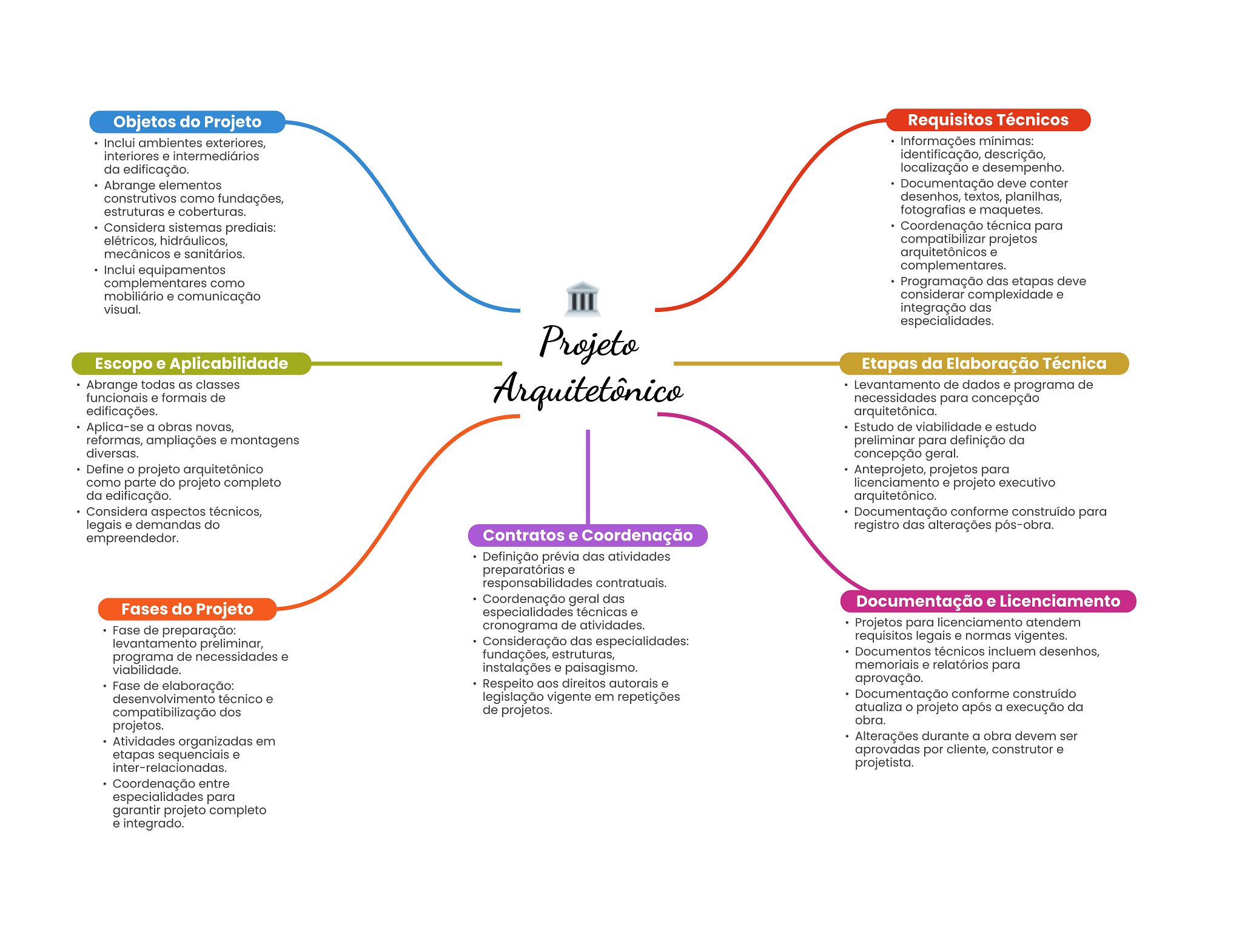 Objetos do Projeto Requisitos Técnicos Inclui ambientes exteriores, Informações mínimas: interiores e intermediários identificação, descrição, da edificação. localização e desempenho. Abrange elementos Documentação deve conter construtivos como fundações, desenhos, textos, planilhas, estruturas e coberturas. fotografias e maquetes. Considera sistemas prediais: Coordenação técnica para elétricos, hidráulicos, compatibilizar projetos mecânicos e sanitários. arquitetônicos e Inclui equipamentos complementares. complementares como Programação das etapas deve mobiliário e comunicação considerar complexidade e visual. integração das especialidades. Projeto Escopo e Aplicabilidade Etapas da Elaboração Técnica Abrange todas as classes funcionais e formais de Arquitetônico Levantamento de dados e programa de necessidades para concepção edificações. arquitetônica. Aplica-se a obras novas, Estudo de viabilidade e estudo reformas, ampliações e montagens preliminar para definição da diversas. concepção geral. Define O projeto arquitetônico Anteprojeto, projetos para como parte do projeto completo licenciamento e projeto executivo da edificação. arquitetônico. Considera aspectos técnicos, Documentação conforme construído para legais e demandas do registro das alterações pós-obra. empreendedor. Contratos e Coordenação Definição prévia das atividades preparatórias e responsabilidades contratuais. Coordenação geral das Fases do Projeto Documentação e Licenciamento especialidades técnicas e Fase de preparação: cronograma de atividades. Projetos para licenciamento atendem levantamento preliminar, Consideração das especialidades: requisitos legais e normas vigentes. programa de necessidades e fundações, estruturas, Documentos técnicos incluem desenhos, viabilidade. instalações e paisagismo. memoriais e relatórios para Respeito aos direitos autorais e aprovação. Fase de elaboração: desenvolvimento técnico e legislação vigente em repetições Documentação conforme construído compatibilização dos de projetos. atualiza O projeto após a execução da obra. projetos. Atividades organizadas em Alterações durante a obra devem ser etapas sequenciais e aprovadas por cliente, construtor e inter-relacionadas. projetista. Coordenação entre especialidades para garantir projeto completo e integrado.