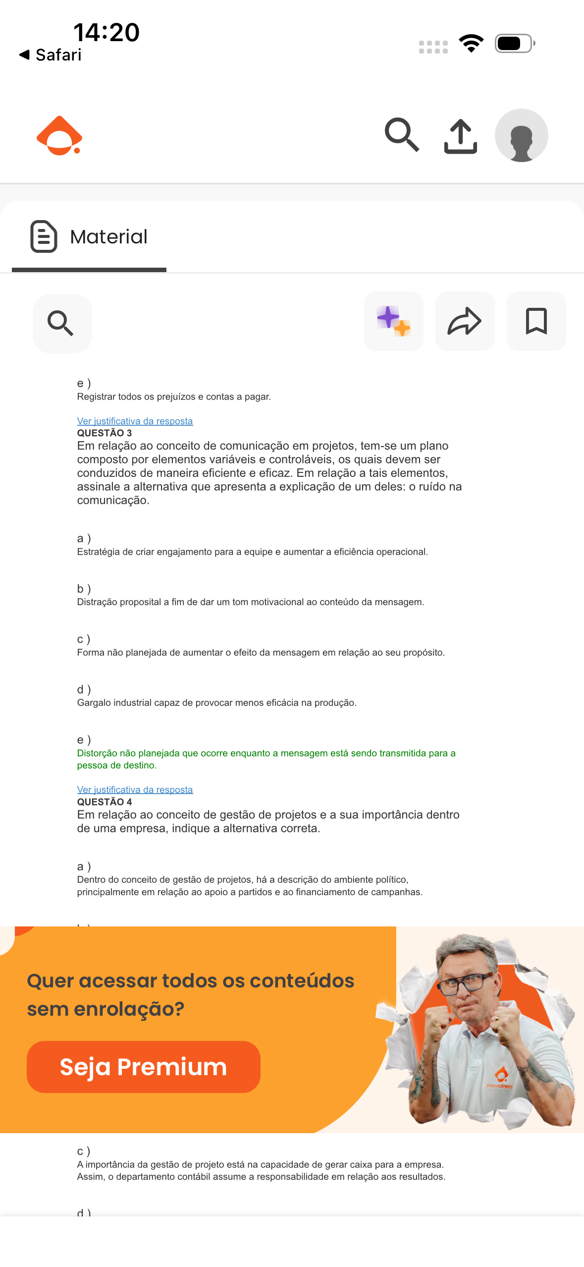 14:20 Safari Material e ) Registrar todos prejuízos e contas a pagar. Ver justificativa da resposta QUESTÃO 3 Em relação ao conceito de comunicação em projetos, tem-se um plano composto por elementos variáveis e controláveis, os quais devem ser conduzidos de maneira eficiente e eficaz. Em relação a tais elementos, assinale a alternativa que apresenta a explicação de um deles: ruído na comunicação. a ) Estratégia de criar engajamento para a equipe e aumentar a eficiência operacional. b) Distração proposital a fim de dar um tom motivacional ao conteúdo da mensagem. c) Forma não planejada de aumentar efeito da mensagem em relação ao seu propósito. d) Gargalo industrial capaz de provocar menos eficácia na produção. e ) Distorção não planejada que ocorre enquanto a mensagem está sendo transmitida para a pessoa de destino. Ver justificativa da resposta QUESTÃO 4 Em relação ao conceito de gestão de projetos e a sua importância dentro de uma empresa, indique a alternativa correta. a ) Dentro do conceito de gestão de projetos, há a descrição do ambiente político, principalmente em relação ao apoio a partidos e ao financiamento de campanhas. Quer acessar todos os conteúdos sem enrolação? Seja Premium c) A importância da gestão de projeto está na capacidade de gerar caixa para a empresa. Assim, departamento contábil assume a responsabilidade em relação aos resultados. d)