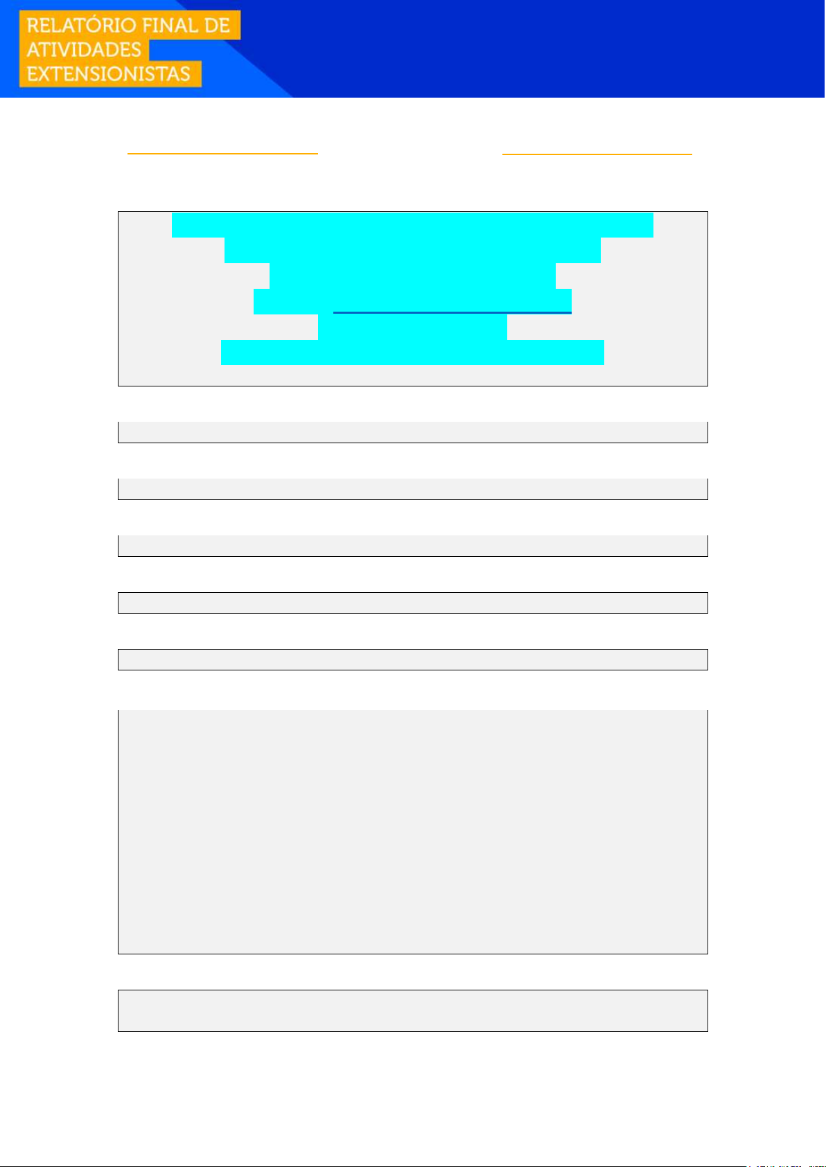 1 DADOS DO ALUNO: Aluno: [Nome completo] TENHO PRONTO PARA ENVIO, CASO TENHA INTERESSE, ENTRE EM CONTATO: WhatsApp: (73) 99900 0037 E-mail: aleksbraw@gmail.com Ou Acesse o Site: https://trabalhosnotamaxima.com.br RA: [Número do RA do aluno] POLO / UNIDADE: CURSO: ENGENHARIA CIVIL - BACHARELADO COMPONENTE CURRICULAR: PROJETO DE EXTENSÃO III - ENGENHARIA CIVIL PROGRAMA DE EXTENSÃO: PROGRAMA DE INOVAÇÃO E EMPREENDEDORISMO. FINALIDADE E MOTIVAÇÃO: A finalidade da extensão no Programa de Inovação e Empreendedorismo está na articulação de múltiplas competências desenvolvidas durante o curso, criando soluções de produtos e serviços em que que atenda as necessidades do outro, de forma empática, eficaz e sustentável, trazendo a tecnologia e o conhecimento da engenharia civil para a sociedade, beneficiando a comunidade local com o conhecimento adquirido. Os locais que poderão contemplar esse projeto extensionista podem ser: parcerias com a prefeitura; associações de bairros, escolas, praças da cidade, parcerias com empresas públicas e privadas, casas de repouso, creches, edificações públicas como foco em construção civil, estruturas e geotecnia (análise e sugestão de projetos, manutenção de estruturas de concreto, taludes, pavimentação, instalações hidrossanitárias, instalações elétricas, elaboração de desenhos técnicos). COMPETÊNCIAS: I - Desenvolver e utilizar novos materiais, ferramentas e técnicas; II - Ler e interpretar projetos apresentados em forma gráfica; mailto:aleksbraw@gmail.com 2 III - Supervisionar, operar e promover a manutenção de sistemas, obras e serviços de Engenharia Civil. PERFIL DO EGRESSO: O perfil do egresso idealizado pela IES para o curso de Engenharia Civil possibilita a formação do engenheiro civil crítico, reflexivo, criativo, visão holística, humanista e ético, capaz de aplicar tecnologias inerentes à sua área de atuação, sendo que pelas atividades extensionistas vinculadas ao Programa de Inovação e Empreendedorismo, esse egresso poderá desenvolver habilidades e capacidade para atuar de modo responsável e comprometido, interagindo com as novas situações e demandas da sociedade, com isenção e responsabilidade social, comprometido com legislação e atos normativos do exercício do profissional, primando pela busca do conhecimento e da aprendizagem autônoma, investigativa, empreendedora e cooperativa com o emprego de perspectivas multidisciplinares. Ainda, desenvolver a capacidade de planejamento e condução de experimentos; exercer atividades de concepção, supervisão, coordenação; analisar, interpretar e agir em situações pertinentes à engenharia civil, a partir de atitudes críticas, reflexivas e éticas, pois adquiriram habilidades suficientes para, eticamente, atuar em projetos de construção civil e de infraestrutura, utilizando técnicas adequadas de observação, compreendendo as necessidades da sociedade, com forte formação técnica e embasamento teórico, especificando materiais de construção e controlando a qualidade dos processos. SOFT SKILLS (COMPETÊNCIAS SOCIOEMOCIONAIS): Tomada de Decisão Análise e resolução de problemas Aprendizado Ativo OBJETIVOS DE APRENDIZAGEM: Os objetivos da extensão em Engenharia Civil vinculados ao Programa de Inovação e Empreendedorismo estão relacionados com a disseminação do saber técnico das áreas da engenharia civil para a comunidade local, prestando serviços e desenvolvendo produtos que possam solucionar problemáticas identificadas na comunidade, trazendo maior segurança, eficiência e conforto, atendendo a sociedade nas necessidades e transferindo conhecimento acadêmico para a comunidade, preparando o egresso para uma atuação global, focado no mercado de trabalho, consciência social, ética e desenvolvimento de competências de aplicação de projetos e soluções técnicas na sua área de formação CONTEÚDOS: I - Expressão gráfica; II - Construção civil; III - Estruturas; IV - Geotecnia. INDICAÇÕES BIBLIOGRÁFICAS: CUNHA, Alessandra Martins ...[et al]. Construção civil. Porto Alegre : SAGAH, 2017. 3 CORREA, Roberto Machado. Desenho técnico civil: projetos de edifícios e outras construções. Rio de Janeiro: Elsevier, 2019. SANTOS NETO, Pedro Murrieta. Mecânica dos solos. Rio de Janeiro : Elsevier, 2018. CORREA, Priscila Marques. Estruturas em concreto armado. Porto Alegre : SAGAH, 2018. RELATÓRIO FINAL: Aluno e Aluna, após realizar suas atividades de extensão, é necessário que você o formalize, enviando esse Relatório Final para ser avaliado junto ao seu Ambiente Virtual (AVA) e também para você poder comprovar sua atuação. Para o preenchimento, busque as anotações junto ao TEMPLATE PCDA para auxiliar na apresentação das atividades desenvolvidas. Todos os campos são de preenchimento obrigatório! DESCRIÇÃO DA AÇÃO COM RESULTADOS ALCANÇADOS Metas dos Objetivos de Desenvolvimento Sustentável (ODS) aderentes a este projeto: CAMPO OBRIGATÓRIO – busque no seu Template PDCA quais Metas você selecionou como aderentes ao seu projeto, conforme cada Objetivo de Desenvolvimento Sustentável (ODS) da Organização das Nações Unidas (ONU) que você explorou no seu planejamento. Liste as Metas selecionadas (pelo menos uma opção): Local de realização da atividade extensionista: Durante a ação: Caso necessário, houve mudança de estratégia para alcançar o resultado: Resultado da ação: Conclusão: Depoimentos (se houver): RELATE SUA PERCEPÇÃO DAS AÇÕES EXTENSIONISTAS REALIZADAS NO PROGRAMA DESENVOLVIDO: 4 CAMPO OBRIGATÓRIO – relate em no mínimo 15 (quinze) linhas sua experiência com as ações extensionistas. O texto deve ser de sua autoria e inédito, evite plágio. Questões norteadoras: (1) Você notou que suas habilidades profissionais foram aprimoradas, com a atuação nas ações extensionistas? (2) Você identificou melhoria/resolução do problema identificado? (3) Você