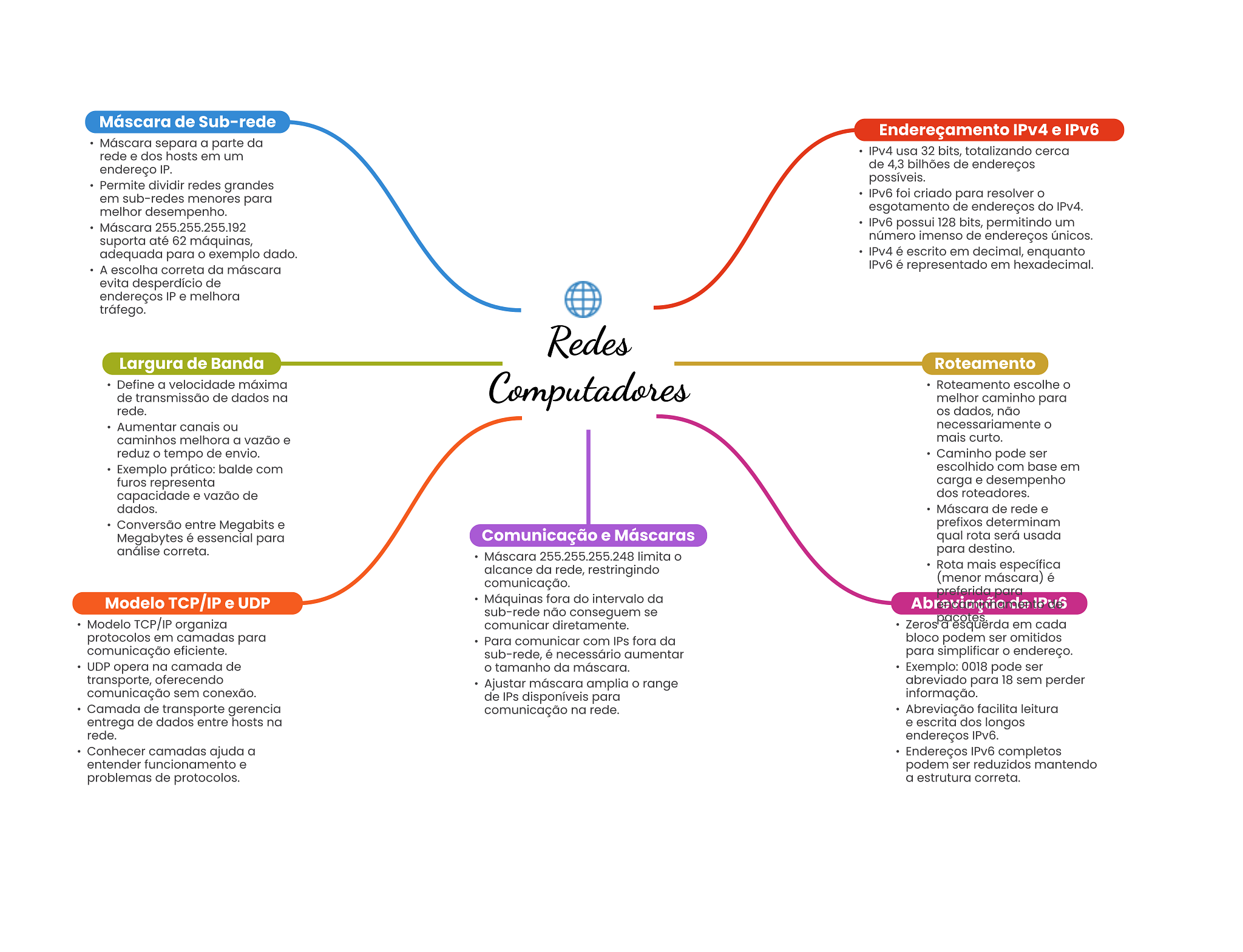 Máscara de Sub-rede Endereçamento IPv4 e IPv6 Máscara separa a parte da rede e dos hosts em um IPv4 usa 32 bits, totalizando cerca endereço IP. de 4,3 bilhões de endereços possíveis. Permite dividir redes grandes em sub-redes menores para IPv6 foi criado para resolver melhor desempenho. esgotamento de endereços do IPv4. Máscara 255.255.255.192 IPv6 possui 128 bits, permitindo um suporta até 62 máquinas, número imenso de endereços únicos. adequada para exemplo dado. IPv4 é escrito em decimal, enquanto A escolha correta da máscara IPv6 é representado em hexadecimal. evita desperdício de endereços IP e melhora tráfego. Redes Largura de Banda Roteamento Define a velocidade máxima Computadores Roteamento escolhe O de transmissão de dados na melhor caminho para rede. OS dados, não Aumentar canais ou necessariamente O caminhos melhora a vazão e mais curto. reduz tempo de envio. Caminho pode ser Exemplo prático: balde com escolhido com base em furos representa carga e desempenho capacidade e vazão de dos roteadores. dados. Máscara de rede e Conversão entre Megabits e prefixos determinam Megabytes é essencial para Comunicação e Máscaras qual rota será usada análise correta. para destino. Máscara 255.255.255.248 limita alcance da rede, restringindo Rota mais específica comunicação. (menor máscara) é preferida Modelo TCP/IP e UDP Máquinas fora do intervalo da der sub-rede não conseguem se Modelo TCP/IP organiza comunicar diretamente. Zeros pacotes a esquerda em cada protocolos em camadas para Para comunicar com IPs fora da bloco podem ser omitidos comunicação eficiente. sub-rede, é necessário aumentar para simplificar O endereço. UDP opera na camada de tamanho da máscara. Exemplo: 0018 pode ser transporte, oferecendo Ajustar máscara amplia range abreviado para 18 sem perder comunicação sem conexão. de IPs disponíveis para informação. Camada de transporte gerencia comunicação na rede. Abreviação facilita leitura entrega de dados entre hosts na e escrita dos longos rede. endereços IPv6. Conhecer camadas ajuda a Endereços IPv6 completos entender funcionamento e podem ser reduzidos mantendo problemas de protocolos. a estrutura correta.