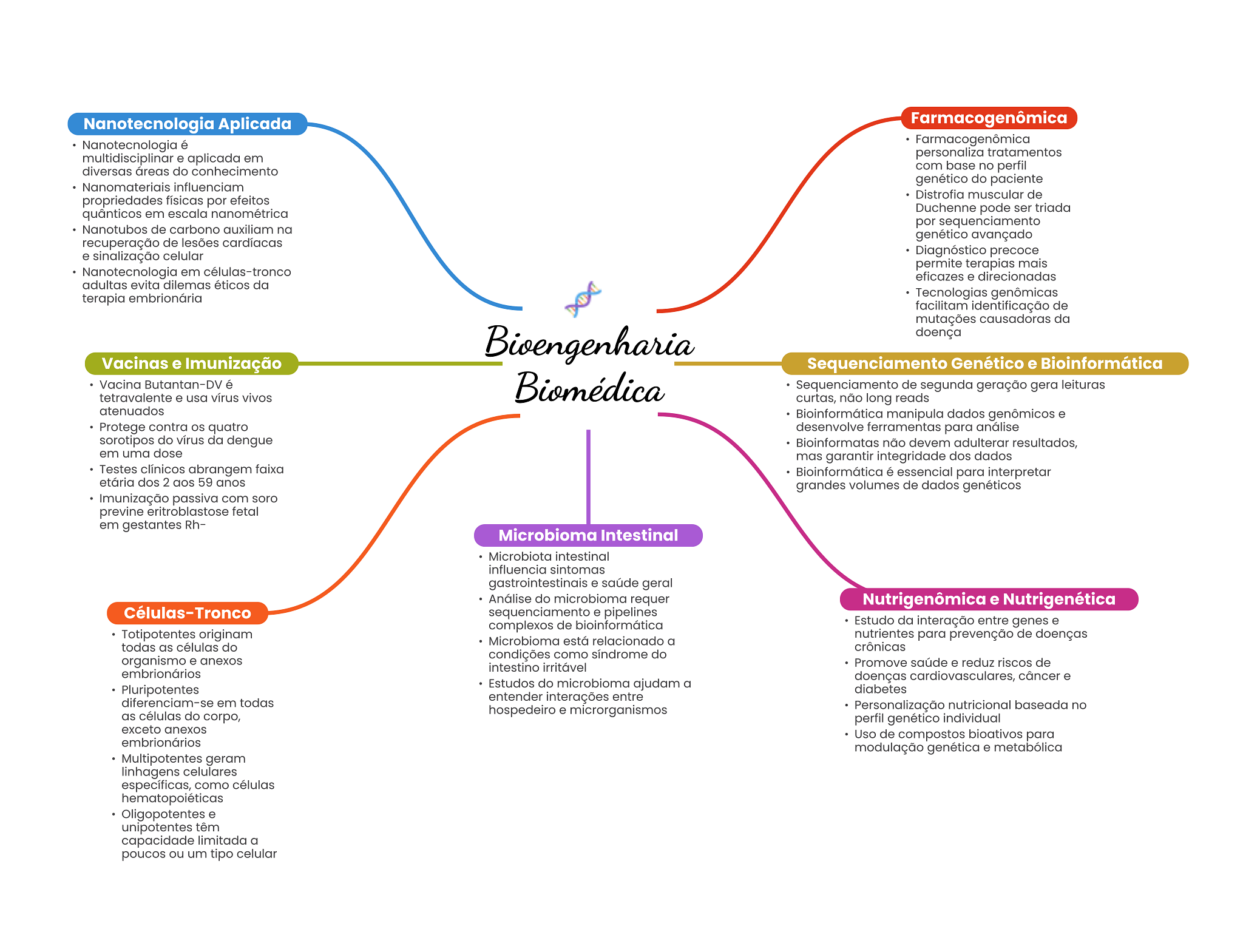 Nanotecnologia Aplicada Farmacogenômica Nanotecnologia é Farmacogenômica multidisciplinar e aplicada em personaliza tratamentos diversas áreas do conhecimento com base no perfil genético do paciente Nanomateriais influenciam Distrofia muscular de propriedades físicas por efeitos quânticos em escala nanométrica Duchenne pode ser triada por sequenciamento Nanotubos de carbono auxiliam na genético avançado recuperação de lesões cardíacas e sinalização celular Diagnóstico precoce permite terapias mais Nanotecnologia em células-tronco eficazes e direcionadas adultas evita dilemas éticos da terapia embrionária Tecnologias genômicas facilitam identificação de mutações causadoras da Bioengenharia doença Vacinas e Imunização Sequenciamento Genético e Bioinformática Vacina Butantan-DV é tetravalente e usa vírus vivos Biomédica Sequenciamento de segunda geração gera leituras curtas, não long reads atenuados Bioinformática manipula dados genômicos e Protege contra quatro desenvolve ferramentas para análise sorotipos do vírus da dengue Bioinformatas não devem adulterar resultados, em uma dose mas garantir integridade dos dados Testes clínicos abrangem faixa Bioinformática é essencial para interpretar etária dos 2 aos 59 anos grandes volumes de dados genéticos Imunização passiva com soro previne eritroblastose fetal em gestantes Rh- Microbioma Intestinal Microbiota intestinal influencia sintomas gastrointestinais e saúde geral Análise do microbioma requer Nutrigenômica e Nutrigenética Células-Tronco sequenciamento e pipelines complexos de bioinformática Estudo da interação entre genes e Totipotentes originam Microbioma está relacionado a nutrientes para prevenção de doenças todas as células do crônicas organismo e anexos condições como síndrome do intestino irritável Promove saúde e reduz riscos de embrionários doenças cardiovasculares, câncer e Pluripotentes Estudos do microbioma ajudam a diabetes diferenciam-se em todas entender interações entre as células do corpo, hospedeiro e microrganismos Personalização nutricional baseada no perfil genético individual exceto anexos Uso de compostos bioativos para embrionários modulação genética e metabólica Multipotentes geram linhagens celulares específicas, como células hematopoiéticas Oligopotentes e unipotentes têm capacidade limitada a poucos ou um tipo celular