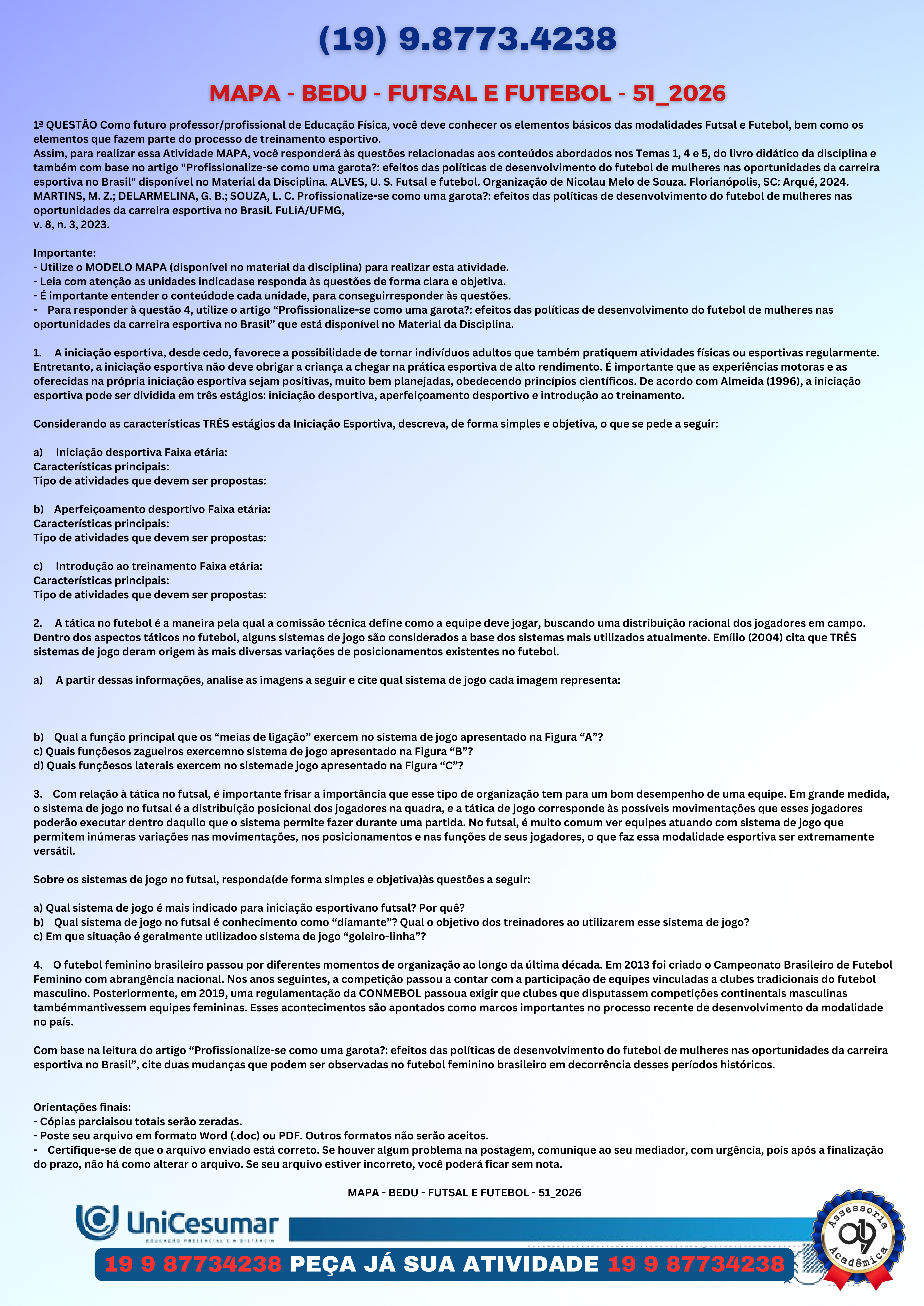1ª QUESTÃO Como futuro professor/profissional de Educação Física, você deve conhecer os elementos básicos das modalidades Futsal e Futebol, bem como os elementos que fazem parte do processo de treinamento esportivo. Assim, para realizar essa Atividade MAPA, você responderá às questões relacionadas aos conteúdos abordados nos Temas 1, 4 e 5, do livro didático da disciplina e também com base no artigo "Profissionalize-se como uma garota?: efeitos das políticas de desenvolvimento do futebol de mulheres nas oportunidades da carreira esportiva no Brasil" disponível no Material da Disciplina. ALVES, U. S. Futsal e futebol. Organização de Nicolau Melo de Souza. Florianópolis, SC: Arqué, 2024. MARTINS, M. Z.; DELARMELINA, G. B.; SOUZA, L. C. Profissionalize-se como uma garota?: efeitos das políticas de desenvolvimento do futebol de mulheres nas oportunidades da carreira esportiva no Brasil. FuLiA/UFMG, v. 8, n. 3, 2023. Importante: - Utilize o MODELO MAPA (disponível no material da disciplina) para realizar esta atividade. - Leia com atenção as unidades indicadase responda às questões de forma clara e objetiva. - É importante entender o conteúdode cada unidade, para conseguirresponder às questões. - Para responder à questão 4, utilize o artigo “Profissionalize-se como uma garota?: efeitos das políticas de desenvolvimento do futebol de mulheres nas oportunidades da carreira esportiva no Brasil” que está disponível no Material da Disciplina. 1. A iniciação esportiva, desde cedo, favorece a possibilidade de tornar indivíduos adultos que também pratiquem atividades físicas ou esportivas regularmente. Entretanto, a iniciação esportiva não deve obrigar a criança a chegar na prática esportiva de alto rendimento. É importante que as experiências motoras e as oferecidas na própria iniciação esportiva sejam positivas, muito bem planejadas, obedecendo princípios científicos. De acordo com Almeida (1996), a iniciação esportiva pode ser dividida em três estágios: iniciação desportiva, aperfeiçoamento desportivo e introdução ao treinamento. Considerando as características TRÊS estágios da Iniciação Esportiva, descreva, de forma simples e objetiva, o que se pede a seguir: a) Iniciação desportiva Faixa etária: Características principais: Tipo de atividades que devem ser propostas: b) Aperfeiçoamento desportivo Faixa etária: Características principais: Tipo de atividades que devem ser propostas: c) Introdução ao treinamento Faixa etária: Características principais: Tipo de atividades que devem ser propostas: 2. A tática no futebol é a maneira pela qual a comissão técnica define como a equipe deve jogar, buscando uma distribuição racional dos jogadores em campo. Dentro dos aspectos táticos no futebol, alguns sistemas de jogo são considerados a base dos sistemas mais utilizados atualmente. Emílio (2004) cita que TRÊS sistemas de jogo deram origem às mais diversas variações de posicionamentos existentes no futebol. a) A partir dessas informações, analise as imagens a seguir e cite qual sistema de jogo cada imagem representa: b) Qual a função principal que os “meias de ligação” exercem no sistema de jogo apresentado na Figura “A”? c) Quais funçõesos zagueiros exercemno sistema de jogo apresentado na Figura “B”? d) Quais funçõesos laterais exercem no sistemade jogo apresentado na Figura “C”? 3. Com relação à tática no futsal, é importante frisar a importância que esse tipo de organização tem para um bom desempenho de uma equipe. Em grande medida, o sistema de jogo no futsal é a distribuição posicional dos jogadores na quadra, e a tática de jogo corresponde às possíveis movimentações que esses jogadores poderão executar dentro daquilo que o sistema permite fazer durante uma partida. No futsal, é muito comum ver equipes atuando com sistema de jogo que permitem inúmeras variações nas movimentações, nos posicionamentos e nas funções de seus jogadores, o que faz essa modalidade esportiva ser extremamente versátil. Sobre os sistemas de jogo no futsal, responda(de forma simples e objetiva)às questões a seguir: a) Qual sistema de jogo é mais indicado para iniciação esportivano futsal? Por quê? b) Qual sistema de jogo no futsal é conhecimento como “diamante”? Qual o objetivo dos treinadores ao utilizarem esse sistema de jogo? c) Em que situação é geralmente utilizadoo sistema de jogo “goleiro-linha”? 4. O futebol feminino brasileiro passou por diferentes momentos de organização ao longo da última década. Em 2013 foi criado o Campeonato Brasileiro de Futebol Feminino com abrangência nacional. Nos anos seguintes, a competição passou a contar com a participação de equipes vinculadas a clubes tradicionais do futebol masculino. Posteriormente, em 2019, uma regulamentação da CONMEBOL passoua exigir que clubes que disputassem competições continentais masculinas tambémmantivessem equipes femininas. Esses acontecimentos são apontados como marcos importantes no processo recente de desenvolvimento da modalidade no país. Com base na leitura do artigo “Profissionalize-se como uma garota?: efeitos das políticas de desenvolvimento do futebol de mulheres nas oportunidades da carreira esportiva no Brasil”, cite duas mudanças que podem ser observadas no futebol feminino brasileiro em decorrência desses períodos históricos. Orientações finais: - Cópias parciaisou totais serão zeradas. - Poste seu arquivo em formato Word (.doc) ou PDF. Outros formatos não serão aceitos. - Certifique-se de que o arquivo enviado está correto. Se houver algum problema na postagem, comunique ao seu mediador, com urgência, pois após a finalização do prazo, não há como alterar o arquivo. Se seu arquivo estiver incorreto, você poderá ficar sem nota. MAPA - BEDU - FUTSAL E FUTEBOL - 51_2026 19 9 87734238 PEÇA JÁ SUA ATIVIDADE 19 9 87734238 MAPA - BEDU - FUTSAL E FUTEB