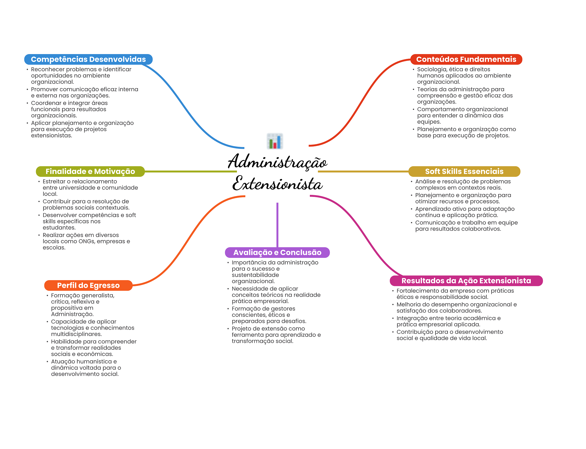 Competências Desenvolvidas Conteúdos Fundamentais Reconhecer problemas e identificar Sociologia, ética e direitos oportunidades no ambiente humanos aplicados ao ambiente organizacional. organizacional. Promover comunicação eficaz interna Teorias da administração para e externa nas organizações. compreensão e gestão eficaz das Coordenar e integrar áreas organizações. funcionais para resultados Comportamento organizacional organizacionais. para entender a dinâmica das Aplicar planejamento e organização equipes. para execução de projetos Planejamento e organização como extensionistas. base para execução de projetos. Administração Finalidade e Motivação Soft Skills Essenciais Estreitar relacionamento Extensionista Análise e resolução de problemas entre universidade e comunidade complexos em contextos reais. local. Planejamento e organização para Contribuir para a resolução de otimizar recursos e processos. problemas sociais contextuais. Aprendizado ativo para adaptação Desenvolver competências e soft contínua e aplicação prática. skills específicas nos Comunicação e trabalho em equipe estudantes. para resultados colaborativos. Realizar ações em diversos locais como ONGs, empresas e escolas. Avaliação e Conclusão Importância da administração para sucesso e sustentabilidade organizacional. Resultados da Ação Extensionista Perfil do Egresso Necessidade de aplicar Fortalecimento da empresa com práticas Formação generalista, conceitos teóricos na realidade éticas e responsabilidade social. crítica, reflexiva e prática empresarial. Melhoria do desempenho organizacional e propositiva em Formação de gestores satisfação dos colaboradores. Administração. conscientes, éticos e Capacidade de aplicar preparados para desafios. Integração entre teoria acadêmica e tecnologias e conhecimentos prática empresarial aplicada. Projeto de extensão como multidisciplinares. ferramenta para aprendizado e Contribuição para desenvolvimento Habilidade para compreender transformação social. social e qualidade de vida local. e transformar realidades sociais e econômicas. Atuação humanística e dinâmica voltada para desenvolvimento social.