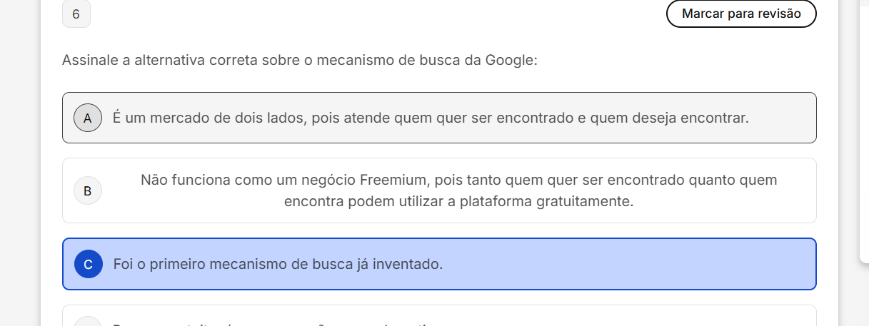 6 Marcar para revisão Assinale a alternativa correta sobre mecanismo de busca da Google: A É um mercado de dois lados, pois atende quem quer ser encontrado e quem deseja encontrar. Não funciona como um negócio Freemium, pois tanto quem quer ser encontrado quanto quem B encontra podem utilizar a plataforma gratuitamente. Foi primeiro mecanismo de busca já inventado.