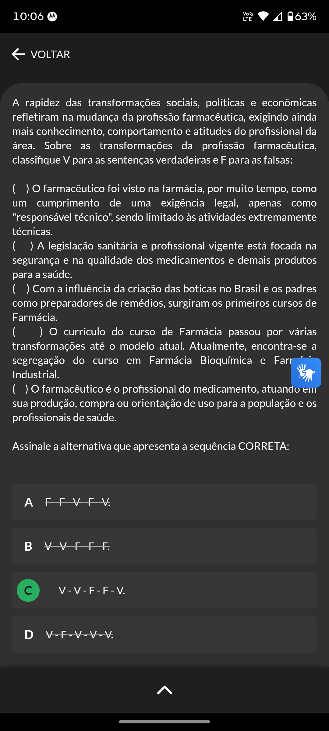 10:06 LTE 63% VOLTAR A rapidez das transformações sociais, políticas e econômicas refletiram na mudança da profissão farmacêutica, exigindo ainda mais conhecimento, comportamento e atitudes do profissional da área. Sobre as transformações da profissão farmacêutica, classifique V para as sentenças verdadeiras e F para as falsas: farmacêutico foi visto na farmácia, por muito tempo, como um cumprimento de uma exigência legal, apenas como "responsável técnico", sendo limitado às atividades extremamente técnicas. ( ) A legislação sanitária e profissional vigente está focada na segurança e na qualidade dos medicamentos e demais produtos para a saúde. Com a influência da criação das boticas no Brasil e os padres como preparadores de remédios, surgiram os primeiros cursos de Farmácia. ( ) currículo do curso de Farmácia passou por várias transformações até modelo atual. Atualmente, encontra-se a segregação do curso em Farmácia Bioquímica e Farr Industrial. ( ) farmacêutico é profissional do medicamento, atuando em sua produção, compra ou orientação de uso para a população e os profissionais de saúde. Assinale a alternativa que apresenta a sequência CORRETA: V-V-F-F-V. D V-F-V-V-V.