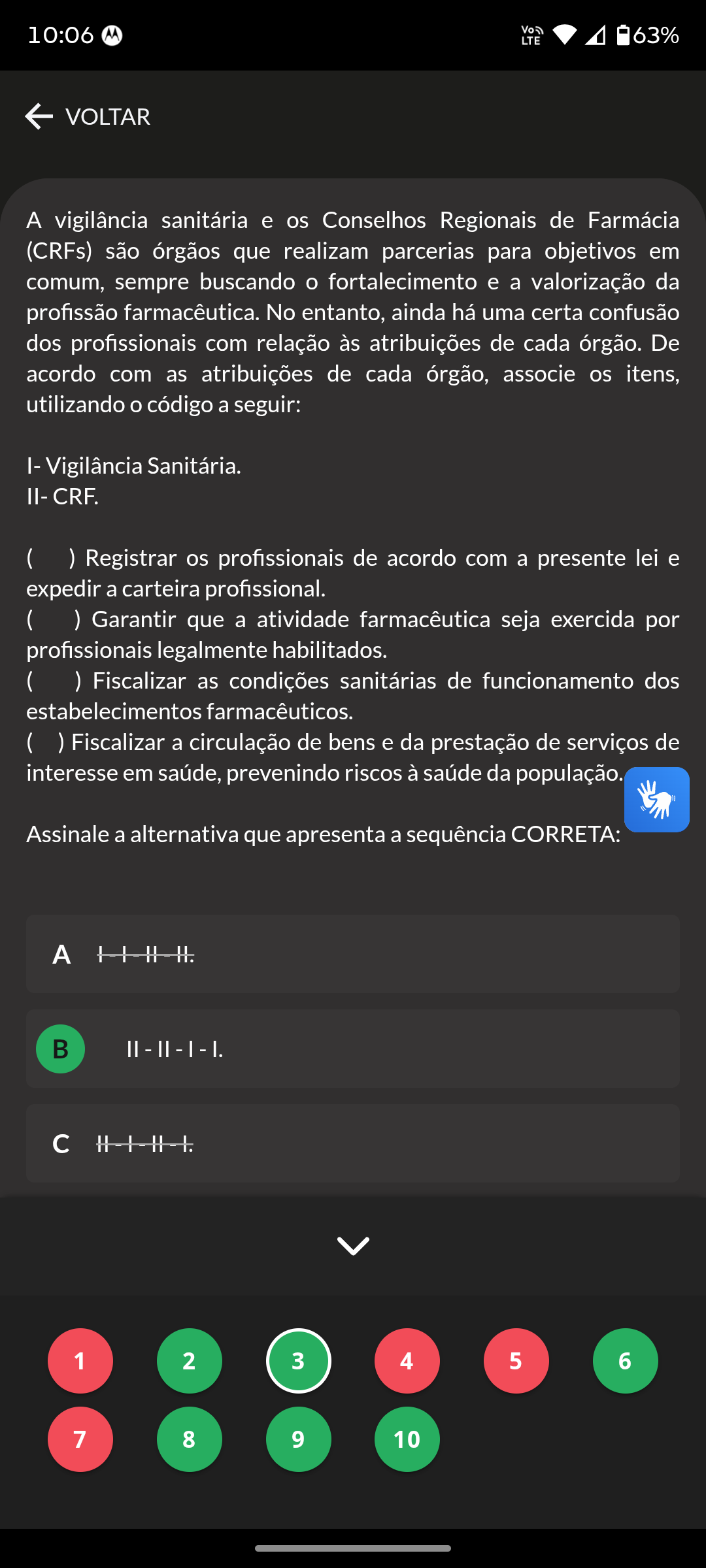 10:06 LTE 63% VOLTAR A vigilância sanitária e os Conselhos Regionais de Farmácia (CRFs) são órgãos que realizam parcerias para objetivos em comum, sempre buscando fortalecimento e a valorização da profissão farmacêutica. No entanto, ainda há uma certa confusão dos profissionais com relação às atribuições de cada órgão. De acordo com as atribuições de cada órgão, associe os itens, utilizando código a seguir: I- Vigilância Sanitária. II- CRF. ( ) Registrar os profissionais de acordo com a presente lei e expedir a carteira profissional. ( ) Garantir que a atividade farmacêutica seja exercida por profissionais legalmente habilitados. ( ) Fiscalizar as condições sanitárias de funcionamento dos estabelecimentos farmacêuticos. Fiscalizar a circulação de bens e da prestação de serviços de interesse em saúde, prevenindo riscos à saúde da população. Assinale a alternativa que apresenta a sequência CORRETA: c 1 2 3 4 5 6 7 8 9 10