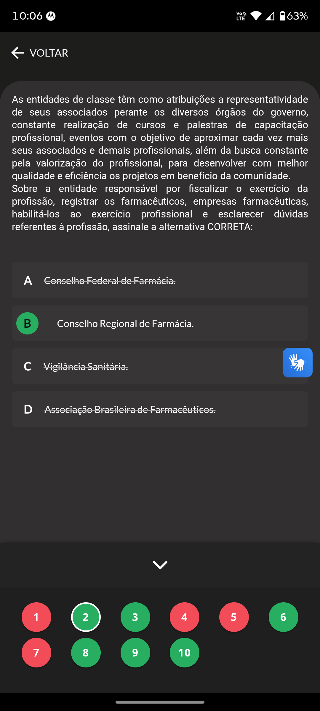 10:06 LTE 63% VOLTAR As entidades de classe têm como atribuições a representatividade de seus associados perante os diversos órgãos do governo, constante realização de cursos e palestras de capacitação profissional, eventos com o objetivo de aproximar cada vez mais seus associados e demais profissionais, além da busca constante pela valorização do profissional, para desenvolver com melhor qualidade e eficiência os projetos em benefício da comunidade. Sobre a entidade responsável por fiscalizar exercício da profissão, registrar os farmacêuticos, empresas farmacêuticas, habilitá-los ao exercício profissional e esclarecer dúvidas referentes à profissão, assinale a alternativa CORRETA: Conselho Federal de Farmácia. Conselho Regional de Farmácia. c Vigilância Sanitária. D Associação Brasileira de Farmacêuticos. 1 2 3 4 5 6 7 8 9 10