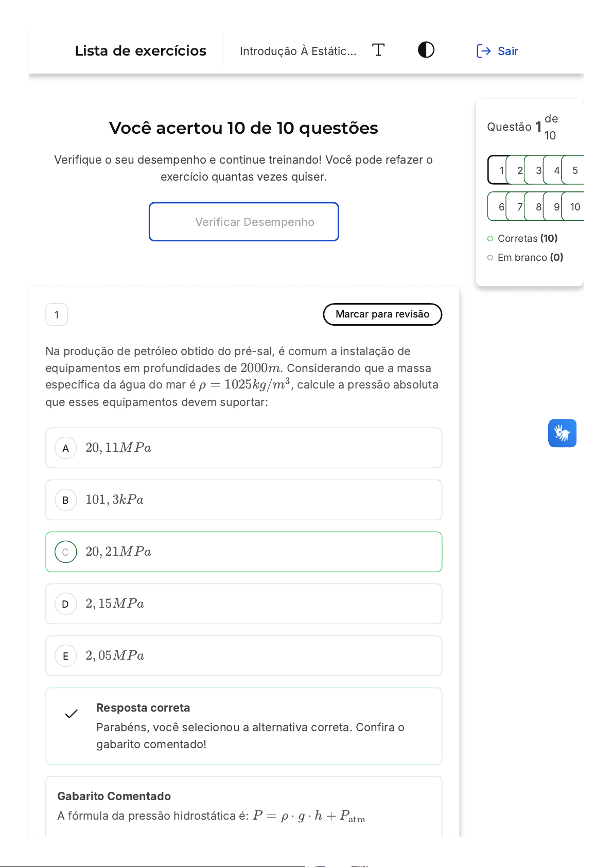 10/03/26, 23:51 estacio.saladeavaliacoes.com.br/exercicio/69b0d7f7f748ecd484466489/gabarito/ https://estacio.saladeavaliacoes.com.br/exercicio/69b0d7f7f748ecd484466489/gabarito/ 1/10 Você acertou 10 de 10 questões Verifique o seu desempenho e continue treinando! Você pode refazer o exercício quantas vezes quiser. Verificar Desempenho A B C D E 1 Marcar para revisão Na produção de petróleo obtido do pré-sal, é comum a instalação de equipamentos em profundidades de . Considerando que a massa específica da água do mar é , calcule a pressão absoluta que esses equipamentos devem suportar: 2000m ρ = 1025kg/m3 20, 11MPa 101, 3kPa 20, 21MPa 2, 15MPa 2, 05MPa Resposta correta Parabéns, você selecionou a alternativa correta. Confira o gabarito comentado! Gabarito Comentado A fórmula da pressão hidrostática é: P = ρ ⋅ g ⋅ h + Patm Questão 1 de 10 Corretas �10� Em branco �0� 1 2 3 4 5 6 7 8 9 10 Lista de exercícios Introdução À Estátic… Sair 10/03/26, 23:51 estacio.saladeavaliacoes.com.br/exercicio/69b0d7f7f748ecd484466489/gabarito/ https://estacio.saladeavaliacoes.com.br/exercicio/69b0d7f7f748ecd484466489/gabarito/ 2/10 A B C D E onde: - é a pressão absoluta. - é a densidade da água do mar �1025 kg/m³). - g é a aceleração da gravidade (aproximadamente 9,81 m/s ). - h é a profundidade �2000m�. - é a pressão atmosférica ao nível do mar (aproximadamente 101,3kPa ou 0,1013MPa). P ρ 2 Patm P = 1025 ⋅ 9, 81 ⋅ 2000 + 101300 Pa P = 20110500 Pa + 101300 Pa P = 20211800 Pa = 20, 21 MPa 2 Marcar para revisão Cada unidade, seja ela para densidade, pressão, viscosidade ou valores adimensionais, tem um papel crucial na precisão e clareza dos cálculos e análises técnicas em ciência e engenharia. Qual é a unidade de densidade? kg/m3 kN/m2 Pa Pa.s Adimensional Resposta correta Parabéns, você selecionou a alternativa correta. Confira o gabarito comentado! Gabarito Comentado 10/03/26, 23:51 estacio.saladeavaliacoes.com.br/exercicio/69b0d7f7f748ecd484466489/gabarito/ https://estacio.saladeavaliacoes.com.br/exercicio/69b0d7f7f748ecd484466489/gabarito/ 3/10 A B C D E A unidade de densidade é tipicamente expressa em quilogramas por metro cúbico kg/m . Isso representa a massa de substância por unidade de volume. 3 3 Marcar para revisão A Figura a seguir ilustra um recipiente cilíndrico totalmente fechado, contendo gás e óleo. , e são pontos no interior do recipiente, estando em seu tampo, em sua base e na interface gás-óleo. As densidades do óleo e do gás valem, respectivamente, e . Sabendo que a pressão no ponto vale e que a gravidade local vale , conclui-se que a pressão no ponto , em , vale: A B C A C B 0, 8g/cm3 0, 01g/cm3 A 6kPa 10m/s2 C kPa 4,0. 6,0. 6,4. 10,0. 10,4. Resposta correta 10/03/26, 23:51 estacio.saladeavaliacoes.com.br/exercicio/69b0d7f7f748ecd484466489/gabarito/ https://estacio.saladeavaliacoes.com.br/exercicio/69b0d7f7f748ecd484466489/gabarito/ 4/10 A B C D E Parabéns, você selecionou a alternativa correta. Confira o gabarito comentado! Gabarito Comentado A resposta correta é: 10,4 Para calcular a pressão no ponto C, precisamos calcular a pressão no ponto B� PB = PA + ρgás × g × hgás PB = 6kPa + 10 × 10 × 4 = 6kPA + 0, 4kPa = 6, 4KPa PC = PB + ρóleo × g × hóleo PB = 6, 4kPa + 800 × 10 × 0, 5 = 6, 4kPa + 4kPa = 10, 4KPa 4 Marcar para revisão Para determinado fluido com peso específico de , uma diferença de pressão de corresponde a uma altura de carga, em metros, de: 12.000N/m3 4.800Pa 0,4 2,5 5,8 8,2 12,0 Resposta correta Parabéns, você selecionou a alternativa correta. Confira o gabarito comentado! Gabarito Comentado 10/03/26, 23:51 estacio.saladeavaliacoes.com.br/exercicio/69b0d7f7f748ecd484466489/gabarito/ https://estacio.saladeavaliacoes.com.br/exercicio/69b0d7f7f748ecd484466489/gabarito/ 5/10 A B C D E A resposta correta é: 0,4 5 Marcar para revisão Entre os corpos da Figura a seguir, qual corresponde a uma situação estável, instável e indiferente, respectivamente? A, B e C B, C e A C, A e B C, B e A A, C e B Resposta correta Parabéns, você selecionou a alternativa correta. Confira o gabarito comentado! Gabarito Comentado A resposta correta é: A, C e B 6 Marcar para revisão 10/03/26, 23:51 estacio.saladeavaliacoes.com.br/exercicio/69b0d7f7f748ecd484466489/gabarito/ https://estacio.saladeavaliacoes.com.br/exercicio/69b0d7f7f748ecd484466489/gabarito/ 6/10 A B C D E A B Qual é o adimensional utilizado tanto para análise de escoamento em canais quanto ao redor de cascos de navios? Froude Euler Coeficiente de arrasto Mach Biot Resposta correta Parabéns, você selecionou a alternativa correta. Confira o gabarito comentado! Gabarito Comentado O número adimensional Froude é utilizado tanto para análise de escoamento em canais quanto ao redor de cascos de navios. Ele é definido como a razão entre a força inercial e a força gravitacional. Este número é muito importante na análise de escoamentos onde a gravidade tem um papel significativo, como é o caso do escoamento em canais e ao redor de cascos de navios. 7 Marcar para revisão Fora d'água, a massa de um objeto é de e, dentro d'água, . Qual é a massa específica desse material? 50, 0kg 30, 0kg 0, 02kg/m3 0, 01kg/m3 10/03/26, 23:51 estacio.saladeavaliacoes.com.br/exercicio/69b0d7f7f748ecd484466489/gabarito/ https://estacio.saladeavaliacoes.com.br/exercicio/69b0d7f7f748ecd484466489/gabarito/ 7/10 C D E A B C D E 0, 03kg/m3 0, 05kg/m3 0, 08kg/m3 Resposta correta Parabéns, você selecionou a alternativa correta. Confira o gabarito comentado! Gabarito Comentado A massa específica é a razão entre a massa e o volume. No caso, a massa é de e o volume é de . Portanto, a massa específica é de . 50, 0kg 50, 0 − 30, 0 = 20, 0kg 0, 02kg/m3 8 Marcar para revisão Se a massa específica do gelo é e da água do mar é , qual é a porcentagem do volume de um iceberg que fica emersa (acima do nível d'água)? 920kg/m3 