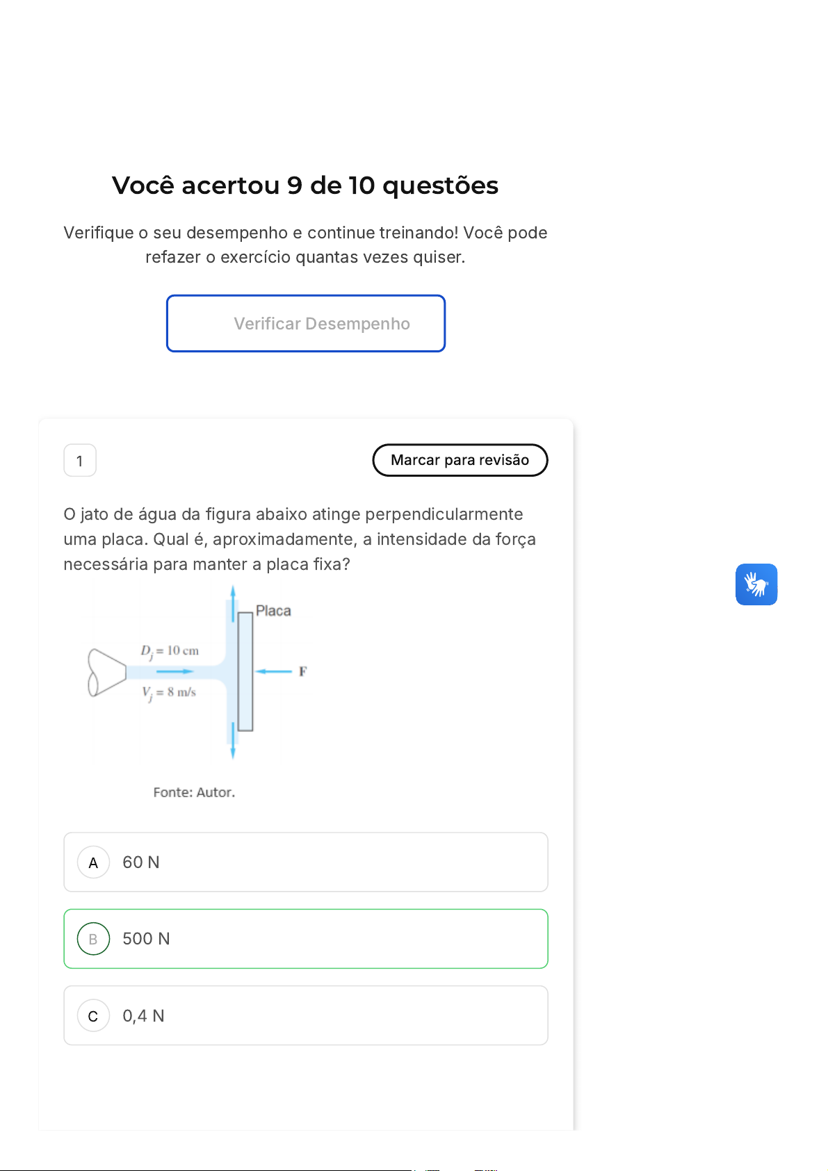 10/03/26, 23:56 estacio.saladeavaliacoes.com.br/exercicio/69b0d8e2518f1df35dddf74e/gabarito/ https://estacio.saladeavaliacoes.com.br/exercicio/69b0d8e2518f1df35dddf74e/gabarito/ 1/13 Você acertou 9 de 10 questões Verifique o seu desempenho e continue treinando! Você pode refazer o exercício quantas vezes quiser. Verificar Desempenho A B C 1 Marcar para revisão O jato de água da figura abaixo atinge perpendicularmente uma placa. Qual é, aproximadamente, a intensidade da força necessária para manter a placa fixa? 60 N 500 N 0,4 N 10/03/26, 23:56 estacio.saladeavaliacoes.com.br/exercicio/69b0d8e2518f1df35dddf74e/gabarito/ https://estacio.saladeavaliacoes.com.br/exercicio/69b0d8e2518f1df35dddf74e/gabarito/ 2/13 D E 64.000 N 100 N Resposta correta Parabéns, você selecionou a alternativa correta. Confira o gabarito comentado! Gabarito Comentado A resposta correta é: 500 N 2 Marcar para revisão Uma ducha de chuveiro esguicha água através de 50 furos com diâmetro de . Ela é alimentada através de uma mangueira com vazão de . Calcule a velocidade média de saída, em , considerando que ela é a mesma em todos os furos. 0, 8mm 0, 15L/s m/s 10/03/26, 23:56 estacio.saladeavaliacoes.com.br/exercicio/69b0d8e2518f1df35dddf74e/gabarito/ https://estacio.saladeavaliacoes.com.br/exercicio/69b0d8e2518f1df35dddf74e/gabarito/ 3/13 A B C D E 2 300 10 6 1 Resposta correta Parabéns, você selecionou a alternativa correta. Confira o gabarito comentado! Gabarito Comentado Para resolver essa questão, precisamos entender que a velocidade média de saída da água é a vazão dividida pela área total dos furos. A vazão é dada em litros por segundo �L/s�, que podemos converter para metros cúbicos por segundo (m³/s) dividindo por 1000. A área de cada furo é dada pela fórmula da área do círculo (πr²), onde o raio é a metade do diâmetro. Como temos 50 furos, a área total é 50 vezes a área de um furo. Ao dividir a vazão pela área total, obtemos a velocidade média de saída da água. Realizando esses cálculos, encontramos que a velocidade média é aproximadamente 6 m/s. 3 Marcar para revisão Um fluido ideal, sem viscosidade e incompressível, escoa por um tubo horizontal de seção quadrada de lado .L1 = 2, 0cm 10/03/26, 23:56 estacio.saladeavaliacoes.com.br/exercicio/69b0d8e2518f1df35dddf74e/gabarito/ https://estacio.saladeavaliacoes.com.br/exercicio/69b0d8e2518f1df35dddf74e/gabarito/ 4/13 A B C D E Esse tubo, a partir de certo ponto, se expande de modo a ter o lado . Sabendo que a vazão do tubo é de , a variação da pressão , em , é de: Dado: densidade do fluido L2 = 6, 0cm 3, 6litros/s ΔP = P2 − P1 kPa ρ = 1, 0 × 103kg/m3 400 40 4,0 0,40 0,040 Resposta correta Parabéns, você selecionou a alternativa correta. Confira o gabarito comentado! Gabarito Comentado A questão envolve o princípio de Bernoulli para fluidos ideais, que afirma que a soma da energia cinética, da energia potencial gravitacional e da energia de pressão é constante ao longo de uma linha de fluxo. No caso de um tubo horizontal, a energia potencial gravitacional é a mesma em todos os pontos, portanto, a variação de pressão é determinada pela variação da energia cinética. Como a seção do tubo se expande, a velocidade do fluido diminui, portanto, a energia cinética diminui e a pressão aumenta. A variação de pressão pode ser calculada a partir da vazão e da densidade do fluido, resultando em 40 kPa. 10/03/26, 23:56 estacio.saladeavaliacoes.com.br/exercicio/69b0d8e2518f1df35dddf74e/gabarito/ https://estacio.saladeavaliacoes.com.br/exercicio/69b0d8e2518f1df35dddf74e/gabarito/ 5/13 A B C D E 4 Marcar para revisão Água à flui em regime permanente por um tanque fechado, conforme figura abaixo. Na seção 1, e a vazão volumétrica é . Na seção 2, e a velocidade média é . Se , calcule a vazão volumétrica em e a velocidade média em . 20°C D1 = 6, 0cm 100m3/h D2 = 5, 0cm 8, 0m/s D3 = 4, 0cm Q3 m3/h V3 m/s 9,6 20,0 8,0 4,0 1,0 Resposta correta Parabéns, você selecionou a alternativa correta. Confira o gabarito comentado! Questão 5 de 10 Corretas �9� Incorretas �1� Em branco �0� 1 2 3 4 5 6 7 8 9 10 Lista de exercícios Dinâmica D… Sair 10/03/26, 23:56 estacio.saladeavaliacoes.com.br/exercicio/69b0d8e2518f1df35dddf74e/gabarito/ https://estacio.saladeavaliacoes.com.br/exercicio/69b0d8e2518f1df35dddf74e/gabarito/ 6/13 A B C D E Gabarito Comentado A resposta correta é: 9,6 5 Marcar para revisão A figura abaixo ilustra uma curva que inverte o sentido de jato de água. Considerando que o diâmetro do jato permanece o mesmo, encontre uma expressão para a velocidade máxima se a força máxima que o suporte resiste é .V0 F0 √1 D0 F0 ρ0 √2 D0 F0 ρ0π √ F0 ρ0π √1 D0 F0 ρ0π √1 D0 2F0 ρ0π Resposta incorreta Opa! A alternativa correta é a letra E. Confira o gabarito comentado! 10/03/26, 23:56 estacio.saladeavaliacoes.com.br/exercicio/69b0d8e2518f1df35dddf74e/gabarito/ https://estacio.saladeavaliacoes.com.br/exercicio/69b0d8e2518f1df35dddf74e/gabarito/ 7/13 A B Gabarito Comentado A resposta correta é: √1 D0 2F0 ρ0π 6 Marcar para revisão Qual é a potência máxima, em kW, que um agricultor pode obter instalando uma turbina hidráulica num pequeno rio que passa na sua propriedade e tem vazão de 100 L/s e altura de queda de 2m? Considere que a velocidade a montante e a jusante (antes e após) da turbina é igual e despreze toda as perdas. 2 1 10/03/26, 23:56 estacio.saladeavaliacoes.com.br/exercicio/69b0d8e2518f1df35dddf74e/gabarito/ https://estacio.saladeavaliacoes.com.br/exercicio/69b0d8e2518f1df35dddf74e/gabarito/ 8/13 C D E 1960 0,19 5 Resposta correta Parabéns, você selecionou a alternativa correta. Confira o gabarito comentado! Gabarito Comentado A potência máxima obtida em KW pela turbina hidráulica depende do trabalho realizado em uma unidade de segundo. P � T/Δt Onde, * P = potência máxima * T = trabalho realizado * Δt = inter