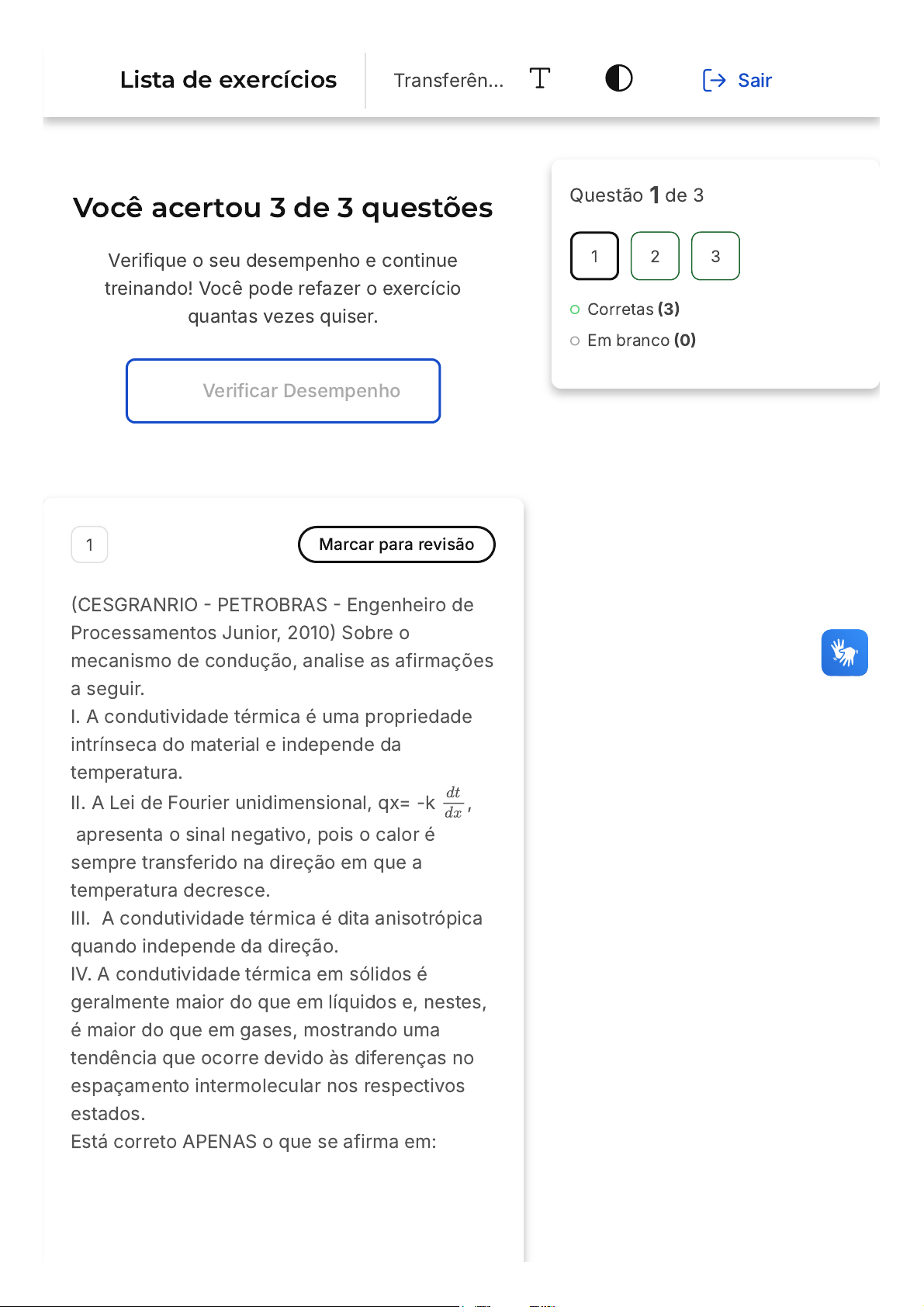 11/03/26, 00:00 estacio.saladeavaliacoes.com.br/exercicio/69b0daa2518f1df35dde16a2/gabarito/ https://estacio.saladeavaliacoes.com.br/exercicio/69b0daa2518f1df35dde16a2/gabarito/ 1/5 Você acertou 3 de 3 questões Verifique o seu desempenho e continue treinando! Você pode refazer o exercício quantas vezes quiser. Verificar Desempenho 1 Marcar para revisão �CESGRANRIO � PETROBRAS � Engenheiro de Processamentos Junior, 2010� Sobre o mecanismo de condução, analise as afirmações a seguir. I. A condutividade térmica é uma propriedade intrínseca do material e independe da temperatura. II. A Lei de Fourier unidimensional, qx= -k , apresenta o sinal negativo, pois o calor é sempre transferido na direção em que a temperatura decresce. III. A condutividade térmica é dita anisotrópica quando independe da direção. IV. A condutividade térmica em sólidos é geralmente maior do que em líquidos e, nestes, é maior do que em gases, mostrando uma tendência que ocorre devido às diferenças no espaçamento intermolecular nos respectivos estados. Está correto APENAS o que se afirma em: dt dx Questão 1 de 3 Corretas �3� Em branco �0� 1 2 3 Lista de exercícios Transferên… Sair 11/03/26, 00:00 estacio.saladeavaliacoes.com.br/exercicio/69b0daa2518f1df35dde16a2/gabarito/ https://estacio.saladeavaliacoes.com.br/exercicio/69b0daa2518f1df35dde16a2/gabarito/ 2/5 A B C D E I e II II e IV III e IV I, III e IV II, III e IV Resposta correta Parabéns, você selecionou a alternativa correta. Confira o gabarito comentado! Gabarito Comentado A resposta certa é:II e IV. A afirmação I está errada porque a condutividade térmica depende da temperatura. A afirmação III está errada porque a condutividade térmica é dita anisotrópica quando depende da direção. 2 Marcar para revisão Qual a quantidade máxima de calor retirado de um ambiente por um ar-condicionado de 12000 BTU/h ao longo de um dia de funcionamento? Dado: 1 BTU � 1,06 kJ. 11/03/26, 00:00 estacio.saladeavaliacoes.com.br/exercicio/69b0daa2518f1df35dde16a2/gabarito/ https://estacio.saladeavaliacoes.com.br/exercicio/69b0daa2518f1df35dde16a2/gabarito/ 3/5 A B C D E 12.720 kJ 305.000 kJ 288.000 kJ 76.320 kJ 1.100.000 kJ Resposta correta Parabéns, você selecionou a alternativa correta. Confira o gabarito comentado! Gabarito Comentado Para resolver essa questão, é necessário converter a capacidade do ar- condicionado de BTU/h para kJ/h, utilizando a informação fornecida de que 1 BTU é igual a 1,06 kJ. Assim, um ar- condicionado de 12000 BTU/h tem uma capacidade de 12720 kJ/h. Como um dia tem 24 horas, a quantidade máxima de calor que pode ser retirada em um dia é de 12720 kJ/h * 24 h = 305.000 kJ. 3 Marcar para revisão �CESGRANRIO � PETROBRAS � Engenheiro de Equipamento Júnior, 2012� Duas placas quadradas, de lado L�20 cm, de materiais 11/03/26, 00:00 estacio.saladeavaliacoes.com.br/exercicio/69b0daa2518f1df35dde16a2/gabarito/ https://estacio.saladeavaliacoes.com.br/exercicio/69b0daa2518f1df35dde16a2/gabarito/ 4/5 A B C D E distintos e espessuras idênticas d = d = 5,0 cm, estão coladas como na figura apresentada a seguir. As condutividades térmicas são k1 � 10 W/(m.K) e K = 100 W/(m.K), e as temperaturas nas extremidades livres são T = 630 K (na placa 1) e = 300 K (na placa 2�. A temperatura de equilíbrio T da interface entre materiais, em K, é: 1 2 2 1 T2 465 630 330 600 300 Resposta correta Parabéns, você selecionou a alternativa correta. Confira o gabarito comentado! Gabarito Comentado A resposta certa é:600 11/03/26, 00:00 estacio.saladeavaliacoes.com.br/exercicio/69b0daa2518f1df35dde16a2/gabarito/ https://estacio.saladeavaliacoes.com.br/exercicio/69b0daa2518f1df35dde16a2/gabarito/ 5/5