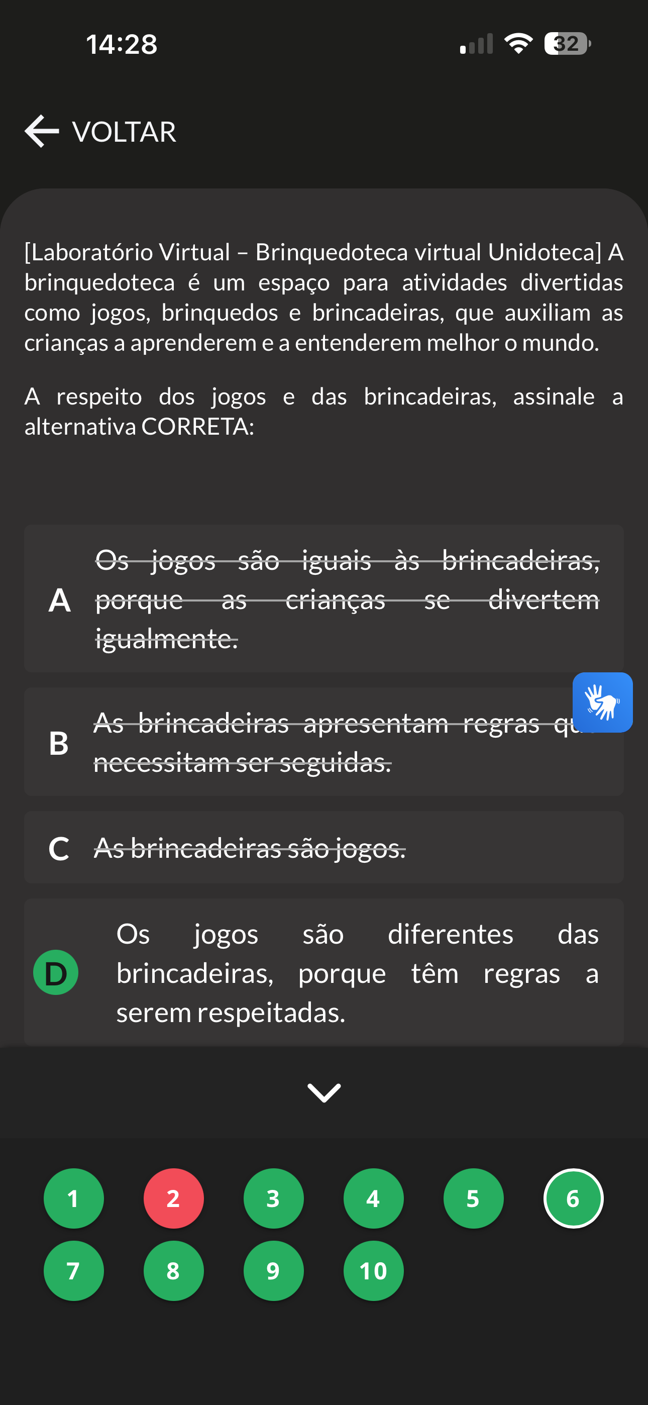 14:28 32 VOLTAR [Laboratório Virtual - Brinquedoteca virtual Unidoteca] A brinquedoteca é um espaço para atividades divertidas como jogos, brinquedos e brincadeiras, que auxiliam as crianças a aprenderem e a entenderem melhor mundo. A respeito dos jogos e das brincadeiras, assinale a alternativa CORRETA: Os jogos são iguais às brincadeiras, A porque as crianças se divertem igualmente. As brincadeiras apresentam regras qu B necessitam ser seguidas. As brincadeiras são jogos. Os jogos são diferentes das D brincadeiras, porque têm regras a serem respeitadas. 1 2 3 4 5 6 7 8 9 10