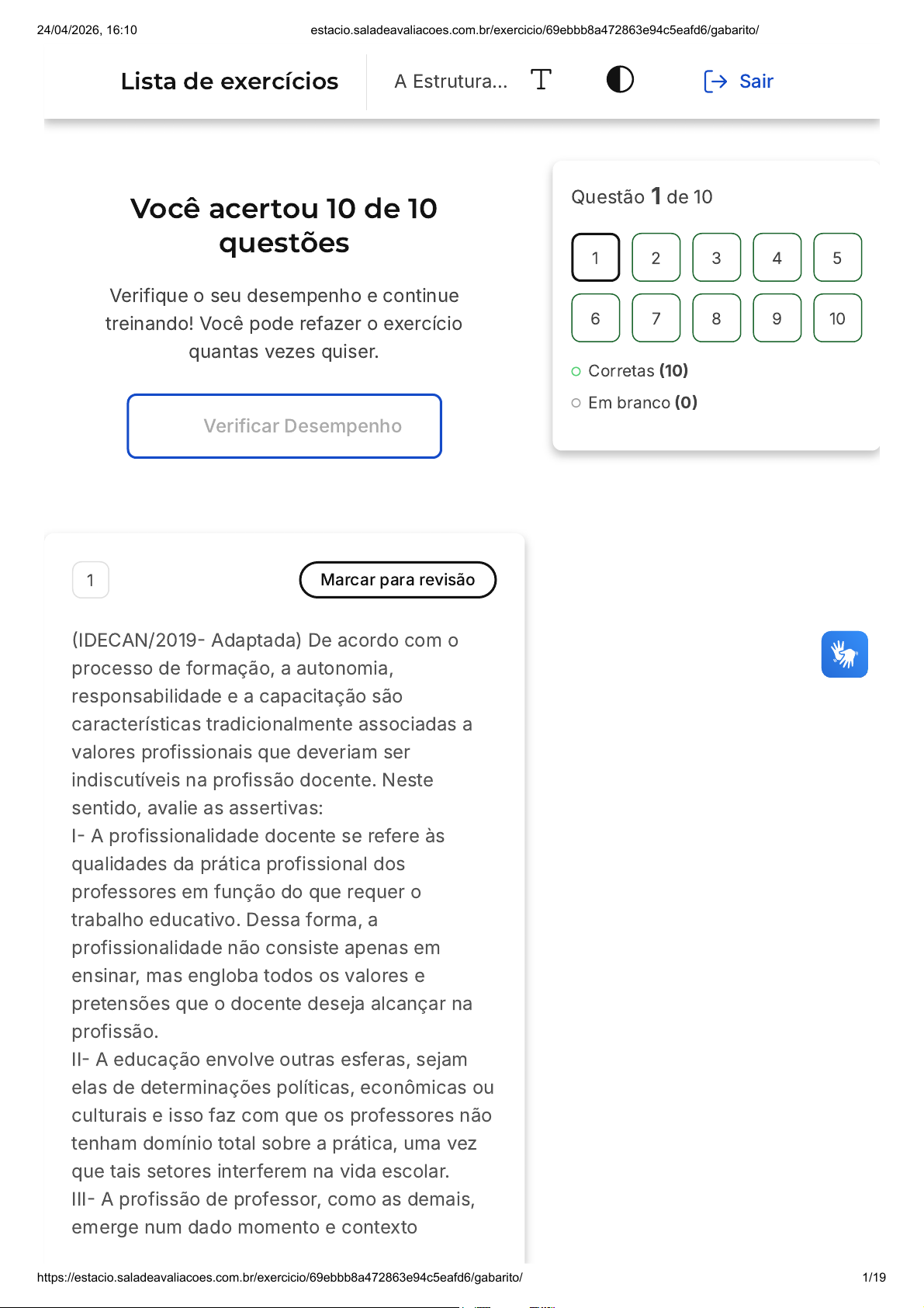 Você acertou 10 de 10 questões Verifique o seu desempenho e continue treinando! Você pode refazer o exercício quantas vezes quiser. Verificar Desempenho 1 Marcar para revisão (IDECAN/2019- Adaptada) De acordo com o processo de formação, a autonomia, responsabilidade e a capacitação são características tradicionalmente associadas a valores profissionais que deveriam ser indiscutíveis na profissão docente. Neste sentido, avalie as assertivas: I- A profissionalidade docente se refere às qualidades da prática profissional dos professores em função do que requer o trabalho educativo. Dessa forma, a profissionalidade não consiste apenas em ensinar, mas engloba todos os valores e pretensões que o docente deseja alcançar na profissão. II- A educação envolve outras esferas, sejam elas de determinações políticas, econômicas ou culturais e isso faz com que os professores não tenham domínio total sobre a prática, uma vez que tais setores interferem na vida escolar. III- A profissão de professor, como as demais, emerge num dado momento e contexto Questão 1 de 10 Corretas (10) Em branco (0) 1 2 3 4 5 6 7 8 9 10 Lista de exercícios A Estrutura… Sair 24/04/2026, 16:10 estacio.saladeavaliacoes.com.br/exercicio/69ebbb8a472863e94c5eafd6/gabarito/ https://estacio.saladeavaliacoes.com.br/exercicio/69ebbb8a472863e94c5eafd6/gabarito/ 1/19 A B C D E histórico como resposta às necessidades que foram postas pelas sociedades, adquirindo estatuto próprio e legalidade. IV- No caso da educação escolar, constata-se que no mundo contemporâneo o crescimento quantitativo dos sistemas de ensino tem correspondido a um resultado formativo (qualitativo) adequado às exigências da população envolvida, e às exigências das demandas sociais, passando a exigir uma nova identidade profissional do professor. Marque a alternativa correta: Somente I e II estão corretas Somente II e III estão corretas Somente I está correta Somente I e IV estão corretas Somente IV está correta Resposta correta Parabéns, você selecionou a alternativa correta. Confira o gabarito comentado! Gabarito Comentado A alternativa correta é a E, que afirma que somente a assertiva IV está correta. Esta assertiva destaca que o crescimento quantitativo dos sistemas de ensino no mundo contemporâneo tem correspondido a um resultado formativo (qualitativo) adequado às exigências da população 24/04/2026, 16:10 estacio.saladeavaliacoes.com.br/exercicio/69ebbb8a472863e94c5eafd6/gabarito/ https://estacio.saladeavaliacoes.com.br/exercicio/69ebbb8a472863e94c5eafd6/gabarito/ 2/19 envolvida e às demandas sociais. Isso implica na necessidade de uma nova identidade profissional do professor, que deve estar preparado para atender a essas demandas e expectativas. A autonomia, responsabilidade e capacitação são características essenciais para que o professor possa desempenhar seu papel de forma eficaz neste contexto. 2 Marcar para revisão (Prefeitura de Peruíbe /SP - 2019) Leia as definições propostas por Lück (2013), em sua obra Gestão da cultura e do clima organizacional da escola: Definição 1 - Conjunto de crenças, valores, opiniões, percepções da realidade em suas diversas expressões, que se manifesta no modo de ser e de fazer da escola e que traduz sua personalidade. Representa o que a escola realmente é, pelo que realmente faz. Definição 2 - Conjunto de princípios filosófico- sociológico-pedagógicos delineados fora da escola para realizar objetivos educacionais traçados pela sociedade e processos educacionais planejados por profissionais da Educação no âmbito de sistemas de ensino e dos órgãos de legislação educacional. LUCK, Heloisa. A gestão participativa na escola. Petrópolis: Vozes, 2013. As definições 1 e 2 referem-se, correta e respectivamente, a 24/04/2026, 16:10 estacio.saladeavaliacoes.com.br/exercicio/69ebbb8a472863e94c5eafd6/gabarito/ https://estacio.saladeavaliacoes.com.br/exercicio/69ebbb8a472863e94c5eafd6/gabarito/ 3/19 A B C D E Cultura educacional; Clima organizacional. Parâmetros escolares; Parâmetros educacionais. Cultura organizacional; Cultura educacional. Cultura organizacional; Estrutura pedagógica. Clima organizacional; Currículo. Resposta correta Parabéns, você selecionou a alternativa correta. Confira o gabarito comentado! Gabarito Comentado A definição 1 refere-se à cultura organizacional, pois aborda o conjunto de crenças, valores, opiniões e percepções que se manifestam no modo de ser e de fazer da escola, traduzindo sua personalidade. Já a definição 2 refere-se à cultura educacional, pois trata do conjunto de princípios filosófico-sociológico- pedagógicos delineados fora da escola para realizar objetivos educacionais traçados pela sociedade e processos educacionais planejados por profissionais da Educação. Portanto, a alternativa correta é a C: "Cultura organizacional; Cultura educacional". As demais 24/04/2026, 16:10 estacio.saladeavaliacoes.com.br/exercicio/69ebbb8a472863e94c5eafd6/gabarito/ https://estacio.saladeavaliacoes.com.br/exercicio/69ebbb8a472863e94c5eafd6/gabarito/ 4/19 A B alternativas não se aplicam corretamente às definições apresentadas por Lück. 3 Marcar para revisão (Prefeitura de Peruíbe/SP - 2019) Na escola, a participação tem sido evocada de muitas formas e circunstâncias. O mais comum no relato dos professores, sobre a participação em atividades extracurriculares e em reuniões, é que, ainda que apresentado o problema, a solução e a decisão são previamente indicadas por parte da direção ou outros da hierarquia superior. A partir das considerações de Lück (2010), em sua obra "A gestão participativa na escola", acerca do relatado, assinale a alternativa correta. Para que haja a efetiva participação dos professores é preciso que, nas reuniões, sua postura de escuta predomine em relação à da fala, a fim de que as decisões possam ser tomadas com maior segurança e clareza. Nas du