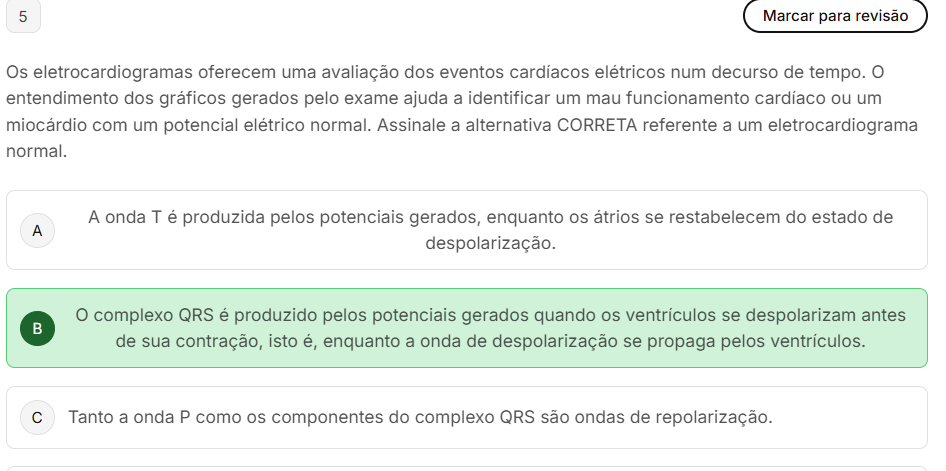 5 Marcar para revisão Os eletrocardiogramas oferecem uma avaliação dos eventos cardíacos elétricos num decurso de tempo. entendimento dos gráficos gerados pelo exame ajuda a identificar um mau funcionamento cardíaco ou um miocárdio com um potencial elétrico normal. Assinale a alternativa CORRETA referente a um eletrocardiograma normal. A onda T é produzida pelos potenciais gerados, enquanto átrios se restabelecem do estado de A despolarização. complexo QRS é produzido pelos potenciais gerados quando ventrículos se despolarizam antes de sua contração, isto é, enquanto a onda de despolarização se propaga pelos ventrículos. C Tanto a onda P como componentes do complexo QRS são ondas de repolarização.
