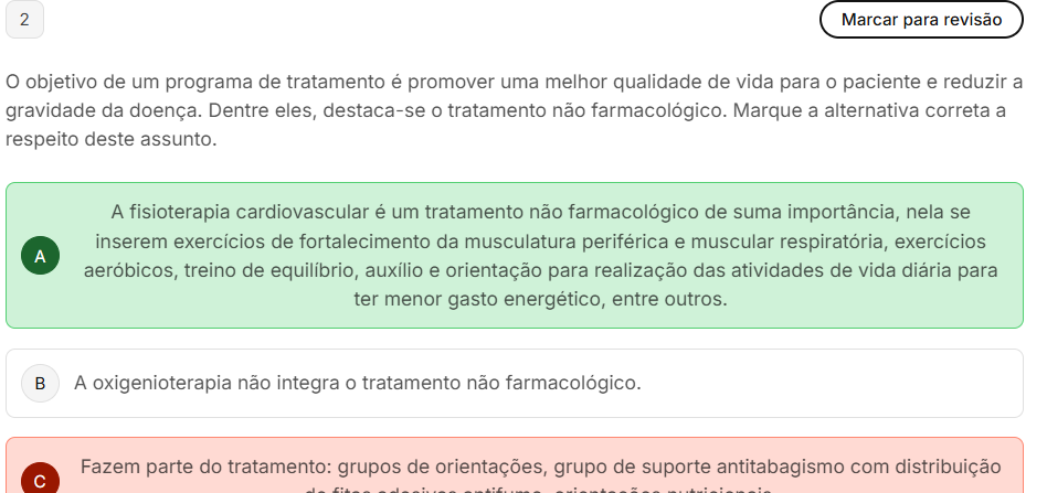 2 Marcar para revisão O objetivo de um programa de tratamento é promover uma melhor qualidade de vida para paciente e reduzir a gravidade da doença. Dentre eles, destaca-se O tratamento não farmacológico. Marque a alternativa correta a respeito deste assunto. A fisioterapia cardiovascular é um tratamento não farmacológico de suma importância, nela se inserem exercícios de fortalecimento da musculatura periférica e muscular respiratória, exercícios A aeróbicos, treino de equilíbrio, auxílio e orientação para realização das atividades de vida diária para ter menor gasto energético, entre outros. A oxigenioterapia não integra tratamento não farmacológico. Fazem parte do tratamento: grupos de orientações, grupo de suporte antitabagismo com distribuição