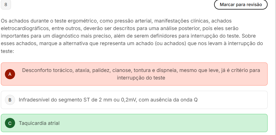 8 Marcar para revisão Os achados durante O teste ergométrico, como pressão arterial, manifestações clínicas, achados eletrocardiográficos, entre outros, deverão ser descritos para uma análise posterior, pois eles serão importantes para um diagnóstico mais preciso, além de serem definidores para interrupção do teste. Sobre esses achados, marque a alternativa que representa um achado (ou achados) que nos levam à interrupção do teste: Desconforto torácico, ataxia, palidez, cianose, tontura e dispneia, mesmo que leve, já é critério para A interrupção do teste B Infradesnível do segmento ST de 2 mm ou 0,2mV, com ausência da onda Q Taquicardia atrial