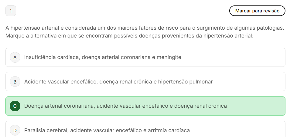 1 Marcar para revisão A hipertensão arterial é considerada um dos maiores fatores de risco para surgimento de algumas patologias. Marque a alternativa em que se encontram possíveis doenças provenientes da hipertensão arterial: A Insuficiência cardíaca, doença arterial coronariana e meningite B Acidente vascular encefálico, doença renal crônica e hipertensão pulmonar C Doença arterial coronariana, acidente vascular encefálico e doença renal crônica D Paralisia cerebral, acidente vascular encefálico e arritmia cardíaca