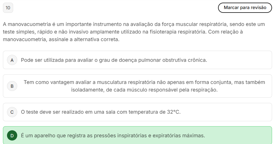 10 Marcar para revisão A manovacuometria é um importante instrumento na avaliação da força muscular respiratória, sendo este um teste simples, rápido e não invasivo amplamente utilizado na fisioterapia respiratória. Com relação à manovacuometria, assinale a alternativa correta. A Pode ser utilizada para avaliar grau de doença pulmonar obstrutiva crônica. Tem como vantagem avaliar a musculatura respiratória não apenas em forma conjunta, mas também isoladamente, de cada músculo responsável pela respiração. C O teste deve ser realizado em uma sala com temperatura de 32°C. D É um aparelho que registra as pressões inspiratórias e expiratórias máximas.