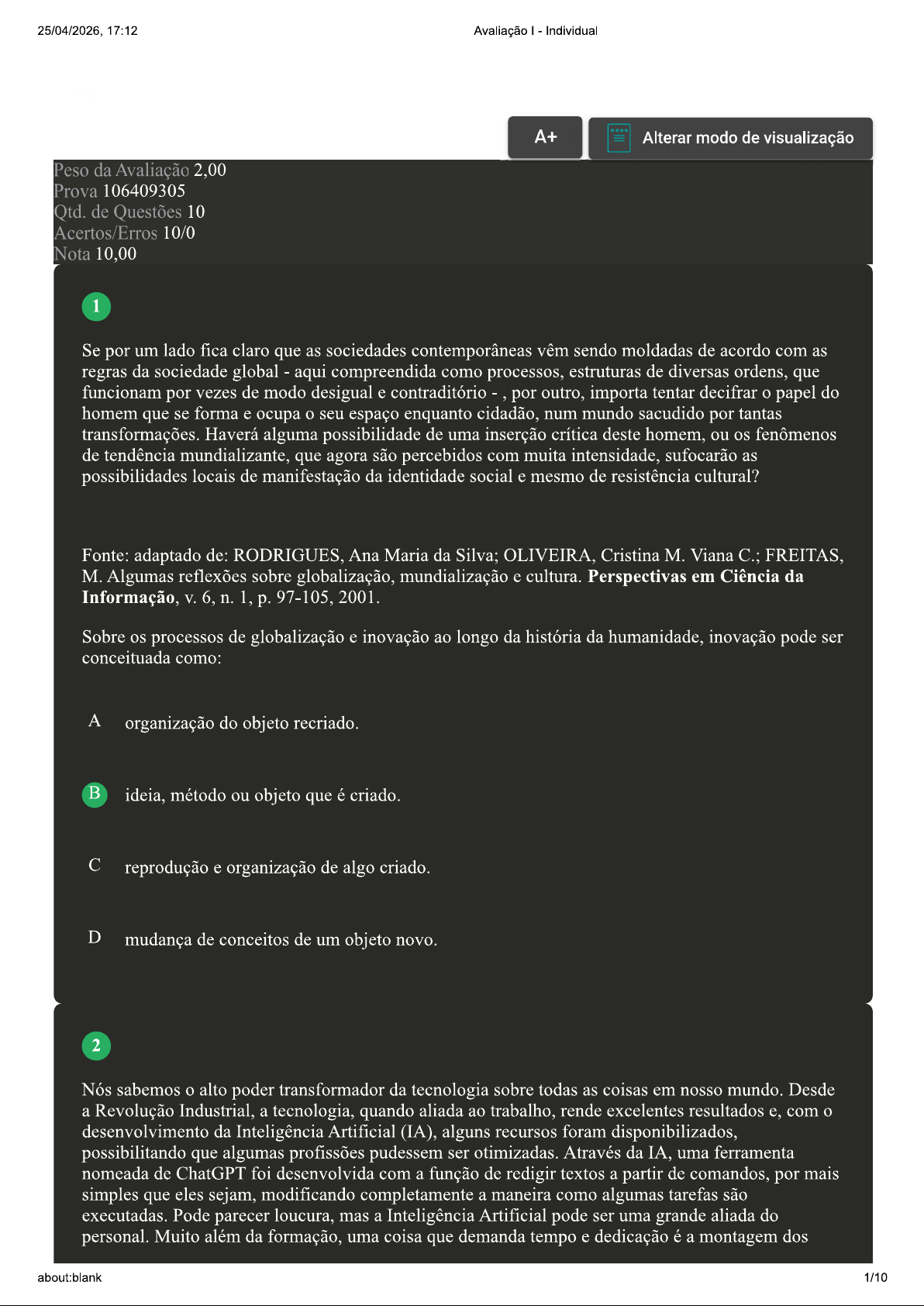 25/04/2026, 17:12 Avaliação I Individual A+ Alterar modo de visualização Peso da Avaliação 2,00 Prova 106409305 Qtd. de Questões 10 Acertos/Erros 10/0 Nota 10,00 1 Se por um lado fica claro que as sociedades contemporâneas vêm sendo moldadas de acordo com as regras da sociedade global aqui compreendida como processos, estruturas de diversas ordens, que funcionam por vezes de modo desigual e contraditório por outro, importa tentar decifrar o papel do homem que se forma e ocupa o seu espaço enquanto cidadão, num mundo sacudido por tantas transformações. Haverá alguma possibilidade de uma inserção crítica deste homem, ou os fenômenos de tendência mundializante, que agora são percebidos com muita intensidade, sufocarão as possibilidades locais de manifestação da identidade social e mesmo de resistência cultural? Fonte: adaptado de: RODRIGUES, Ana Maria da Silva; OLIVEIRA, Cristina M. Viana C.; FREITAS, M. Algumas reflexões sobre globalização, mundialização e cultura. Perspectivas em Ciência da Informação, V. 6, n. 1, 97-105, 2001. Sobre os processos de globalização e inovação ao longo da história da humanidade, inovação pode ser conceituada como: A organização do objeto recriado. ideia, método ou objeto que é criado. reprodução e organização de algo criado. D mudança de conceitos de um objeto novo. 2 Nós sabemos o alto poder transformador da tecnologia sobre todas as coisas em nosso mundo. Desde a Revolução Industrial, a tecnologia, quando aliada ao trabalho, rende excelentes resultados e, com o desenvolvimento da Inteligência Artificial (IA), alguns recursos foram disponibilizados, possibilitando que algumas profissões pudessem ser otimizadas. Através da IA, uma ferramenta nomeada de ChatGPT foi desenvolvida com a função de redigir textos a partir de comandos, por mais simples que eles sejam, modificando completamente a maneira como algumas tarefas são executadas. Pode parecer loucura, mas a Inteligência Artificial pode ser uma grande aliada do personal. Muito além da formação, uma coisa que demanda tempo e dedicação é a montagem dos about:blank 1/1025/04/2026, 17:12 Avaliação I Individual treinos de cada aluno, baseado nas necessidades de cada um e, agora, com o ChatGPT isso pode ser feito com muito mais praticidade. Mas, é claro, é imprescindível o acompanhamento do profissional. Fonte: 4 PROFISSÕES que serão transformadas pela Inteligência Artificial e para melhor! Rotas de Viagem, mar. 2023. Disponível em: Acesso em: 19 ago. 2023. Com base nas informações apresentadas, avalie as asserções a seguir e a relação proposta entre elas: I. Existem algumas estratégias pelas quais um bacharel em Educação Física pode inovar e se destacar nessa área: a especialização e a educação contínua, o uso da tecnologia, a personalização dos serviços, networking, marketing pessoal e abordagem holística. PORQUE II. É necessário adotar uma postura inovadora e se adaptar às necessidades e às expectativas em constante evolução dos clientes para se destacar no mercado como um profissional bacharel em Educação Física. A respeito dessas asserções, assinale a opção correta: A A asserção I é uma proposição verdadeira, e a II é uma proposição falsa. B A asserção I é uma proposição falsa, e a II é uma proposição verdadeira. As asserções I e II são verdadeiras, mas a II não é uma justificativa correta da I. D As asserções I e II são verdadeiras, e a II é uma justificativa correta da I. 3 Não há dúvidas de que as novas ferramentas integradas à globalização tecnológica alteram comportamentos num panorama mundial, além de acarretar mudanças em nosso próprio cotidiano. Elas modificam o globo em nível macro, afetando lógicas políticas, econômicas e comerciais. A globalização tecnológica é sedenta por desenvolvimento, e tem servido também para que estruturas individuais se alterem, impactando na forma como cada pessoa toma as suas decisões e vive a sua vida. Este fenômeno, que se iniciou nos países mais desenvolvidos, acabou abrindo suas próprias fronteiras e hoje é globalizado. about:blank 2/1025/04/2026, 17:12 Avaliação I - Individual Fonte: adaptado de: CIA WEB SITES. Globalização Tecnológica: panorama atual. 2022. Disponível em: em: 25 set. 2023. Globalização, avanços tecnológicos, inovação e invenção são processos importantes para o desenvolvimento de muitos profissionais. Acerca deste tema, analise as afirmativas a seguir: I.O mindfulness possui algumas características: ruminação, análise excessiva e dificuldade em tomar decisões. II. overthinking pode ser causado quando modelos processuais estão acontecendo dentro de uma empresa ou negócio. III. overthinking é um estado mental caracterizado pelo excesso de análise, preocupação e reflexão excessiva sobre determinado assunto. IV. overthinking geralmente está associado a baixos níveis de estresse e de ansiedade, já que a pessoa fica relaxada em seus pensamentos. É correto o que se afirma em: A II e III, apenas. II, III e IV, apenas. I, II e III, apenas. D III e IV, apenas. 4 Diante das transformações da sociedade, da revolução tecnológica, das novas dificuldades e necessidades que emergem no cenário atual da Educação Física escolar, cabe aos professores acompanhar as mudanças e atualizar suas práticas pedagógicas com a integração das tecnologias e suas possibilidades de forma natural, assim como ela é vivenciada fora da escola. about:blank 3/1025/04/2026, 17:12 Avaliação I - Individual Fonte: adaptado de: COELHO, Cláudia Regina Bergo. Tecnologias da comunicação e informação na Educação Física infantil. Motriz, Rio Claro, V. 14, 3, p. 337-345, 2008. Sobre a relação da história da educação física com seus avanços e inovações, analise as afirmações considerando V para verdadeiro e F para falso: A relação com a inclusão e a diversidade é outro aspecto i