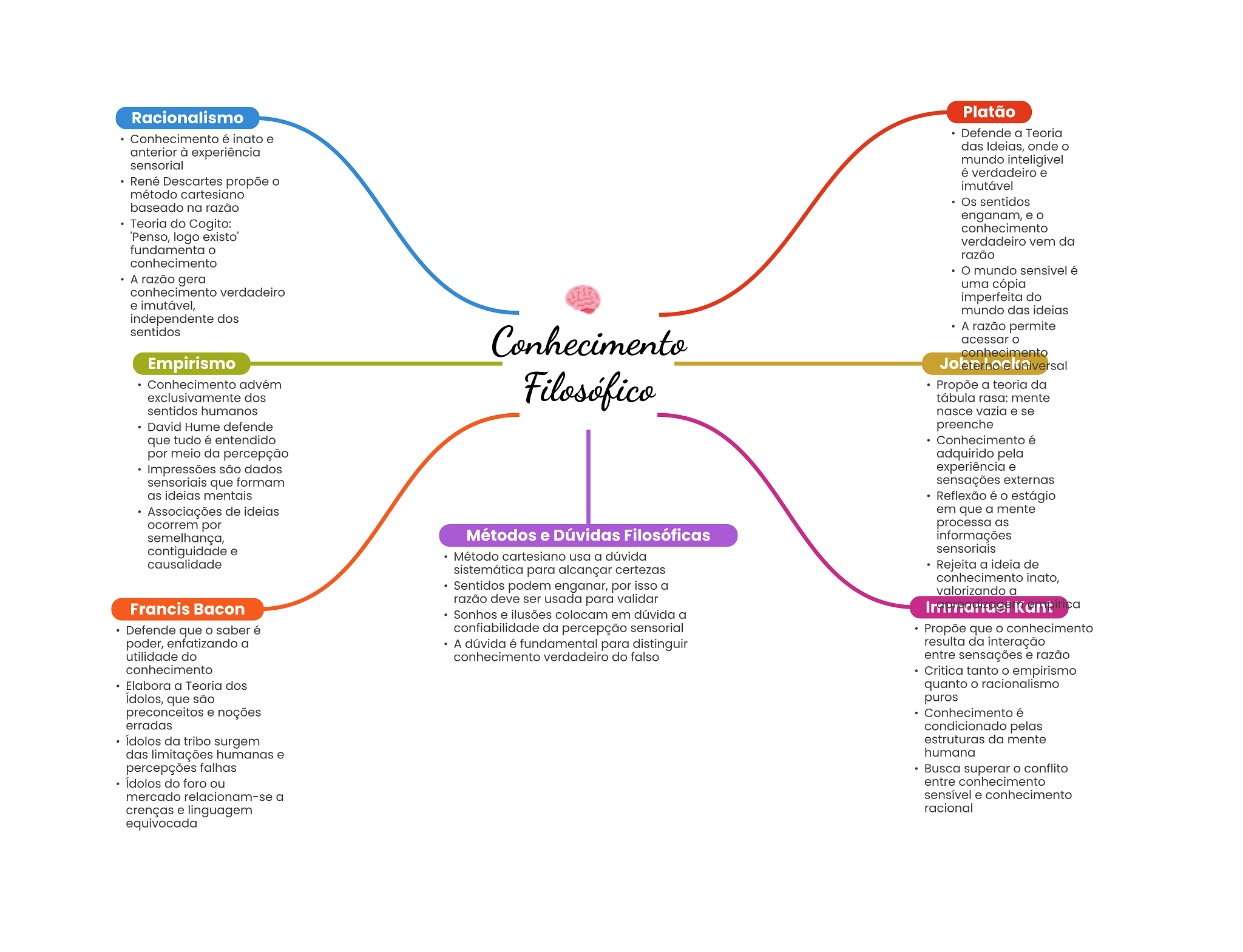 Racionalismo Platão Defende a Teoria Conhecimento é inato e das Ideias, onde O anterior à experiência sensorial mundo inteligível é verdadeiro e René Descartes propõe O imutável método cartesiano Os sentidos baseado na razão enganam, e Teoria do Cogito: conhecimento Penso, logo existo' verdadeiro vem da fundamenta O razão conhecimento mundo sensível é A razão gera uma cópia conhecimento verdadeiro imperfeita do e imutável, mundo das ideias independente dos sentidos A razão permite Conhecimento acessar conhecimento Empirismo universal Conhecimento advém Filosófico Propõe a teoria da exclusivamente dos tábula rasa: mente sentidos humanos nasce vazia e se David Hume defende preenche que tudo é entendido Conhecimento é por meio da percepção adquirido pela Impressões são dados experiência e sensoriais que formam sensações externas as ideias mentais Reflexão é O estágio Associações de ideias em que a mente ocorrem por processa as semelhança, Métodos e Dúvidas Filosóficas informações contiguidade e sensoriais Método cartesiano usa a dúvida causalidade sistemática para alcançar certezas Rejeita a ideia de conhecimento inato, Sentidos podem enganar, por isso a valorizando a razão deve ser usada para validar Francis Bacon Kant Sonhos e ilusões colocam em dúvida a Defende que saber é confiabilidade da percepção sensorial Propõe que O conhecimento poder, enfatizando a A dúvida é fundamental para distinguir resulta da interação utilidade do conhecimento verdadeiro do falso entre sensações e razão conhecimento Critica tanto empirismo Elabora a Teoria dos quanto O racionalismo Idolos, que são puros preconceitos e noções Conhecimento é erradas condicionado pelas Idolos da tribo surgem estruturas da mente das limitações humanas e humana percepções falhas Busca superar O conflito Idolos do foro ou entre conhecimento mercado relacionam-se a sensível e conhecimento crenças e linguagem racional equivocada