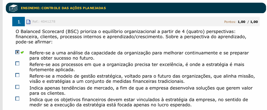 ENSINEME: CONTROLE DAS AÇÕES PLANEJADAS 1. Ref.: 4041278 Pontos: 1,00 / 1,00 O Balanced Scorecard (BSC) prioriza equilíbrio organizacional a partir de 4 (quatro) perspectivas: financeira, clientes, processos internos e aprendizado/crescimento. Sobre a perspectiva do aprendizado, pode-se afirmar: X Refere-se a uma da capacidade da organização para melhorar continuamente e se preparar para obter sucesso no futuro. Refere-se aos processos em que a organização precisa ter excelência, é onde a estratégia é mais fortemente aplicada. Refere-se a modelo de gestão estratégica, voltado para futuro das organizações, que alinha missão, visão e estratégias a um conjunto de medidas financeiras tradicionais. Indica apenas tendências de mercado, a fim de que a empresa desenvolva soluções que gerem valor para os clientes. Indica que os objetivos financeiros devem estar vinculados à estratégia da empresa, no sentido de medir se a execução da estratégia está focada apenas no lucro esperado.