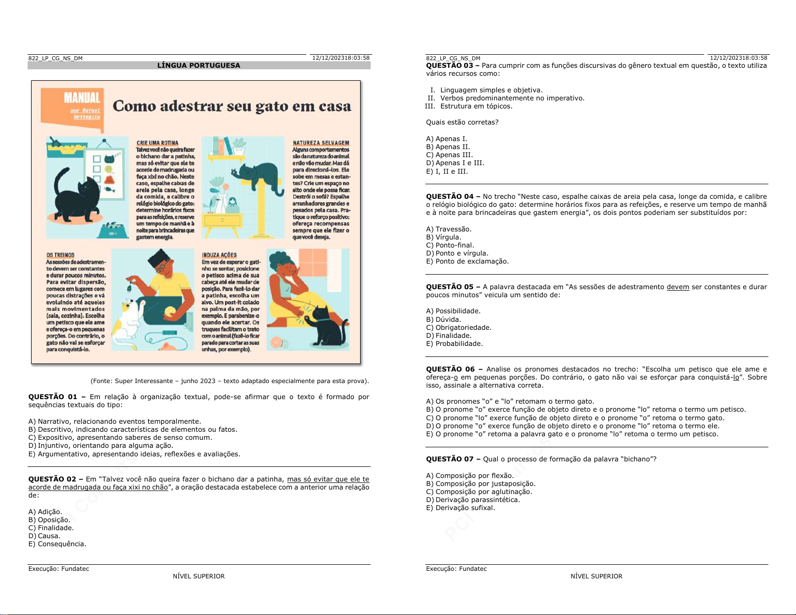 pcimarkpci MDAwMDowMDAwOjAwMDA6MDAwMDowMDAwOmZmZmY6YmQwNjplZDMw:U3VuLCAwNSBPY3QgMjAyNSAxMzowMDoxNiAtMDMwMA== www.pciconcursos.com.br 822_LP_CG_NS_DM Execução: Fundatec NÍVEL SUPERIOR 12/12/202318:03:58 LÍNGUA PORTUGUESA (Fonte: Super Interessante – junho 2023 – texto adaptado especialmente para esta prova). QUESTÃO 01 – Em relação à organização textual, pode-se afirmar que o texto é formado por sequências textuais do tipo: A) Narrativo, relacionando eventos temporalmente. B) Descritivo, indicando características de elementos ou fatos. C) Expositivo, apresentando saberes de senso comum. D) Injuntivo, orientando para alguma ação. E) Argumentativo, apresentando ideias, reflexões e avaliações. QUESTÃO 02 – Em “Talvez você não queira fazer o bichano dar a patinha, mas só evitar que ele te acorde de madrugada ou faça xixi no chão”, a oração destacada estabelece com a anterior uma relação de: A) Adição. B) Oposição. C) Finalidade. D) Causa. E) Consequência. pcimarkpci MDAwMDowMDAwOjAwMDA6MDAwMDowMDAwOmZmZmY6YmQwNjplZDMw:U3VuLCAwNSBPY3QgMjAyNSAxMzowMDoxNiAtMDMwMA== www.pciconcursos.com.br 822_LP_CG_NS_DM Execução: Fundatec NÍVEL SUPERIOR 12/12/202318:03:58 QUESTÃO 03 – Para cumprir com as funções discursivas do gênero textual em questão, o texto utiliza vários recursos como: I. Linguagem simples e objetiva. II. Verbos predominantemente no imperativo. III. Estrutura em tópicos. Quais estão corretas? A) Apenas I. B) Apenas II. C) Apenas III. D) Apenas I e III. E) I, II e III. QUESTÃO 04 – No trecho “Neste caso, espalhe caixas de areia pela casa, longe da comida, e calibre o relógio biológico do gato: determine horários fixos para as refeições, e reserve um tempo de manhã e à noite para brincadeiras que gastem energia”, os dois pontos poderiam ser substituídos por: A) Travessão. B) Vírgula. C) Ponto-final. D) Ponto e vírgula. E) Ponto de exclamação. QUESTÃO 05 – A palavra destacada em “As sessões de adestramento devem ser constantes e durar poucos minutos” veicula um sentido de: A) Possibilidade. B) Dúvida. C) Obrigatoriedade. D) Finalidade. E) Probabilidade. QUESTÃO 06 – Analise os pronomes destacados no trecho: “Escolha um petisco que ele ame e ofereça-o em pequenas porções. Do contrário, o gato não vai se esforçar para conquistá-lo”. Sobre isso, assinale a alternativa correta. A) Os pronomes “o” e “lo” retomam o termo gato. B) O pronome “o” exerce função de objeto direto e o pronome “lo” retoma o termo um petisco. C) O pronome “lo” exerce função de objeto direto e o pronome “o” retoma o termo gato. D) O pronome “o” exerce função de objeto direto e o pronome “lo” retoma o termo ele. E) O pronome “o” retoma a palavra gato e o pronome “lo” retoma o termo um petisco. QUESTÃO 07 – Qual o processo de formação da palavra “bichano”? A) Composição por flexão. B) Composição por justaposição. C) Composição por aglutinação. D) Derivação parassintética. E) Derivação sufixal. pcimarkpci MDAwMDowMDAwOjAwMDA6MDAwMDowMDAwOmZmZmY6YmQwNjplZDMw:U3VuLCAwNSBPY3QgMjAyNSAxMzowMDoxNiAtMDMwMA== www.pciconcursos.com.br 822_LP_CG_NS_DM Execução: Fundatec NÍVEL SUPERIOR 12/12/202318:03:58 QUESTÃO 08 – No trecho “reserve um tempo de manhã e à noite para brincadeiras que gastem energia”, a função sintática da oração em destaque é de: A) Adjunto adnominal. B) Adjunto adverbial. C) Complemento nominal. D) Predicativo. E) Objeto indireto. QUESTÃO 09 – “Talvez você não queira fazer o bichano dar a patinha, mas só evitar que ele te acorde de madrugada ou faça xixi no chão. Neste caso, espalhe caixas de areia pela casa, longe da comida, e calibre o relógio biológico do gato: determine horários fixos para as refeições, e reserve um tempo de manhã e à noite para brincadeiras que gastem energia”. Sobre o emprego do termo que sublinhados no trecho acima, analise as assertivas a seguir: I. O primeiro “que” introduz uma oração que completa o sentido do verbo “evitar”. II. O segundo “que” introduz uma oração que retoma o nome “brincadeiras”. III. O primeiro “que” é um pronome relativo. Quais estão corretas? A) Apenas I. B) Apenas II. C) Apenas III. D) Apenas I e II. E) I, II e III. QUESTÃO 10 – Analise as frases abaixo e assinale a alternativa INCORRETA. 1. O gatinho sentou-se. 2. Vendem-se caixas de areia. 3. As sessões de adestramento foram planejadas pelo tutor. 4. Precisa-se de caixas de areia. A) A frase 1 representa uma voz reflexiva. B) Na frase 1, o pronome pode ser deslocado para antes do verbo, sem prejuízo às normas de colocação pronominal. C) A frase 3 representa uma voz ativa. D) Na frase 4, o sujeito é indeterminado. E) A frase 2 representa uma voz passiva. CONHECIMENTOS GERAIS QUESTÃO 11 – O governo federal brasileiro vem, há anos, ofertando incentivos à educação por meio de bolsas que dão acesso à graduação ou que podem ser usufruídas durante a graduação ou pós-graduação para capacitação, pesquisa, aperfeiçoamento e quitação de mensalidades. São programas de bolsas de estudo com incentivo público no âmbito federal: I. Iniciação Científica. II. ProUni. III. Pibid. Quais estão corretas? A) Apenas I. B) Apenas II. C) Apenas III. D) Apenas I e II. E) I, II e III. pcimarkpci MDAwMDowMDAwOjAwMDA6MDAwMDowMDAwOmZmZmY6YmQwNjplZDMw:U3VuLCAwNSBPY3QgMjAyNSAxMzowMDoxNiAtMDMwMA== www.pciconcursos.com.br 822_CE_36_NS_DM Execução: Fundatec PROFESSOR DE LÍNGUA INGLESA 13/12/202312:30:30 CONHECIMENTOS ESPECÍFICOS Scientists study the world’s oldest person 01 02 03 04 05 06 07 08 09 10 11 12 13 14 15 16 17 18 19 20 21 22 23 24 25 26 27 28 29 30 31 32 33 34 35 After being bewildered by the “super grandmother’s” great health at 116 years old, scientists are studying Maria Branyas, the world’s oldest person, in an attempt to unearth the secret to a long life. Mr.