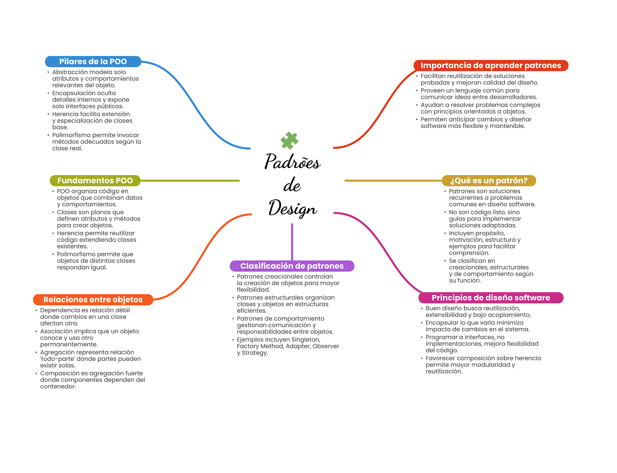 Pilares de la Importancia de aprender patrones Abstracción modela solo atributos y comportamientos Facilitan reutilización de soluciones relevantes del objeto. probadas y mejoran calidad del diseño. Encapsulación oculta Proveen un lenguaje común para detalles internos y expone comunicar ideas entre desarrolladores. solo interfaces públicas. Ayudan a resolver problemas complejos Herencia facilita extensión con principios orientados a objetos. y especialización de clases Permiten anticipar cambios y diseñar base. software más flexible y mantenible. Polimorfismo permite invocar métodos adecuados según la clase real. Padrões Fundamentos de ¿Qué es un patrón? POO organiza código en Patrones son soluciones objetos que combinan datos recurrentes a problemas y comportamientos. Design comunes en diseño software. Clases son planos que No son código listo, sino definen atributos y métodos guías para implementar para crear objetos. soluciones adaptadas. Herencia permite reutilizar Incluyen propósito, código extendiendo clases motivación, estructura y existentes. ejemplos para facilitar Polimorfismo permite que comprensión. objetos de distintas clases Se clasifican en respondan igual. Clasificación de patrones creacionales, estructurales Patrones creacionales controlan y de comportamiento según la creación de objetos para mayor su función. flexibilidad. Relaciones entre objetos Patrones estructurales organizan Principios de diseño software clases y objetos en estructuras Dependencia es relación débil eficientes. Buen diseño busca reutilización, donde cambios en una clase extensibilidad y bajo acoplamiento. Patrones de comportamiento afectan otra. gestionan comunicación y Encapsular lo que varía minimiza Asociación implica que un objeto responsabilidades entre objetos. impacto de cambios en el sistema. conoce y usa otro Ejemplos incluyen Singleton, Programar a interfaces, no permanentemente. Factory Method, Adapter, Observer implementaciones, mejora flexibilidad Agregación representa relación y Strategy. del código. 'todo-parte' donde partes pueden Favorecer composición sobre herencia existir solas. permite mayor modularidad y Composición es agregación fuerte donde componentes dependen del contenedor.