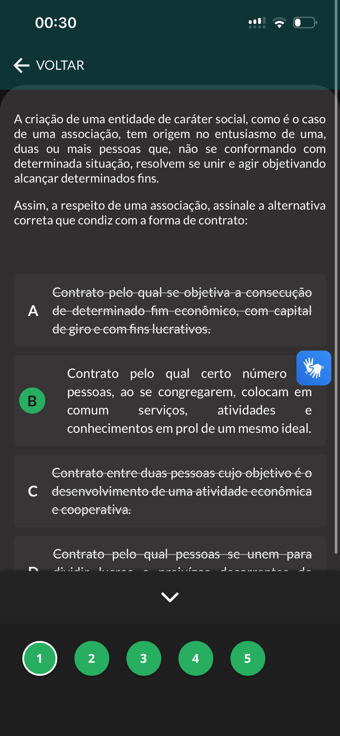 00:30 VOLTAR A criação de uma entidade de caráter social, como é caso de uma associação, tem origem no entusiasmo de uma, duas ou mais pessoas que, não se conformando com determinada situação, resolvem se unir e agir objetivando alcançar determinados fins. Assim, a respeito de uma associação, assinale a alternativa correta que condiz com a forma de contrato: Contrato pelo qual se objetiva a consecução A de determinado fim econômico, com capital de giro e com fins lucrativos. Contrato pelo qual certo número pessoas, ao se congregarem, colocam em comum serviços, atividades e conhecimentos em prol de um mesmo ideal. Contrato entre duas pessoas cujo objetivo é c desenvolvimento de uma atividade econômica e cooperativa. Contrato pelo qual pessoas se unem para 1 2 3 4 5