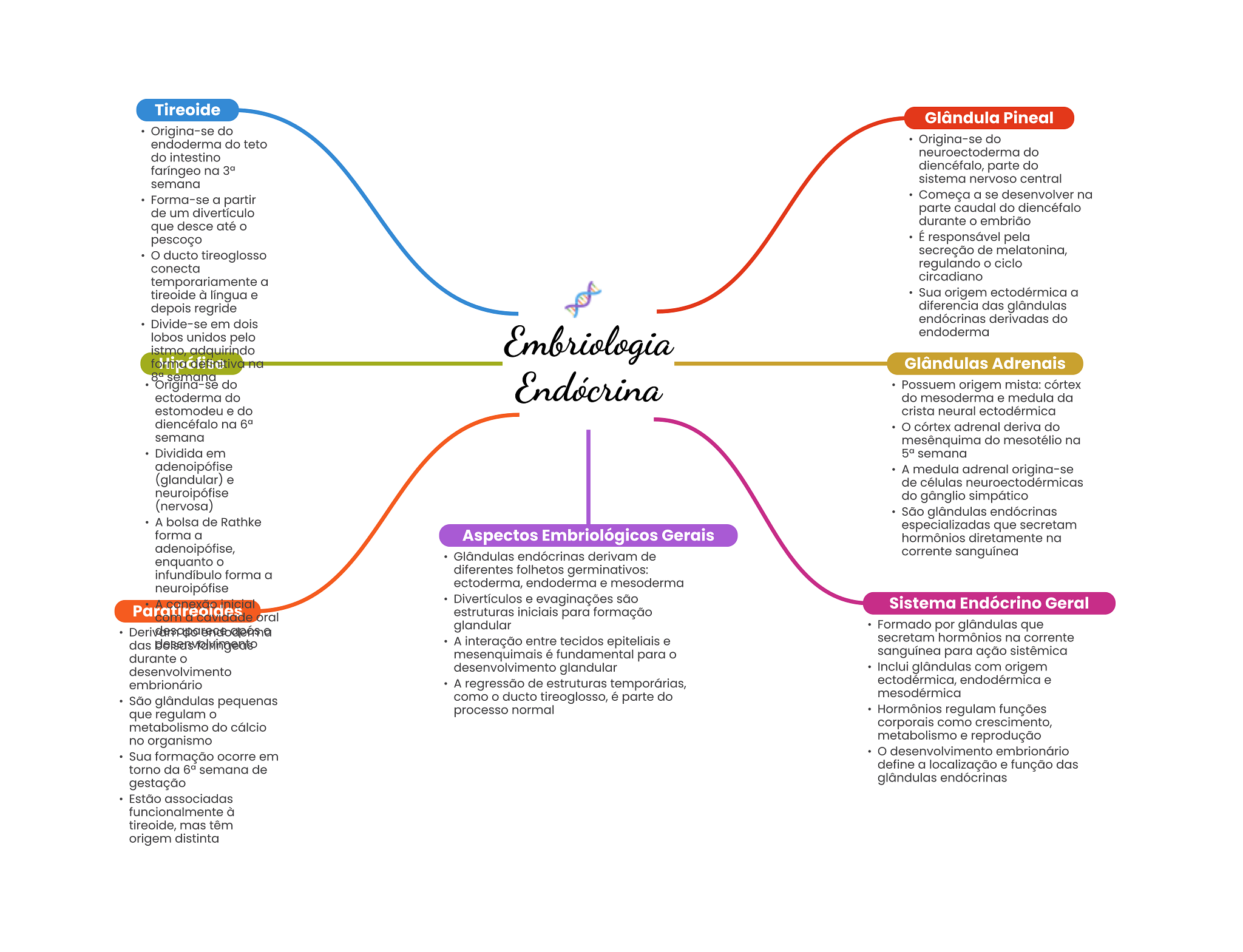 Tireoide Glândula Pineal Origina-se do endoderma do teto Origina-se do do intestino neuroectoderma do faríngeo na diencéfalo, parte do sistema nervoso central semana Forma-se a partir Começa a se desenvolver na de um divertículo parte caudal do diencéfalo que desce até durante embrião pescoço É responsável pela ducto tireoglosso secreção de melatonina, conecta regulando ciclo circadiano temporariamente a tireoide à língua e Sua origem ectodérmica a depois regride diferencia das glândulas Divide-se em dois endócrinas derivadas do lobos unidos pelo istmo adquirindo Embriologia endoderma forma definitiva na Glândulas Adrenais semana Origina-se do ectoderma do Endócrina Possuem origem mista: córtex do mesoderma e medula da estomodeu e do crista neural ectodérmica diencéfalo na córtex adrenal deriva do semana mesênquima do mesotélio na Dividida em semana adenoipófise A medula adrenal origina-se (glandular) e de células neuroectodérmicas neuroipófise do gânglio simpático (nervosa) São glândulas endócrinas A bolsa de Rathke especializadas que secretam forma a Aspectos Embriológicos Gerais hormônios diretamente na adenoipófise, Glândulas endócrinas derivam de corrente sanguínea enquanto infundíbulo forma a diferentes folhetos germinativos: neuroipófise ectoderma, endoderma e mesoderma Divertículos e evaginações são Sistema Endócrino Geral Paratireoides oral estruturas iniciais para formação glandular Formado por glândulas que A interação entre tecidos epiteliais e secretam hormônios na corrente das mesenquimais é fundamental para sanguínea para ação sistêmica durante desenvolvimento desenvolvimento glandular Inclui glândulas com origem embrionário A regressão de estruturas temporárias, ectodérmica, endodérmica e São glândulas pequenas como ducto tireoglosso, é parte do mesodérmica que regulam processo normal Hormônios regulam funções metabolismo do cálcio corporais como crescimento, no organismo metabolismo e reprodução Sua formação ocorre em desenvolvimento embrionário torno da semana de define a localização e função das gestação glândulas endócrinas Estão associadas funcionalmente à tireoide, mas têm origem distinta