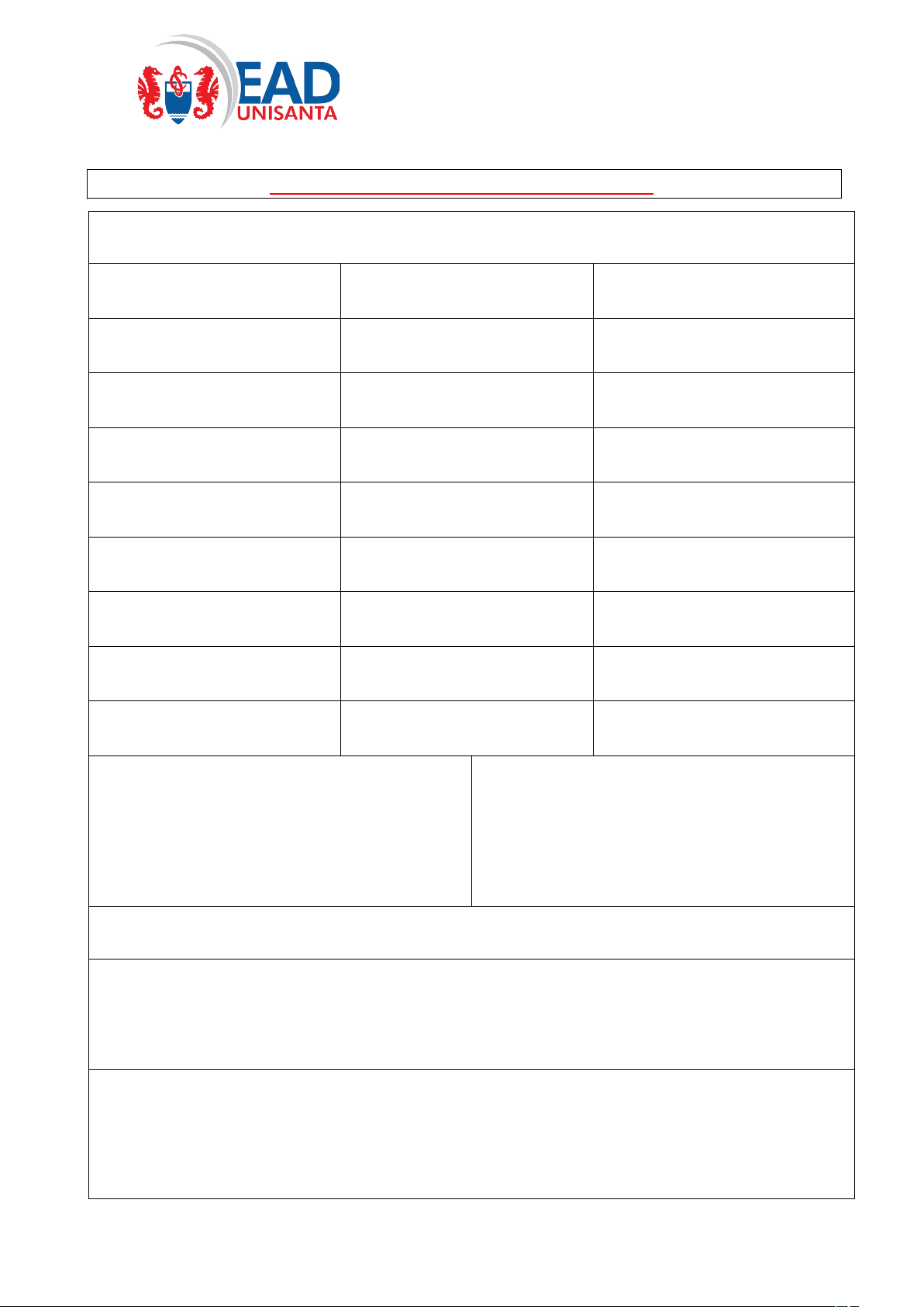 UNIVERSIDADE SANTA CECÍLIA Curso de Bacharelado em Serviço Social UNIVERSIDADE SANTA CECÍLIA Curso de Bacharelado em Serviço Social ROTEIRO - PROJETO DE EXTENSÃO Aluno: RA: Curso: Semestre: Aluno: RA: Curso: Semestre: Aluno: RA: Curso: Semestre: Aluno: RA: Curso: Semestre: Aluno: RA: Curso: Semestre: Dados do Campo Extensionista: Nome: Endereço: Tipo: Carga Horária: Nome do responsável do campo de extensão: Título do Projeto: Apresentação do projeto: Justificativa: Objetivo (Geral/Específico): População alvo: Metodologia: Detalhamento da execução do projeto de extensão (mínimo dois parágrafos): Recursos: (Físico/ Humano/ Material): Assinatura: _______________________________ _______________________________ _______________________________ _______________________________ _______________________________ EaD UNISANTA Rua Cesário Mota, 08 - Bloco F, Sala F12 – Boqueirão – Santos/SP – CEP 11045-040 – Tel. (13) 3202-7159 EaD UNISANTA Rua Cesário Mota, 08 - Bloco F, Sala F12 – Boqueirão – Santos/SP – CEP 11045-040 – Tel. (13) 3202-7159 image1.png