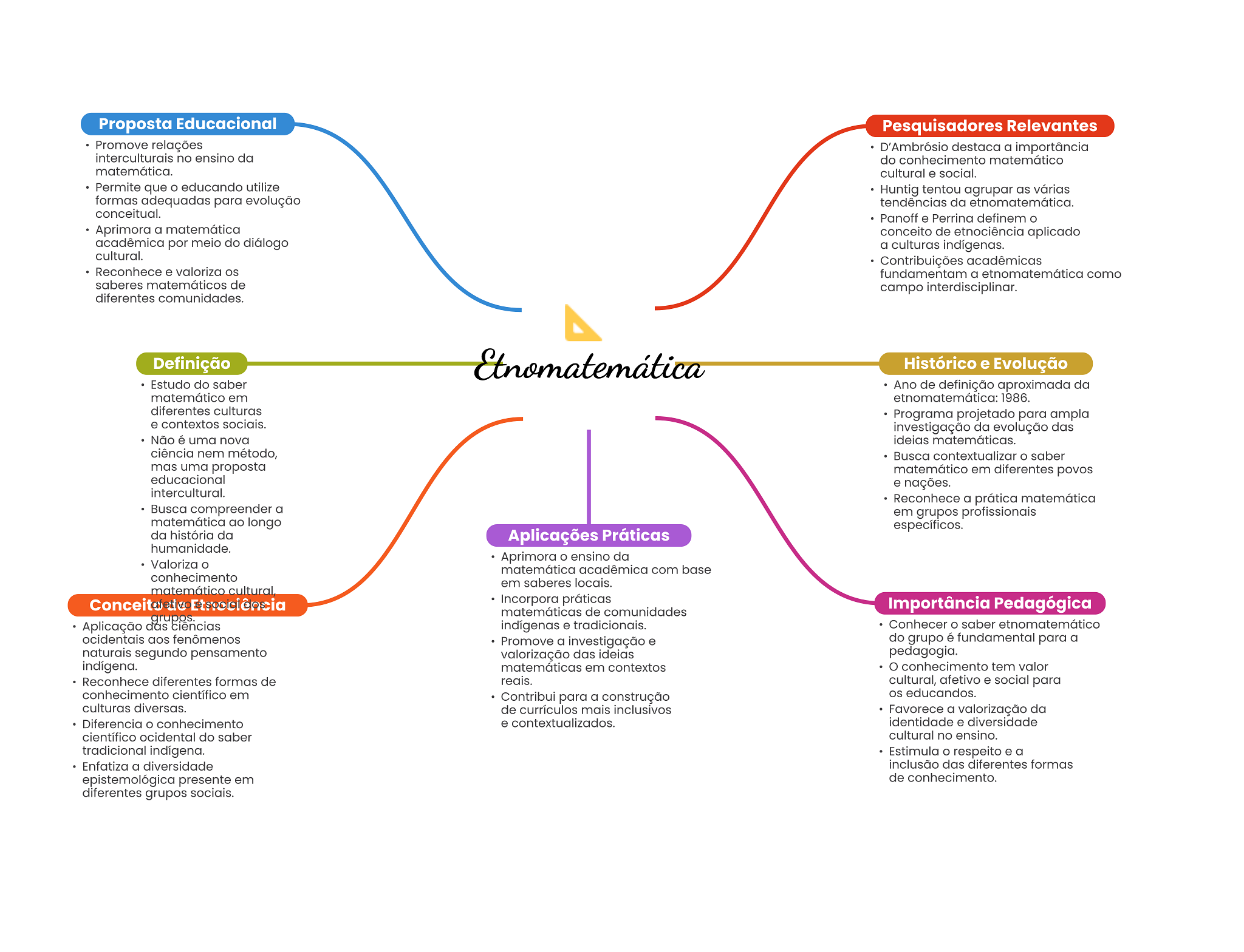 Proposta Educacional Pesquisadores Relevantes Promove relações D'Ambrósio destaca a importância interculturais no ensino da do conhecimento matemático matemática. cultural e social. Permite que educando utilize Huntig tentou agrupar as várias formas adequadas para evolução tendências da etnomatemática. conceitual. Panoff e Perrina definem Aprimora a matemática conceito de etnociência aplicado acadêmica por meio do diálogo a culturas indígenas. cultural. Contribuições acadêmicas Reconhece e valoriza fundamentam a etnomatemática como saberes matemáticos de campo interdisciplinar. diferentes comunidades. Definição Etnomatemática Histórico e Evolução Estudo do saber Ano de definição aproximada da matemático em etnomatemática: 1986. diferentes culturas Programa projetado para ampla e contextos sociais. investigação da evolução das Não é uma nova ideias matemáticas. ciência nem método, Busca contextualizar O saber mas uma proposta matemático em diferentes povos educacional e nações. intercultural. Reconhece a prática matemática Busca compreender a em grupos profissionais matemática ao longo específicos. da história da Aplicações Práticas humanidade. Aprimora ensino da Valoriza matemática acadêmica com base conhecimento em saberes locais. matemático Incorpora práticas matemáticas de comunidades Importância Pedagógica grupos. Aplicação das ciências indígenas e tradicionais. Conhecer saber etnomatemático ocidentais aos fenômenos Promove a investigação e do grupo é fundamental para a naturais segundo pensamento valorização das ideias pedagogia. indígena. matemáticas em contextos conhecimento tem valor Reconhece diferentes formas de reais. cultural, afetivo e social para conhecimento científico em Contribui para a construção educandos. culturas diversas. de currículos mais inclusivos Favorece a valorização da Diferencia conhecimento e contextualizados. identidade e diversidade científico ocidental do saber cultural no ensino. tradicional indígena. Estimula respeito e a Enfatiza a diversidade inclusão das diferentes formas epistemológica presente em de conhecimento. diferentes grupos sociais.