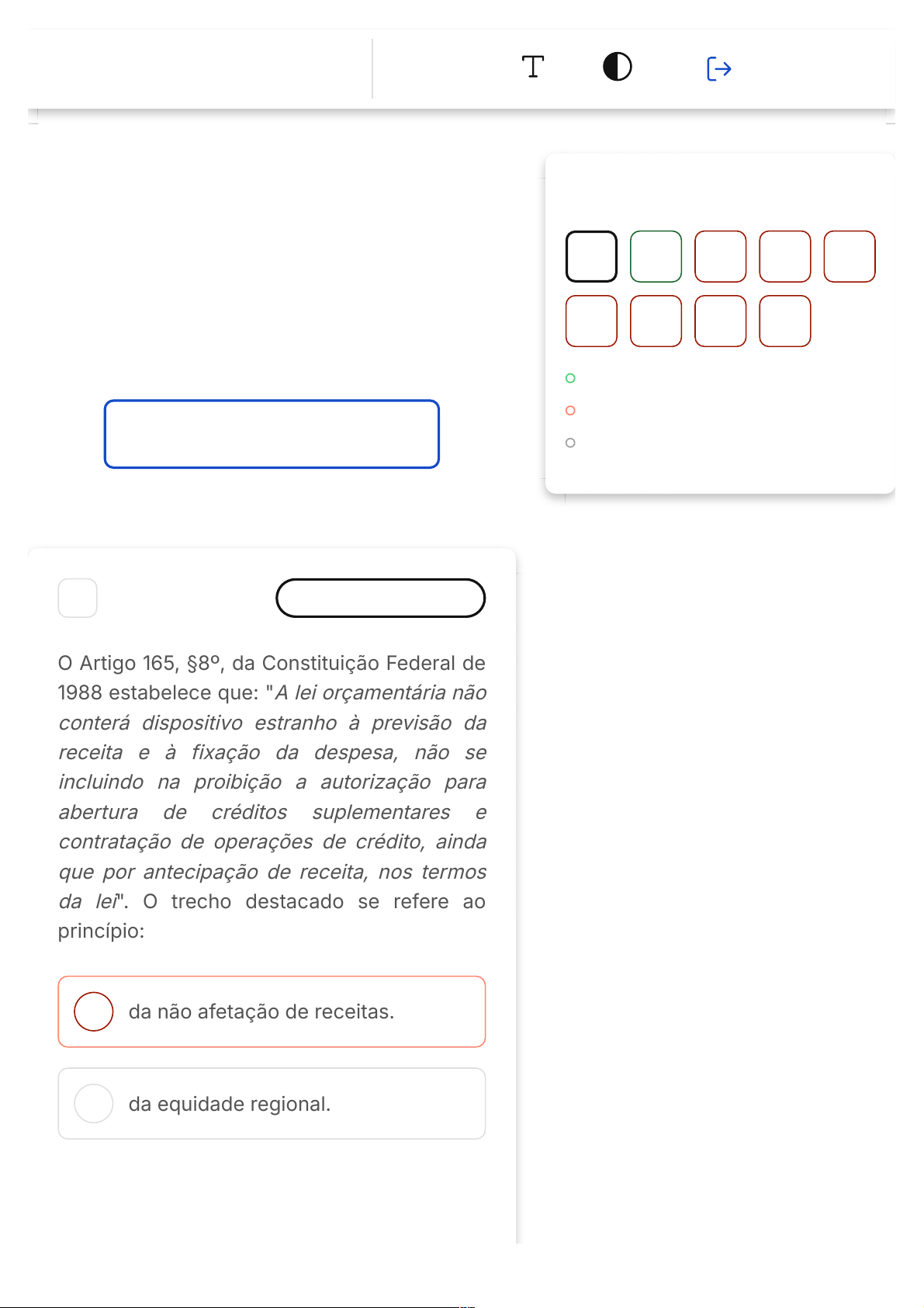 Você acertou 1 de 9 questões Verifique o seu desempenho e continue treinando! Você pode refazer o exercício quantas vezes quiser. Verificar Desempenho A B 1 Marcar para revisão O Artigo 165, §8º, da Constituição Federal de 1988 estabelece que: "A lei orçamentária não conterá dispositivo estranho à previsão da receita e à fixação da despesa, não se incluindo na proibição a autorização para abertura de créditos suplementares e contratação de operações de crédito, ainda que por antecipação de receita, nos termos da lei". O trecho destacado se refere ao princípio: da não afetação de receitas. da equidade regional. Questão 1 de 9 Corretas (1) Incorretas (8) Em branco (0) 1 2 3 4 5 6 7 8 9 Lista de exercícios Planejament… Orçamento Público Sair C D E A B da exclusividade orçamentária do orçamento participativo. da seletividade. Resposta incorreta Opa! A alternativa correta é a letra C. Confira o gabarito comentado! Gabarito Comentado O princípio da exclusividade orçamentária determina que a lei orçamentária não pode conter dispositivos estranhos à previsão da receita e à fixação da despesa. 2 Marcar para revisão A competência para julgar, mediante controle externo, as contas prestadas anualmente pelo presidente da República é do: Congresso Nacional. Supremo Tribunal Federal. C D E Tribunal de Contas da União. Senado Federal. Conselho Nacional de Justiça. Resposta correta Parabéns, você selecionou a alternativa correta. Confira o gabarito comentado! Gabarito Comentado A competência para julgar as contas prestadas anualmente pelo presidente da República é do Congresso Nacional, conforme o Art. 71 da Constituição Federal. 3 Marcar para revisão Sobre a Lei Orçamentária Anual, considere as assertivas a seguir: I - Nessa lei, estão estimadas as receitas que serão arrecadadas durante o ano e definidas as despesas que o governo espera realizar com esses recursos, conforme aprovado pelo Poder Legislativo. II - O Poder Legislativo possui a exclusividade na iniciativa das leis orçamentárias. O projeto de lei deve ser encaminhado para a apreciação do Executivo A B C D E até 31 de agosto de cada ano. III - Essa lei é composta por três orçamentos previstos na Constituição Federal: orçamento fiscal, o da seguridade social (previdência, assistência e saúde) e o de investimentos das empresas estatais. Está(ão) correto(s): somente I. somente II. somente I e II. somente I e III. I, II e III. Resposta incorreta Opa! A alternativa correta é a letra D. Confira o gabarito comentado! Gabarito Comentado As assertivas I e III estão corretas. A assertiva I está correta porque a Lei Orçamentária Anual estima as receitas que serão arrecadadas durante o ano e define as despesas que o governo espera realizar com esses recursos, conforme aprovado pelo Poder Legislativo. A assertiva III também está correta, pois a Lei Orçamentária Anual é A B C composta por três orçamentos previstos na Constituição Federal: orçamento fiscal, o da seguridade social (previdência, assistência e saúde) e o de investimentos das empresas estatais. No entanto, a assertiva II está incorreta, pois a iniciativa das leis orçamentárias não é exclusiva do Poder Legislativo, mas sim do Poder Executivo, conforme estabelecido na Constituição Federal. 4 Marcar para revisão Existe a possibilidade de que o orçamento do TRF da 3ª Região não tenha computadas ou tenha insuficientemente dotadas autorizações para determinadas despesas. Nesse caso, a Lei nº 4.320/1964 prevê como solução a abertura de créditos adicionais, que podem ser classificados em suplementares, especiais e extraordinários. É regra atinente aos créditos adicionais que: São extraordinários os destinados a despesas para as quais não haja dotação orçamentária específica. São especiais os destinados a reforço de dotação orçamentária. Os créditos suplementares, especiais e extraordinários devem ser autorizados por lei. D E Consideram-se recursos disponíveis para a abertura de créditos suplementares os resultantes de anulação parcial de dotação orçamentária. A abertura de crédito adicional destinado à despesa urgente e imprevista em caso de calamidade pública independe de ciência ao Poder Legislativo. Resposta incorreta Opa! A alternativa correta é a letra D. Confira o gabarito comentado! Gabarito Comentado A alternativa correta é a que afirma que os recursos disponíveis para a abertura de créditos suplementares são os resultantes de anulação parcial de dotação orçamentária. Isso significa que, se uma parte do orçamento destinada a uma determinada despesa não for utilizada, esses recursos podem ser realocados para suplementar outras despesas. Essa é uma prática comum na gestão orçamentária para garantir que os recursos sejam utilizados de maneira eficiente e eficaz. A B C D E 5 Marcar para revisão Ao assumir seu mandato, o prefeito do município de Ilusões propôs que, em vez de elaborar uma única Lei Orçamentária Anual para o município, fossem elaboradas duas leis orçamentárias anuais: uma referente ao Poder Executivo e outra ao Legislativo. A proposta do prefeito é inviável, porque fere o princípio orçamentário de: Exclusividade. Unidade. Universalidade. Anualidade. Orçamento Bruto. Resposta incorreta Opa! A alternativa correta é a letra B. Confira o gabarito comentado! Gabarito Comentado O princípio da unidade determina que a lei orçamentária deve ser única, abrangendo todas as receitas e despesas do ente público. A proposta do A B C D E prefeito de Ilusões, de elaborar duas leis orçamentárias anuais, fere esse princípio. 6 Marcar para revisão São créditos adicionais as autorizações de despesas não computadas ou insuficientemente dotadas na Lei do Orçamento. São classificados como: Suplementares os destinados a despesas para as quais não haja dotação orçamentária específica. Especiais os 