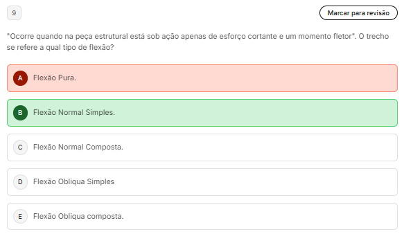 9 Marcar para revisão "Ocorre quando na peça estrutural sob ação apenas de esforço cortante e um momento fletor". trecho se refere a qual tipo de flexão? A Flexão Pura. B Flexão Normal Simples. C Flexão Normal Composta. D Flexão Obliqua Simples E Flexão Obliqua composta.