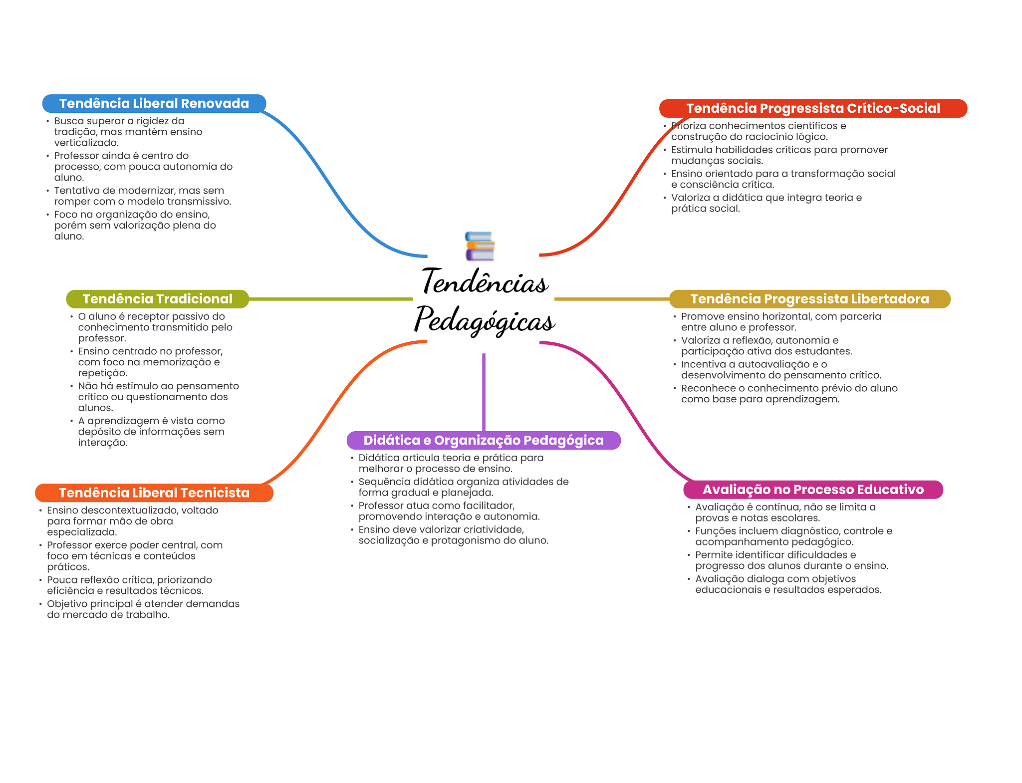 Tendência Liberal Renovada Tendência Progressista Crítico-Social Busca superar a rigidez da Prioriza conhecimentos científicos e tradição, mas mantém ensino verticalizado. construção do raciocínio lógico. Professor ainda é centro do Estimula habilidades críticas para promover mudanças sociais. processo, com pouca autonomia do aluno. Ensino orientado para a transformação social e consciência crítica. Tentativa de modernizar, mas sem romper com modelo transmissivo. Valoriza a didática que integra teoria e prática social. Foco na organização do ensino, porém sem valorização plena do aluno. Tendências Tendência Tradicional Tendência Progressista Libertadora aluno é receptor passivo do Pedagógicas Promove ensino horizontal, com parceria conhecimento transmitido pelo entre aluno e professor. professor. Valoriza a reflexão, autonomia e Ensino centrado no professor, participação ativa dos estudantes. com foco na memorização e Incentiva a autoavaliação e repetição. desenvolvimento do pensamento crítico. Não há estímulo ao pensamento Reconhece conhecimento prévio do aluno crítico ou questionamento dos como base para aprendizagem. alunos. A aprendizagem é vista como depósito de informações sem interação. Didática e Organização Pedagógica Didática articula teoria e prática para melhorar processo de ensino. Sequência didática organiza atividades de Tendência Liberal Tecnicista forma gradual e planejada. Avaliação no Processo Educativo Ensino descontextualizado voltado Professor atua como facilitador, Avaliação é contínua, não se limita a para formar mão de obra promovendo interação e autonomia. provas e notas escolares. especializada. Ensino deve valorizar criatividade, Funções incluem diagnóstico, controle e Professor exerce poder central, com socialização e protagonismo do aluno. acompanhamento pedagógico. foco em técnicas e conteúdos Permite identificar dificuldades e práticos. progresso dos alunos durante ensino. Pouca reflexão crítica, priorizando Avaliação dialoga com objetivos eficiência e resultados técnicos. educacionais e resultados esperados. Objetivo principal é atender demandas do mercado de trabalho.