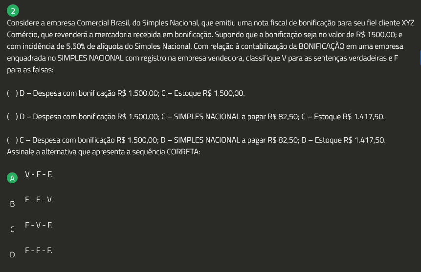 2 Considere a empresa Comercial Brasil, do Simples Nacional, que emitiu uma nota fiscal de bonificação para seu fiel cliente XYZ Comércio, que revenderá a mercadoria recebida em bonificação. Supondo que a bonificação seja no valor de R$ 1500,00; e com incidência de 5,50% de alíquota do Simples Nacional. Com relação à contabilização da BONIFICAÇÃO em uma empresa enquadrada no SIMPLES NACIONAL com registro na empresa vendedora, classifique V para as sentenças verdadeiras e F para as falsas: - Despesa com bonificação R$ 1.500,00; Estoque R$ 1.500,00. ( )D - Despesa com bonificação R$ 1.500,00; C - SIMPLES NACIONAL a pagar R$ 82,50; C - Estoque R$ 1.417,50. ( )C - Despesa com bonificação R$ 1.500,00; D - SIMPLES NACIONAL a pagar R$ 82,50; D - Estoque R$ 1.417,50. Assinale a alternativa que apresenta a sequência CORRETA: A B F-F-F. D