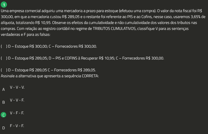1 Uma empresa comercial adquiriu uma mercadoria a prazo para estoque (efetuou uma compra). 0 valor da nota fiscal foi R$ 300,00, em que a mercadoria custou R$ 289,05 restante foi referente ao PIS e ao Cofins, nesse caso, usaremos 3,65% de alíquota, totalizando R$ 10,95. Observe efeitos da cumulatividade e não cumulatividade dos valores dos tributos nas compras. Com relação ao registro contábil no regime de TRIBUTOS CUMULATIVOS, classifique V para as sentenças verdadeiras e F para as falsas: - Estoque R$ 300,00; C Fornecedores R$ 300,00. Estoque D - PIS e COFINS à Recuperar R$ 10,95; - Fornecedores R$ 300,00. - Estoque R$ 289,05 C - Fornecedores R$ 289,05. Assinale a alternativa que apresenta a sequência CORRETA: A V-V-F. B V-F-F. C D
