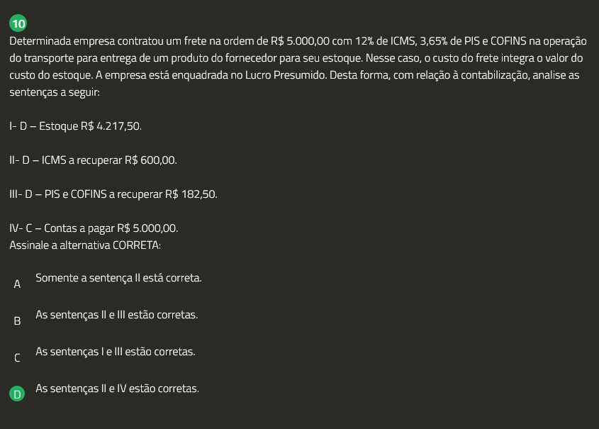 10 Determinada empresa contratou um frete na ordem de R$ 5.000,00 com 12% de ICMS, 3,65% de PIS e COFINS na operação do transporte para entrega de um produto do fornecedor para seu estoque. Nesse caso, 0 custo do frete integra 0 valor do custo do estoque. A empresa está enquadrada no Lucro Presumido. Desta forma, com relação à contabilização, analise as sentenças a seguir: I- D - Estoque R$ 4.217,50. II-D - ICMS a recuperar R$ 600,00. III- D - PIS e COFINS a recuperar R$ 182,50. IV- C - Contas a pagar Assinale a alternativa CORRETA: A Somente a sentença está correta. B As sentenças e III estão corretas. As sentenças e III estão corretas. D As sentenças e IV estão corretas.