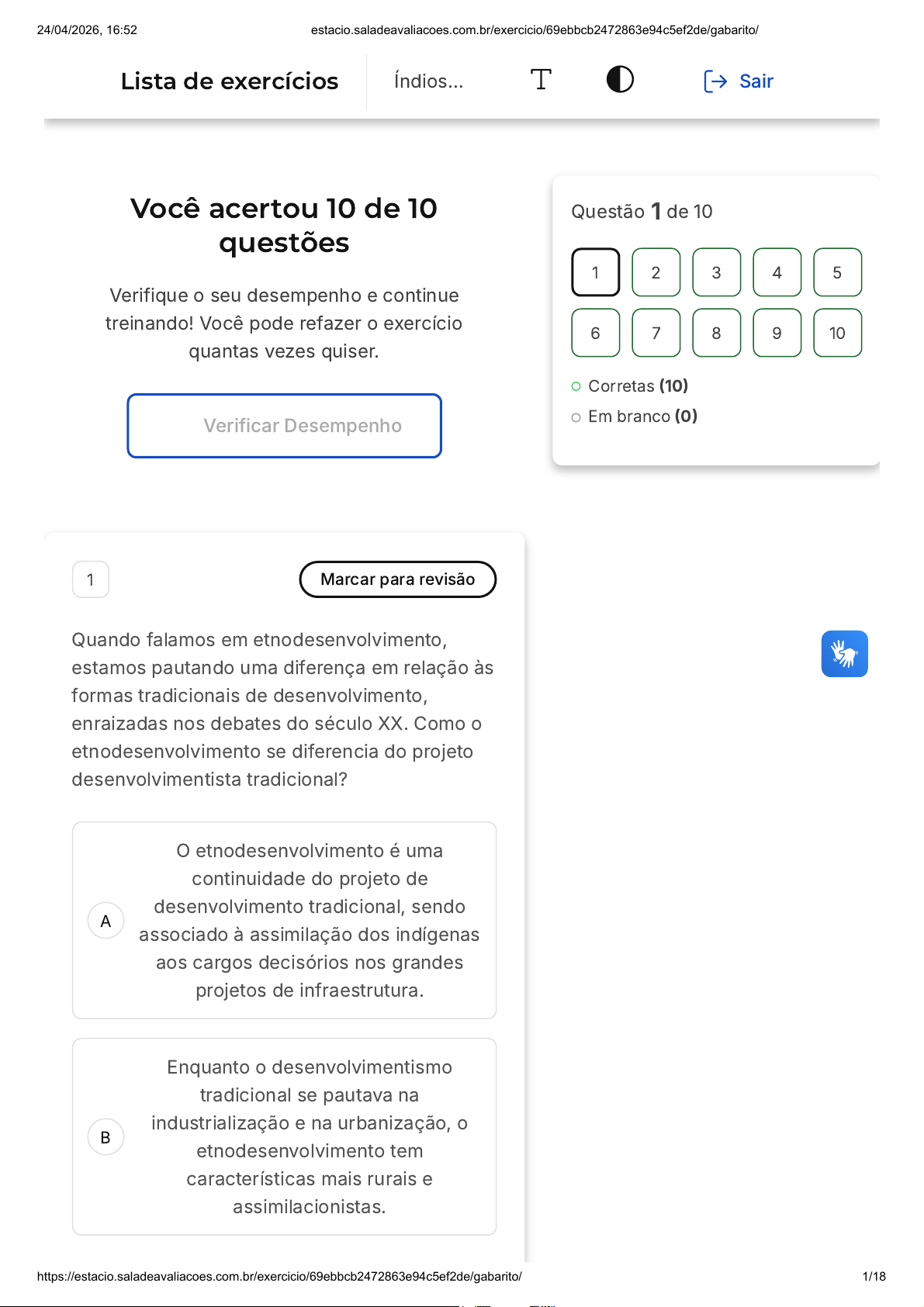 Você acertou 10 de 10 questões Verifique o seu desempenho e continue treinando! Você pode refazer o exercício quantas vezes quiser. Verificar Desempenho A B 1 Marcar para revisão Quando falamos em etnodesenvolvimento, estamos pautando uma diferença em relação às formas tradicionais de desenvolvimento, enraizadas nos debates do século XX. Como o etnodesenvolvimento se diferencia do projeto desenvolvimentista tradicional? O etnodesenvolvimento é uma continuidade do projeto de desenvolvimento tradicional, sendo associado à assimilação dos indígenas aos cargos decisórios nos grandes projetos de infraestrutura. Enquanto o desenvolvimentismo tradicional se pautava na industrialização e na urbanização, o etnodesenvolvimento tem características mais rurais e assimilacionistas. Questão 1 de 10 Corretas (10) Em branco (0) 1 2 3 4 5 6 7 8 9 10 Lista de exercícios Índios… Sair 24/04/2026, 16:52 estacio.saladeavaliacoes.com.br/exercicio/69ebbcb2472863e94c5ef2de/gabarito/ https://estacio.saladeavaliacoes.com.br/exercicio/69ebbcb2472863e94c5ef2de/gabarito/ 1/18 C D E O etnodesenvolvimento diz respeito a um projeto de unificar as etnias em torno de um projeto de desenvolvimento comum, enquanto o projeto de desenvolvimento tradicional considerava que todas as etnias eram iguais. O etnodesenvolvimento preconiza a autonomia de cada população indígena para definir os rumos do seu próprio projeto de desenvolvimento, ao contrário do projeto de desenvolvimento tradicional que era único para o Brasil inteiro. Enquanto o desenvolvimentismo se pauta na construção de grandes projetos de infraestrutura, o etnodesenvolvimento lida com as questões trazidas pela assimilação étnica dos povos indígenas, sobretudo sua incorporação no mercado de terras. Resposta correta Parabéns, você selecionou a alternativa correta. Confira o gabarito comentado! Gabarito Comentado O etnodesenvolvimento se diferencia do desenvolvimentismo tradicional principalmente pela autonomia que concede a cada população indígena para definir os rumos do seu próprio projeto de desenvolvimento. Isso contrasta com o projeto de desenvolvimento tradicional, que propõe uma única trajetória de 24/04/2026, 16:52 estacio.saladeavaliacoes.com.br/exercicio/69ebbcb2472863e94c5ef2de/gabarito/ https://estacio.saladeavaliacoes.com.br/exercicio/69ebbcb2472863e94c5ef2de/gabarito/ 2/18 A B C desenvolvimento para todo o Brasil. Portanto, a alternativa D é a correta, pois reflete essa diferença fundamental entre o etnodesenvolvimento e o desenvolvimentismo tradicional. 2 Marcar para revisão Nas terminologias dos debates intelectuais, muitas vezes nos deparamos com conceitos que apresentam sentidos diferentes dependendo do contexto em que são enunciados. Por que podemos falar em pensamento colonial no contexto brasileiro do século XX mesmo como país já independente? O termo colonial traz em si um sentido literal associado ao processo de transformação tecnológica em curso no século XX. O termo colonial se refere especificamente às práticas jurídicas herdadas do Brasil colônia que ainda vigoravam no século XX. O termo colonial possui também um caráter figurado que se associa a uma visão específica de modernidade em voga no Brasil do século XX. 24/04/2026, 16:52 estacio.saladeavaliacoes.com.br/exercicio/69ebbcb2472863e94c5ef2de/gabarito/ https://estacio.saladeavaliacoes.com.br/exercicio/69ebbcb2472863e94c5ef2de/gabarito/ 3/18 D E O termo colonial não se restringe às práticas jurídico-políticas, mas também engloba um arcabouço de desenvolvimento associado à valorização do indígena a partir do século XX. O termo colonial trata também das formas de desenvolvimentismo modernas, tais como o etnodesenvolvimento. Resposta correta Parabéns, você selecionou a alternativa correta. Confira o gabarito comentado! Gabarito Comentado O termo "colonial" não se limita apenas às formas jurídicas associadas às relações entre colônias e metrópoles. Ele se estende a todas as formas de reprodução dessas hierarquias de poder. Portanto, o pensamento colonial é também aquele associado aos projetos de modernização e assimilação étnica. O que é identificado como pensamento colonial sempre envolve a enunciação da verdade a partir de um não lugar, ou seja, o valor do que é dito é considerado universal. A guinada decolonial, por sua vez, se propõe a enfatizar a raiz do enunciador e tratar o que é dito como uma possibilidade entre muitas, todas igualmente válidas. Portanto, a alternativa C é a correta, pois ela reconhece que o termo colonial possui um caráter figurado que se associa a uma 24/04/2026, 16:52 estacio.saladeavaliacoes.com.br/exercicio/69ebbcb2472863e94c5ef2de/gabarito/ https://estacio.saladeavaliacoes.com.br/exercicio/69ebbcb2472863e94c5ef2de/gabarito/ 4/18 A B C visão específica de modernidade em voga no Brasil do século XX. 3 Marcar para revisão Quando voltamos ao século XIX, no contexto da independência, nos deparamos com debates indigenistas que permeiam as questões centrais da época, em particular os debates sobre a formação do Brasil enquanto nação. Por que a multiplicidade de nações indígenas é entendida como um entrave ao projeto nacional do século XIX? Porque o nacionalismo do século XIX necessitava refinar o aparato jurídico das monarquias do Antigo Regime no qual as nações indígenas não tinham espaço. Porque um dos pilares do nacionalismo do século XIX é a unidade nacional constituída a partir da unidade do povo em termos socioculturais. Porque a multiplicidade das nações indígenas criava uma dificuldade maior no estabelecimento de instituições republicanas como o Parlamento. 24/04/2026, 16:52 estacio.saladeavaliacoes.com.br/exercicio/69ebbcb2472863e94c5ef2de/gabarito/ https://estacio.saladeavaliacoes.com.br/exercicio/69ebbcb2472863e94c5ef2de/gabarito/ 5/18 D E Porque a construção da nação brasileira precisava garantir a integridade
