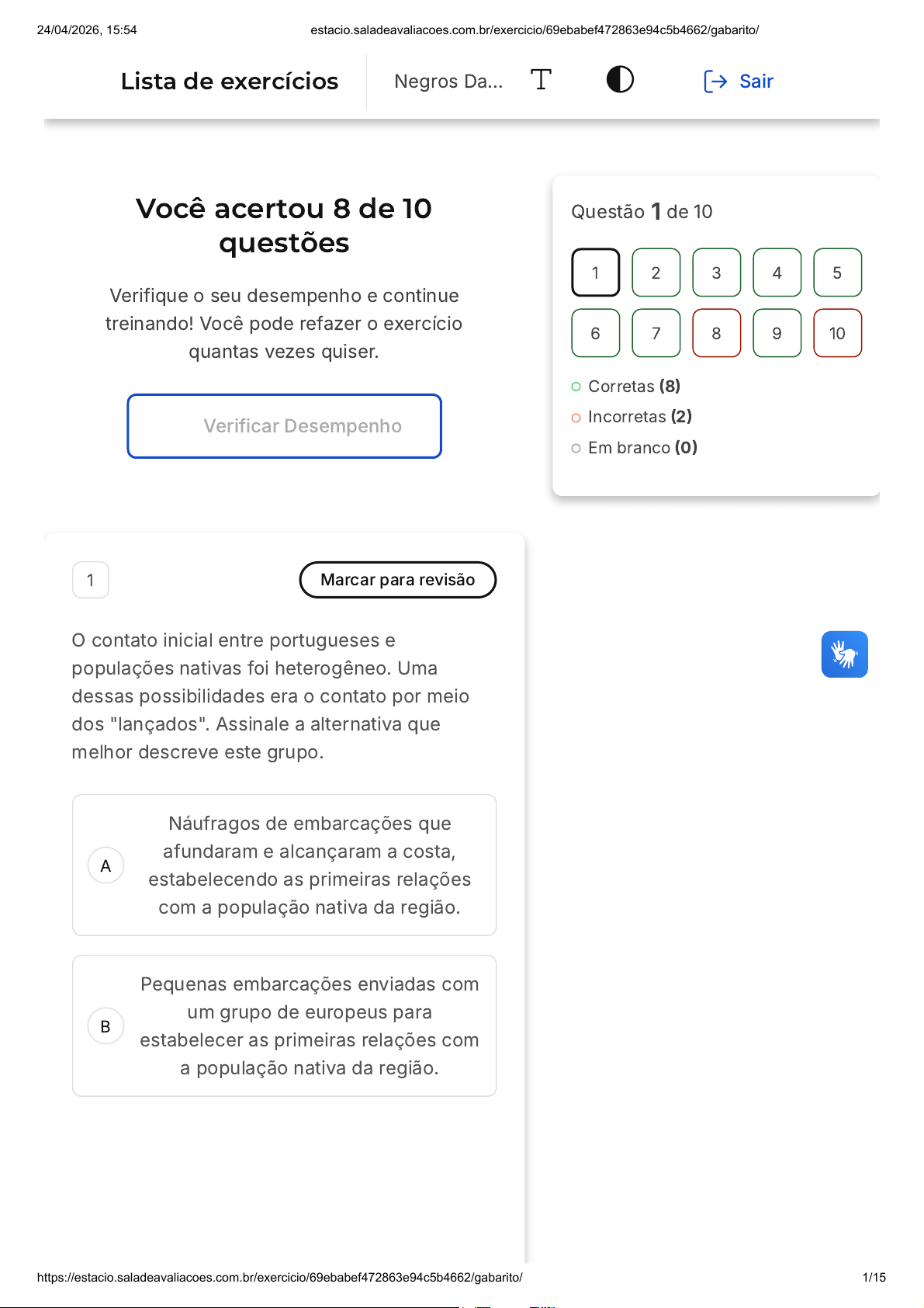 Você acertou 8 de 10 questões Verifique o seu desempenho e continue treinando! Você pode refazer o exercício quantas vezes quiser. Verificar Desempenho A B 1 Marcar para revisão O contato inicial entre portugueses e populações nativas foi heterogêneo. Uma dessas possibilidades era o contato por meio dos "lançados". Assinale a alternativa que melhor descreve este grupo. Náufragos de embarcações que afundaram e alcançaram a costa, estabelecendo as primeiras relações com a população nativa da região. Pequenas embarcações enviadas com um grupo de europeus para estabelecer as primeiras relações com a população nativa da região. Questão 1 de 10 Corretas (8) Incorretas (2) Em branco (0) 1 2 3 4 5 6 7 8 9 10 Lista de exercícios Negros Da… Sair 24/04/2026, 15:54 estacio.saladeavaliacoes.com.br/exercicio/69ebabef472863e94c5b4662/gabarito/ https://estacio.saladeavaliacoes.com.br/exercicio/69ebabef472863e94c5b4662/gabarito/ 1/15 C D E Náufragos que eram lançados de suas embarcações em terra firme para estabelecer os primeiros contatos com a população nativa. Pequenas embarcações enviadas com um colono para estabelecer as primeiras relações com a população nativa da região. Embarcações enviadas com presentes para estabelecer as primeiras relações com a população nativa da região. Resposta correta Parabéns, você selecionou a alternativa correta. Confira o gabarito comentado! Gabarito Comentado O termo "lançados" refere-se a indivíduos que eram deixados propositalmente nas costas de terras desconhecidas, com o objetivo de estabelecer os primeiros contatos com a população nativa. Esses indivíduos, muitas vezes náufragos, eram "lançados" de suas embarcações em terra firme. Através dessa imersão, eles tinham a oportunidade de conhecer os costumes e a linguagem dos nativos, facilitando assim futuras relações entre os europeus e as populações locais. Um exemplo conhecido no Brasil é o de Caramuru. 24/04/2026, 15:54 estacio.saladeavaliacoes.com.br/exercicio/69ebabef472863e94c5b4662/gabarito/ https://estacio.saladeavaliacoes.com.br/exercicio/69ebabef472863e94c5b4662/gabarito/ 2/15 A B C D E 2 Marcar para revisão A reação dos grupos indigenistas - que fogem do civilizacionismo - e a construção de um novo olhar sobre os povos originários passa a ser objeto de formulação no século XX. Dentre os nomes de destaque nesse ponto encontra- se: Émile Durkheim. Capistrano de Abreu. Roquette Pinto. Marechal Rondon. Darcy Ribeiro. Resposta correta Parabéns, você selecionou a alternativa correta. Confira o gabarito comentado! Gabarito Comentado Émile Durkheim, apesar de ser um sociólogo renomado, nunca esteve no Brasil para estudar os povos indígenas. Capistrano de Abreu, por sua vez, se destaca em um período histórico diferente do mencionado na questão. Roquette Pinto, conhecido radialista e empresário, apresenta uma visão mais romântica sobre os povos originários, enquanto Marechal 24/04/2026, 15:54 estacio.saladeavaliacoes.com.br/exercicio/69ebabef472863e94c5b4662/gabarito/ https://estacio.saladeavaliacoes.com.br/exercicio/69ebabef472863e94c5b4662/gabarito/ 3/15 A B C Rondon possui uma perspectiva mais intervencionista e civilizacionista. No entanto, o nome que se destaca na reação dos grupos indigenistas e na construção de um novo olhar sobre os povos originários no século XX, fugindo do civilizacionismo, é Darcy Ribeiro. Ele é conhecido por seu trabalho e estudos voltados para a cultura e os povos indígenas do Brasil, sendo, portanto, a resposta correta para esta questão. 3 Marcar para revisão Durante os séculos XVII e XVIII, muitas foram as resistências de indígenas contra o processo de colonização do território por portugueses, espanhóis, seus descendentes e até mesmo contra religiosos. Na Guerra Guaranítica, o caso foi distinto, já que os aldeamentos em questão lutaram contra as autoridades metropolitanas alinhando-se aos padres jesuítas. Dentre as opções abaixo, assinale aquela que aponta de forma correta o nome das povoações envolvidas no conflito: Rio Grande. Cisplatina. Sete Povos das Missões. 24/04/2026, 15:54 estacio.saladeavaliacoes.com.br/exercicio/69ebabef472863e94c5b4662/gabarito/ https://estacio.saladeavaliacoes.com.br/exercicio/69ebabef472863e94c5b4662/gabarito/ 4/15 D E Alto Xingu. Mocambo do Macaco. Resposta correta Parabéns, você selecionou a alternativa correta. Confira o gabarito comentado! Gabarito Comentado Os Sete Povos das Missões foram um conjunto de povoamentos fundados pelos jesuítas e que se tornaram o foco das negociações entre Portugal e Espanha no Tratado de Madrid de 1750. Devido às movimentações realizadas na América para a modificação da soberania sobre os Sete Povos, os indígenas se revoltaram para evitar o futuro que os aguardava. Eles se alinharam aos jesuítas em sua resistência, mas os Sete Povos das Missões resistiram apenas por um curto período, pois foram dizimados por exércitos comandados tanto por espanhóis quanto por portugueses. Portanto, a alternativa correta é a letra C, que menciona os Sete Povos das Missões como as povoações envolvidas no conflito da Guerra Guaranítica. 4 Marcar para revisão As aldeias têm sido um lugar comum no debate sobre os indígenas. Entretanto novas considerações têm lançado luz sobre os assentamentos das populações nativas. Avalie 24/04/2026, 15:54 estacio.saladeavaliacoes.com.br/exercicio/69ebabef472863e94c5b4662/gabarito/ https://estacio.saladeavaliacoes.com.br/exercicio/69ebabef472863e94c5b4662/gabarito/ 5/15 A B C D E as assertivas, verificando V para verdadeira F para falsa. ( ) Todas as aldeias eram circulares. ( ) As habitações nas aldeias se davam em formato de Oca. ( ) É verificado que as diferentes populações nativas possuíam assentamento conforme uma aldeia. ( ) A aldeia é um modelo de assentamento e habitação, dentre outras possibilidades, tendo em vista a heterogeneidade dos po