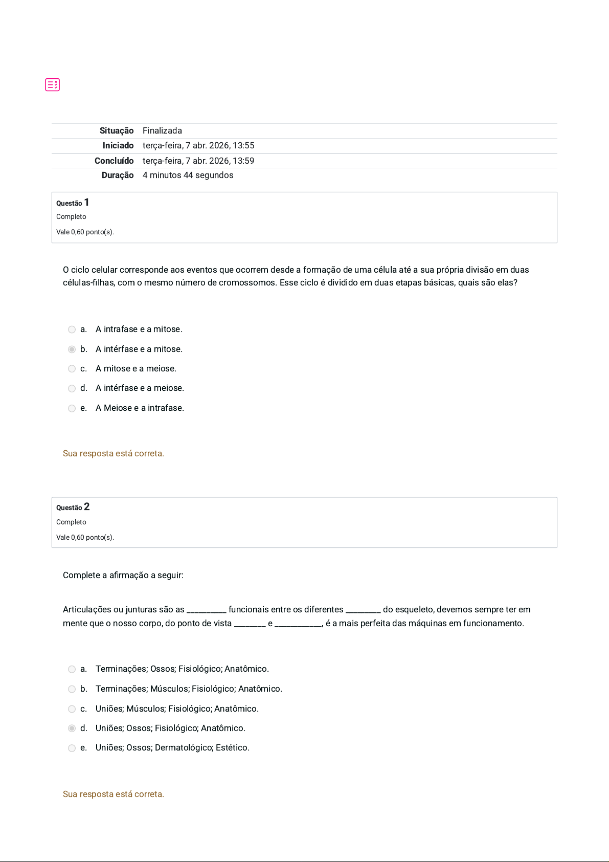 Situação Finalizada Iniciado terça-feira, 7 abr. 2026, 13:55 Concluído terça-feira, 7 abr. 2026, 13:59 Duração 4 minutos 44 segundos Questão 1 Completo Vale 0,60 ponto(s). Questão 2 Completo Vale 0,60 ponto(s). O ciclo celular corresponde aos eventos que ocorrem desde a formação de uma célula até a sua própria divisão em duas células-filhas, com o mesmo número de cromossomos. Esse ciclo é dividido em duas etapas básicas, quais são elas? a. A intrafase e a mitose. b. A intérfase e a mitose. c. A mitose e a meiose. d. A intérfase e a meiose. e. A Meiose e a intrafase. Sua resposta está correta. Complete a afirmação a seguir: Articulações ou junturas são as __________ funcionais entre os diferentes _________ do esqueleto, devemos sempre ter em mente que o nosso corpo, do ponto de vista ________ e ____________, é a mais perfeita das máquinas em funcionamento. a. Terminações; Ossos; Fisiológico; Anatômico. b. Terminações; Músculos; Fisiológico; Anatômico. c. Uniões; Músculos; Fisiológico; Anatômico. d. Uniões; Ossos; Fisiológico; Anatômico. e. Uniões; Ossos; Dermatológico; Estético. Sua resposta está correta. Questão 3 Completo Vale 0,60 ponto(s). Questão 4 Completo Vale 0,60 ponto(s). Dentre as funções do sistema esquelético é correto dizer: I. Sustentação para partes moles do organismo; II. Proteção de estruturas vitais; III. Base mecânica para o movimento (são os elementos passivos do movimento); IV. Armazenamento de sais minerais; V. Hematopoiética ou hematopoiética. a. III, IV e V são verdadeiras. b. IV e V apenas são verdadeiras. c. I, IV e V são verdadeiras. d. I, II, III, IV e V são verdadeiras. e. II, III, e IV são verdadeiras. Sua resposta está correta. Complete a afirmativa abaixo: “O tecido conjuntivo caracteriza-se por apresentarem diversos tipos de células imersas em grande quantidade de material ___________ ou matriz, sintetizado pelas próprias células da ________, assim como, vários tipos de ________ (colágenas, elásticas e reticulares) que estão mergulhadas na substância fundamental _________ da matriz. a. Intracelular; membrana; fibras; amorfa. b. Extracelular; matriz; aminoácidos; amorfa. c. Intracelular; matriz; fibras; amorfa. d. Extracelular; matriz; fibras; amorfa. e. Extracelular; membrana; fibras; amorfa. Sua resposta está correta. Questão 5 Completo Vale 0,60 ponto(s). Questão 6 Completo Vale 0,60 ponto(s). As membranas têm a função de revestir, proteger e de dar forma aos organismos onde estão presentes. Quanto a membrana plasmática, ela é… a. Tem a função principal de respiração celular, de produzir energia (ATP) para aquela célula funcionar e exercer suas atividades. Tem seu próprio DNA e seus próprios ribossomos. b. O conjunto de bolsas e tubos que têm função principal de transportar algumas substâncias. Existem dois tipos, Rugoso ou Granuloso (RER) e Liso ou Agranuloso (REL). c. Formada também por bolsas sobrepostas, tem a função de secreção celular, isto é, de levar o que está dentro da célula para fora dela. Também tem a função de sintetizar carboidratos do tipos polissacarídeos. d. Encontrada nas células eucariontes, guarda o material genético, o DNA do ser vivo e comanda tudo que acontece dentro da célula. e. O que envolve a célula, que a delimita e tem a função de permeabilidade seletiva. Sua resposta está correta. No mecanismo de contração das células ou fibras musculares esqueléticas, ocorre o encurtamento dos sarcômeros. O que isso representa? a. Os filamentos de actina “deslizam” sobre os de miosina, graças a certos pontos de união que se formam entre esses dois filamentos, levando à formação da actomiosina. b. Os filamentos de actina não devem encostar ou se quer tocas os de miosina, graças a certos pontos de união que se formam entre esses dois filamentos, levando à formação da actomiosina. c. Os filamentos de actina não tocam sobre os de miosina, graças a certos pontos de distâncias que se formam entre esses dois filamentos, levando à formação da actomiosina. d. Os filamentos de miosina “deslizam” sobre os de actina, graças a certos pontos de união que se formam entre esses dois filamentos, levando à formação da actomiosina. e. Os filamentos de actina se chocam drasticamente com os de miosina, o que provoca muita dor no indivíduo, mas que levando à formação da actomiosina. Sua resposta está correta. Questão 7 Completo Vale 0,60 ponto(s). Questão 8 Completo Vale 0,60 ponto(s). O esqueleto pode ser dividido em dois grandes grupos. Quais são esses grupos? a. Esqueleto Anormal e Esqueleto Perpendicular. b. Esqueleto Anormal e Esqueleto Apendicular. c. Esqueleto Axial e Esqueleto Perpendicular. d. Esqueleto Axial e Esqueleto Apendicular. e. Esqueleto Axial e Esqueleto Exoral. Sua resposta está correta. As proteínas podem ser classificadas em duas categorias. Quais são elas? a. As proteínas sociopáticas e as proteínas conjugadas. b. As proteínas simples e as proteínas convexas. c. As proteínas simples e as proteínas complexas. d. As proteínas severas e as proteínas complexas. e. As proteínas simples e as proteínas conjugadas. Sua resposta está correta. Questão 9 Completo Vale 0,60 ponto(s). Questão 10 Completo Vale 0,60 ponto(s). Assinale a alternativa que contenha todos os componentes do sangue. a. Hemácias, Eritrócitos, Glóbulos Vermelhos; Leucócitos ou Glóbulos Brancos; Plaquetas ou Trombócitos e Suco gástrico. b. Leucócitos ou Glóbulos Brancos; Suco gástrico; Eritrócitos, Glóbulos Vermelhos; Plaquetas ou Trombócitos e Plasma. c. Hemácias, Ferro, Glóbulos Vermelhos; Leucócitos ou Glóbulos Brancos; Plaquetas ou Trombócitos e Plasma. d. Hemácias, Eritrócitos, Glóbulos Vermelhos; Leucócitos ou Glóbulos Brancos; Plaquetas ou Trombócitos e Plasma. e. Leucócitos ou Glóbulos Brancos; Mucosa; Eritrócitos, Glóbulos Vermelhos; Plaquetas ou Trombócitos e Pl