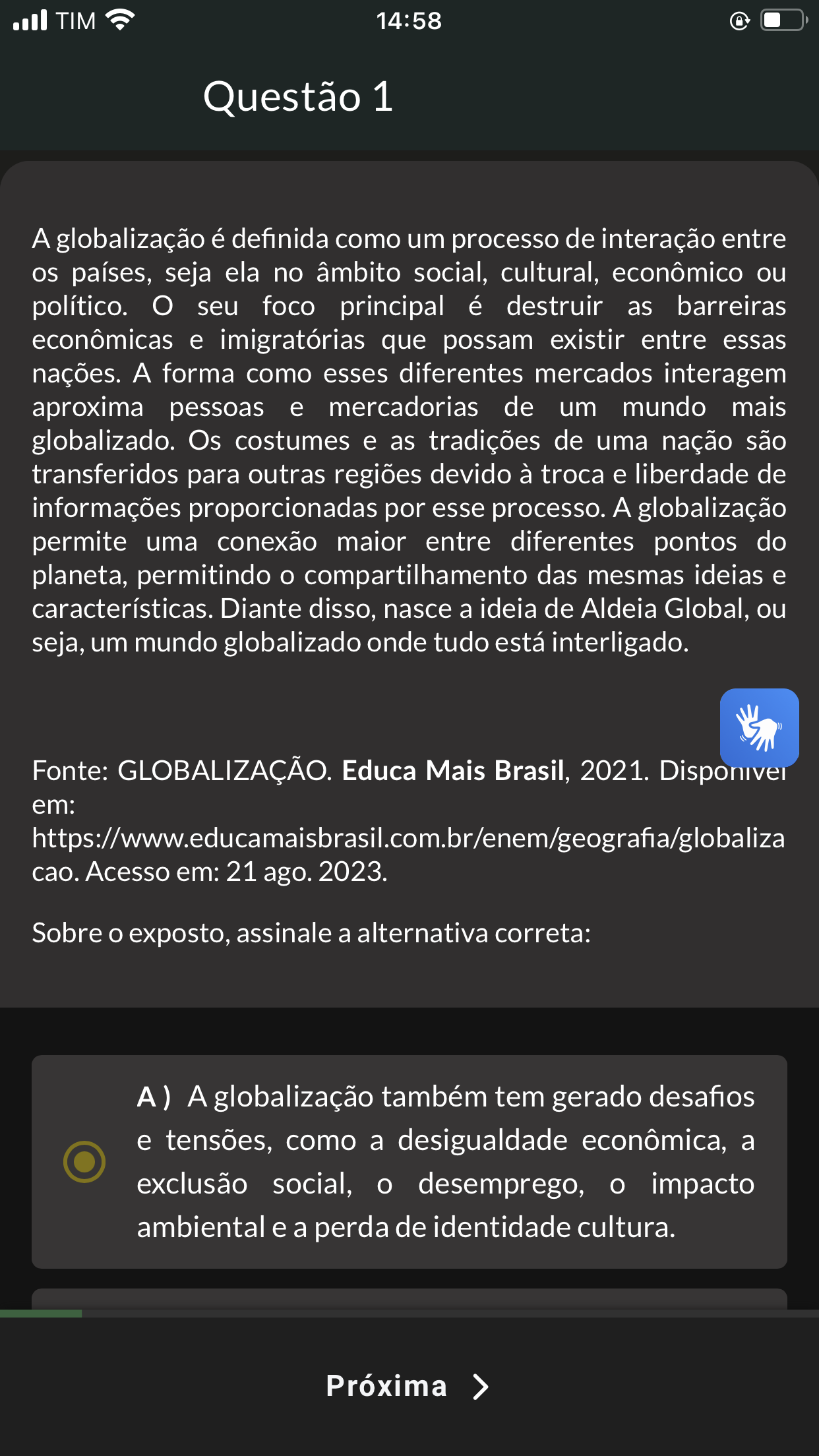 TIM 14:58 Questão 1 A globalização é definida como um processo de interação entre os países, seja ela no âmbito social, cultural, econômico ou político. seu foco principal é destruir as barreiras econômicas e imigratórias que possam existir entre essas nações. A forma como esses diferentes mercados interagem aproxima pessoas e mercadorias de um mundo mais globalizado. Os costumes e as tradições de uma nação são transferidos para outras regiões devido à troca e liberdade de informações proporcionadas por esse processo. A globalização permite uma conexão maior entre diferentes pontos do planeta, permitindo compartilhamento das mesmas ideias e características. Diante disso, nasce a ideia de Aldeia Global, ou seja, um mundo globalizado onde tudo está interligado. Fonte: GLOBALIZAÇÃO. Educa Mais Brasil, 2021. em: https://www.educamaisbrasil.com.br/enem/geografia/globaliza cao. Acesso em: 21 ago. 2023. Sobre exposto, assinale a alternativa correta: A) A globalização também tem gerado desafios e tensões, como a desigualdade econômica, a exclusão social, desemprego, impacto ambiental e a perda de identidade cultura. Próxima >