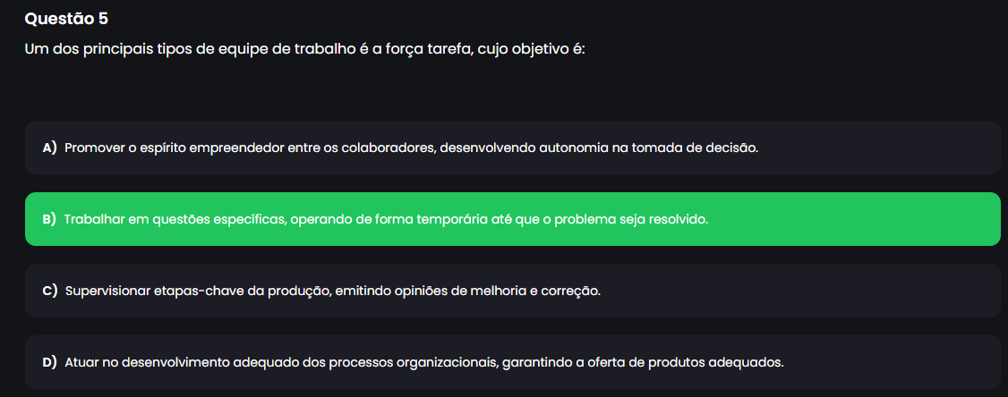 Questão 5 Um dos principais tipos de equipe de trabalho é a força tarefa, cujo objetivo é: A) Promover O espírito empreendedor entre OS colaboradores, desenvolvendo autonomia na tomada de decisão. B) Trabalhar em questões específicas, operando de forma temporária até que problema seja resolvido. c) Supervisionar etapas-chave da produção, emitindo opiniões de melhoria e correção. D) Atuar no desenvolvimento adequado dos processos organizacionais, garantindo a oferta de produtos adequados.