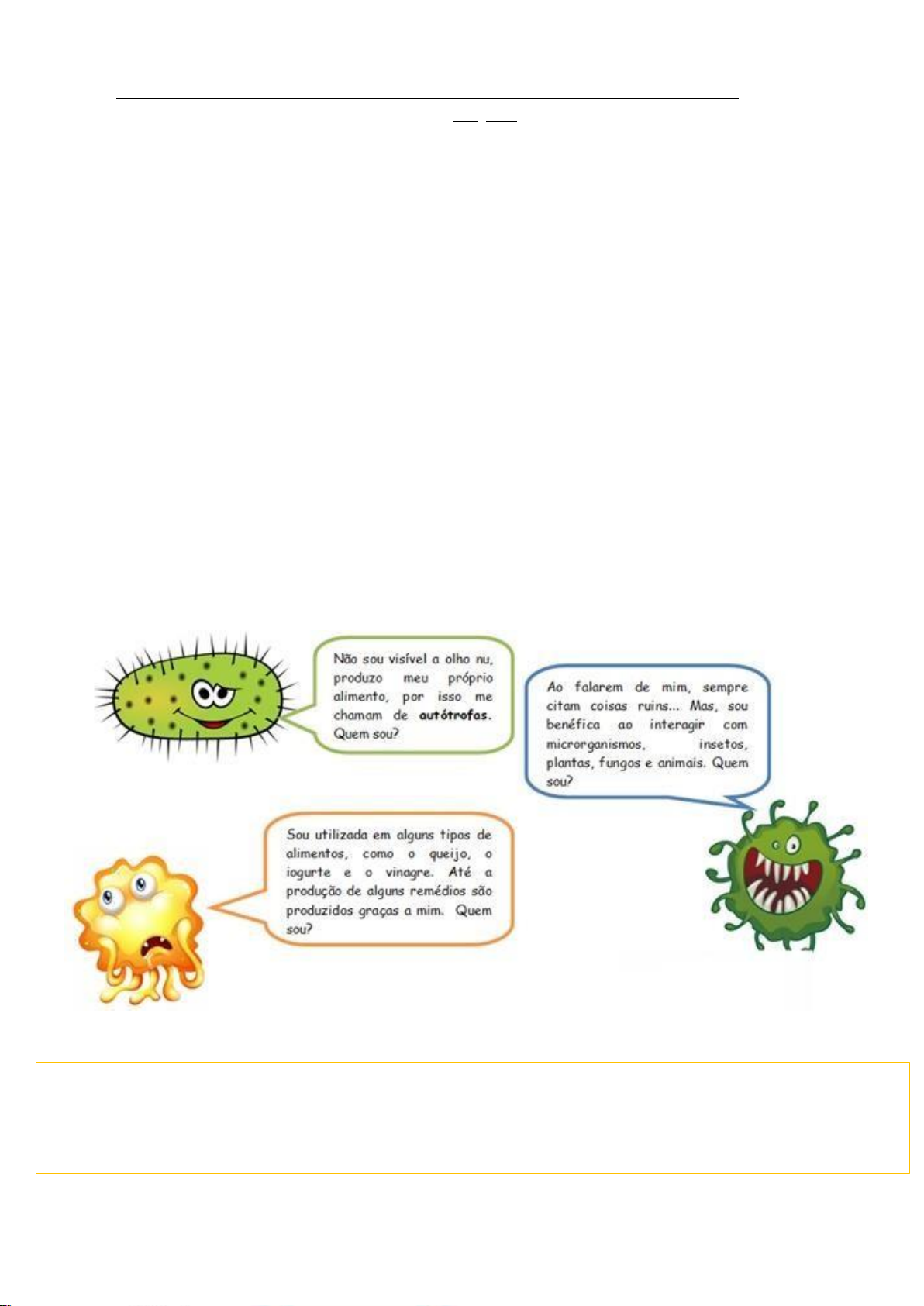 “Eles são operários quase anônimos da natureza, ao mesmo tempo criadores e destruidores da vida (...). Há os que fazem o pão crescer (...). Alguns escurecem os azulejos do banheiro, outros causam e curam doenças, enriquecem o solo, apodrecem a madeira”. Fonte: National Geographic, Agosto de 2000 (Usado para fins didáticos). UEB RIBANDA BERENICE BRAGA ALUNO(A): _ TUMA: 4º ANO DATA: / /2024 Revisão de Ciências 1) Coloque V para verdadeiro e F para falso: ( ) as bactérias só podem ser vistas com microscópio. ( ) as bactérias produzem seu próprio alimento. ( ) os fungos alimentam-se de matéria morta. ( ) fungos e bactérias são seres decompositores. ( ) o bolor é um tipo de bactéria. ( ) cogumelos também são fungos. 2) Classifique as frases a seguir em verdadeira (V) ou falsa (F). ( ) Todos os seres vivos são formados por células. ( ) As bactérias são exemplos de seres pluricelulares. ( ) Seres pluricelulares são formados por uma única célula. ( ) Os seres vivos precisam de energia para manter suas atividades. 3) Identifique, em bactérias ou vírus, o ser vivo descrito abaixo pelas características expostas nos balões de fala: 4) Leia com atenção: O texto acima se refere aos: a) ( ) Vermes b) ( ) Fungos c) ( ) Parasitas d) ( ) Micróbios 5) Complete a frase a seguir com a palavra da alternativa correta. a) Fungos. b) Vírus. c) Bactérias. 6) O queijo é produzido por meio da ação de microrganismos. Responda às questões a seguir. d) Qual é o nome dos microrganismos que participam da produção do queijo? ______________________________________________________________________ e) Esse microrganismo é unicelular ou pluricelular? ______________________________________________________________________ f) Cite outro tipo de alimento obtido por meio desse microrganismo. _______________________________________________________________________ 7) Encontre no diagrama o nome de quatro alimentos produzidos pela ação de bactérias. 8) Observe a imagem e responda V verdadeiro e F falso: ( ) Esse é primeiro microscópio criado pelo homem. ( ) A primeira célula vista pelo homem foi de uma cortiça. ( ) Todo ser vivo são unicelular ( formado por uma célula). ( ) Todos os seres vivos são formados por célula; 9) Qual é o microrganismo usado na produção do antibiótico penicilina? a) Vírus. b) Bactéria. c) Protozoário. d) Fungo. 10) Todas as imagens a seguir são de um microrganismo que ataca plantas, causando uma doença chamada ferrugem. • Que instrumento de observação foi usado em cada caso: olho nu (sem instrumento), lupa ou microscópio? Escreva abaixo de cada imagem. 11) Por que é recomendado lavarmos as nossas mãos quando chegamos da rua? Observe a figura abaixo e, com suas palavras, explique a assertiva. _____________________________________________________________________________________________ _____________________________________________________________________________________________ _____________________________________________________________________________________________ _____________________________________________________________________________________________ _____________________________________________________________________________________________ 12) Observe as imagens abaixo e, complete o quadro de acordo com sua doença, transmissão e tratamento.