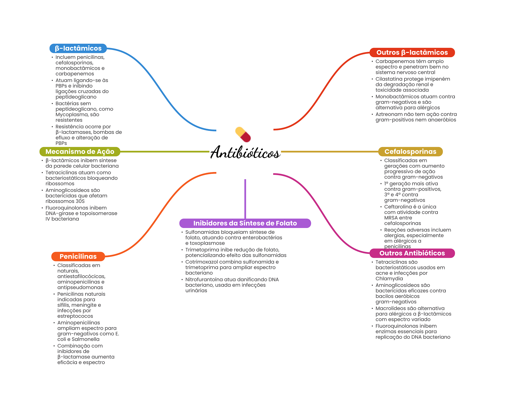 Outros ß-lactâmicos Incluem penicilinas, cefalosporinas, Carbapenemos têm amplo monobactâmicos e espectro e penetram bem no carbapenemos sistema nervoso central Atuam ligando-se às Cilastatina protege imipeném PBPs e inibindo da degradação renal e ligações cruzadas do toxicidade associada peptideoglicano Monobactâmicos atuam contra Bactérias sem gram-negativos e são peptídeoglicano, como alternativa para alérgicos Mycoplasma, são Aztreonam não tem ação contra resistentes gram-positivos nem anaeróbios Resistência ocorre por bombas de efluxo e alteração de PBPs Mecanismo de Ação Antibióticos Cefalosporinas inibem síntese Classificadas em da parede celular bacteriana gerações com aumento Tetraciclinas atuam como progressivo de ação bacteriostáticos bloqueando contra gram-negativos ribossomos geração mais ativa Aminoglicosídeos são contra gram-positivos, bactericidas que afetam e contra ribossomos 30S gram-negativos Fluoroquinolonas inibem Ceftarolina é a única DNA-girase e topoisomerase com atividade contra IV bacteriana MRSA entre Inibidores da Síntese de Folato cefalosporinas Sulfonamidas bloqueiam síntese de Reações adversas incluem folato, atuando contra enterobactérias alergias, especialmente e toxoplasmose em alérgicos a penicilinas Trimetoprima inibe redução de folato, Penicilinas potencializando efeito das sulfonamidas Outros Antibióticos Cotrimoxazol combina sulfonamida e Tetraciclinas são Classificadas em trimetoprima para ampliar espectro usados em naturais, bacteriano acne e infecções por antiestafilocócicas, Nitrofurantoína atua danificando DNA Chlamydia aminopenicilinas e antipseudomonas bacteriano, usada em infecções Aminoglicosídeos são urinárias bactericidas eficazes contra Penicilinas naturais bacilos aeróbicos indicadas para gram-negativos sífilis, meningite e infecções por Macrolídeos são alternativa estreptococos para alérgicos a com espectro variado Aminopenicilinas ampliam espectro para Fluoroquinolonas inibem gram-negativos como E. enzimas essenciais para coli e Salmonella replicação do DNA bacteriano Combinação com inibidores de aumenta eficácia e espectro