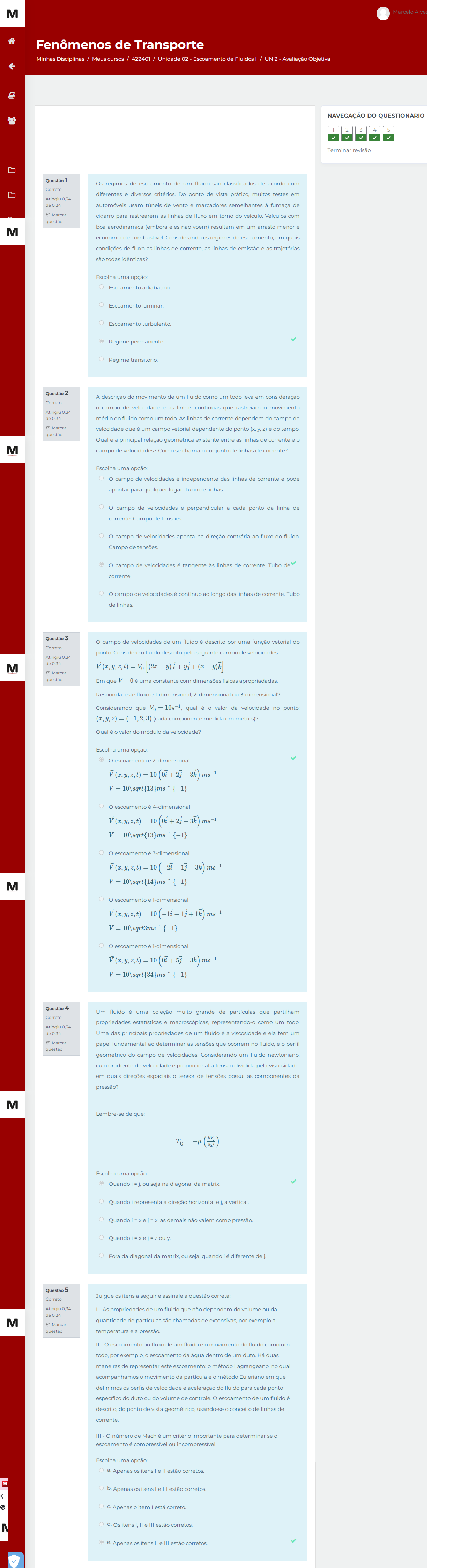 M Fenômenos de Transporte Minhas Disciplinas Meus cursos 422401 Unidade 02 Escoamento de Fluidos Avaliação Objetiva NAVEGAÇÃO DO Termina revisão Questão Os regimes de escoamento de um fluido são classificados de acordo com Correto diferentes e diversos critérios Do ponto de vista prático, muitos testes em Atingiu automóveis usam túneis de vento e marcadores semelhantes de Marca cigarro para rastrearem as linhas de fluxo em torno do veículo Veículos com questão boa (embora eles não voem) resu Itam em um arrasto meno e M economia de combustivel Considera regimes de em quais condições de fluxo as linhas de corrente, as linhas de emissão as trajetórias todas Escolha uma opção Escoamento adiabático Escoamento laminar Escoamento Regime permanente Regime transitório A descrição do movimento de um fluido como um em consideração Correto campo de velocidade e as linhas continuas que rastreiam movimento médio do fluido como um As inhas de corrente dependem do campo de P Marcar velocidade campo vetorial dependente do ponto tempo questão Qual principal relação geométrica existente entre as linhas de corrente M campo de idades? Como se chama conjunto de linhas de corrente? Escolha uma campo de velocidades independente das linhas de corrente pode apontar para qualquer lugar Tubo de campo de velocidades perpendicular a cada ponto da linha de corrente Campo tensões campo de velocidades aponta na direção contrária ao fluxo do fluido Campo tensões campo de velocidades tangente linhas de corrente Tubo de corrente campo de velocidades ao longo das inhas de corrente Tubo de linhas campo de veloc dades de um fluido descrito por uma função vetorial do Correto ponto Considere fluido descrito pelo seguinte campo de velocidades Atingiu 0,34 M Marcar questão uma constante com dimensões físicas apropriadadas Responda este sional 2 dimensiona ou Considerando que qual valor da velocidade no ponto (x,y, (-1,2,3) (cada componente medida em metros)? Qual valor do módulo da velocidade? Escolha uma escoamento dimensiona escoamento dimensional 10\sqrt{13}ms O escoamento dimensional M V escoamento V 10\sqrt3ms {-1} escoamento dimensional Um fluido uma coleção muito grande de que partilham Correto propriedades estatísticas macroscópicas representando-o como um todo Atingiu Uma das principais propriedades de um fluido a viscosidade ela tem um Marcar papel fundamental determ as tensões que ocorrem no fluido, perfil questão geométrico do campo de velocidades Considerando um fluido newtoniano cujo gradiente de velocidade proporcional tensão dividida pela em quais direções espaciais tensor de tensões as componentes da pressão? M Lembre que Escolha uma Quando ou seja na da Quando representa direção horizontal vertical Quando demais não valem como pressão. Quando Fora da diagona da matr seja quando diferente dej Julgue itens segui assinale uestão correta Correto As propriedades de um que não dependem do volume ou da M uantidade par tículas são chamadas de por exemplo F questão temperatura pressão escoamento ou fluxo de um fluido movimento do fluido como um todo, por exemplo escoamer da água dentro de um duto Há duas maneiras de representa este escoamento método no qual acompanhamos movimento da particula método Euleriano em que definimos os perfis de velocidade celeração do para cada ponto do duto ou do volume de escoamento de um descrito do de vista geométrico usando conceito de linhas de corrente. de Mach é importante para determinar escoamento compressive ou incompressivel Escolha uma Apenas itens retos Apenas itens estão corretos Apenas item esta correto d. estão corretos e. Apenas itens estão corretos