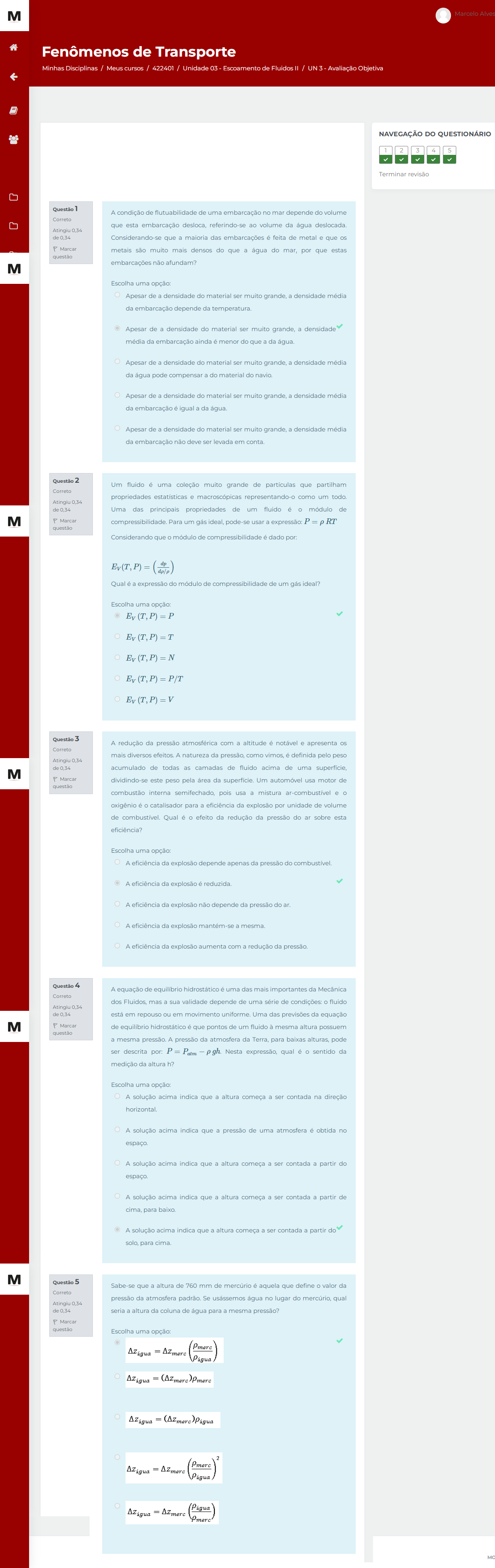 M Marcelo Fenômenos de Transporte Minhas Disciplinas / Meus cursos / 422401 Unidade 03 / Avaliação Objetiva NAVEGAÇÃO DO QUESTIONÁRIO 5 Terminar revisão Questão A condição de flutuabilidade de uma embarcação no mar depende do volume Correto que esta embarcação desloca, referindo se ao volume da água deslocada Considerando se que a maioria das embarcações feita de metal e que os Marcar metais são muito mais densos do que água do mar, por que estas questão embarcações não afundam? M Escolha uma opção: Apesar de densidade do material ser muito grande, densidade média da embarcação depende da Apesar de a densidade do material ser muito grande, densidade média da embarcação ainda menor do que da água Apesar de a densidade do material ser muito grande, a densidade média da água pode compensar do material do Apesar de densidade do material ser muito grande, a densidade média da embarcação igual da água Apesar de densidade do material ser muito grande, a densidade média da embarcação não deve ser levada em Questão 2 Um fluido é uma coleção muito grande de que partilham Correto propriedades estatísticas e macroscópicas representando-o como um Atingiu 0,34 Uma das principais propriedades de um fluido é módulo de M Marcar compressibilidade Para um gás ideal pode se usar expressão: RT questão Considerando que módulo de compressibilidade dado por: Ev(T,P) Qual expressão do módulo de compressibilidade de um gás ideal? Escolha uma opção: V Questão 3 A redução da pressão atmosférica com altitude é notável apresenta Correto mais diversos efeitos A natureza da como é definida pelo peso acumulado de todas as camadas de fluido acima de uma superfície, M Marcar dividindo-se este peso pela da Um automóvel usa motor de questão combustão interna semifechado, pois usa a mistura e oxigênio é catalisador para eficiência da explosão por unidade de volume de Qual é efeito da redução da pressão do ar sobre esta eficiência? Escolha uma opção: eficiência da explosão depende apenas da pressão do eficiência da explosão eficiência da explosão não depende da pressão do A eficiência da explosão mantém se A eficiência da explosão aumenta com redução da Questão 4 A equação de hidrostático uma das mais importantes da Mecânica Correto dos Fluidos, mas a sua validade depende de uma série de condições fluido está em repouso ou em movimento Uma das previsões da equação M Marcar de hidrostático que pontos de um fluido mesma altura possuem questão a mesma pressão. A pressão da atmosfera da Terra, para baixas pode ser descrita por: Nesta expressão, qual sentido da medição da altura h? Escolha uma opção: A solução acima indica que a altura começa a ser contada na direção A solução acima indica que pressão de uma atmosfera obtida no espaço. A solução acima indica que a altura começa a ser contada partir do espaço A solução acima indica que a altura começa a ser contada partir de cima, para baixo A solução acima indica que altura começa ser contada a partir do solo, para cima M Questão Sabe se que altura de 760 mm de mercúrio aquela que define valor da Correto pressão da atmosfera padrão. Se usássemos água no lugar do mercúrio, qual seria altura da coluna de água para mesma pressão? questão Escolha uma Pmerc Pmerc