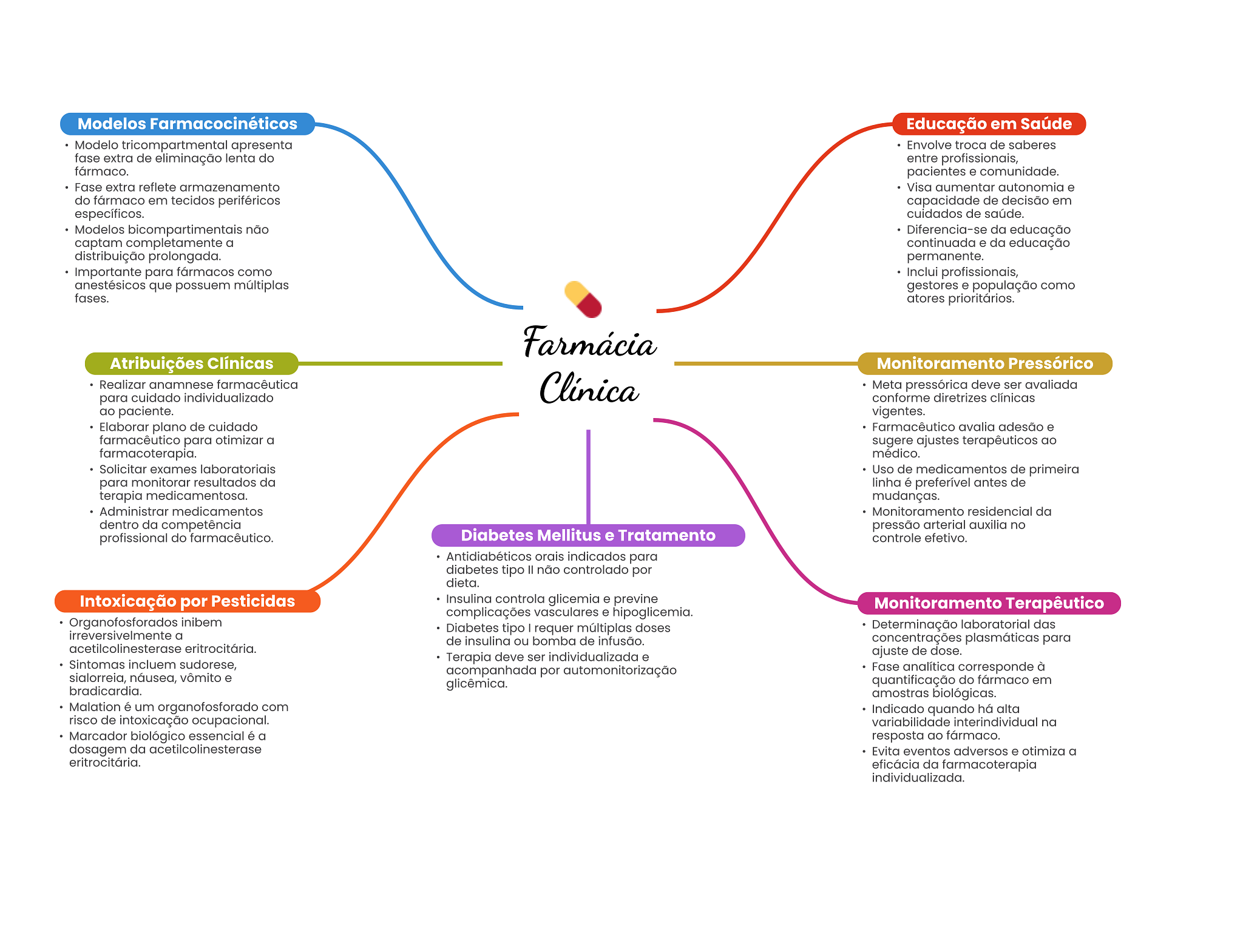 Modelos Farmacocinéticos Educação em Saúde Modelo tricompartmental apresenta Envolve troca de saberes fase extra de eliminação lenta do entre profissionais, fármaco. pacientes e comunidade. Fase extra reflete armazenamento Visa aumentar autonomia e do fármaco em tecidos periféricos capacidade de decisão em específicos. cuidados de saúde. Modelos bicompartimentais não Diferencia-se da educação captam completamente a continuada e da educação distribuição prolongada. permanente. Importante para fármacos como Inclui profissionais, anestésicos que possuem múltiplas gestores e população como fases. atores prioritários. Farmácia Atribuições Clínicas Monitoramento Pressórico Realizar anamnese farmacêutica Clínica Meta pressórica deve ser avaliada para cuidado individualizado conforme diretrizes clínicas ao paciente. vigentes. Elaborar plano de cuidado Farmacêutico avalia adesão e farmacêutico para otimizar a sugere ajustes terapêuticos ao farmacoterapia. médico. Solicitar exames laboratoriais Uso de medicamentos de primeira para monitorar resultados da linha é preferível antes de terapia medicamentosa. mudanças. Administrar medicamentos Monitoramento residencial da dentro da competência pressão arterial auxilia no profissional do farmacêutico. Diabetes Mellitus e Tratamento controle efetivo. Antidiabéticos orais indicados para diabetes tipo não controlado por dieta. Intoxicação por Pesticidas Insulina controla glicemia e previne Monitoramento Terapêutico complicações vasculares e hipoglicemia. Organofosforados inibem Diabetes tipo requer múltiplas doses Determinação laboratorial das irreversivelmente a de insulina ou bomba de infusão. concentrações plasmáticas para acetilcolinesterase eritrocitária. Terapia deve ser individualizada e ajuste de dose. Sintomas incluem sudorese, acompanhada por automonitorização Fase analítica corresponde à sialorreia, náusea, vômito e bradicardia. glicêmica. quantificação do fármaco em amostras biológicas. Malation é um organofosforado com Indicado quando há alta risco de intoxicação ocupacional. variabilidade interindividual na Marcador biológico essencial é a resposta ao fármaco. dosagem da Evita eventos adversos e otimiza a eritrocitária. eficácia da farmacoterapia individualizada.