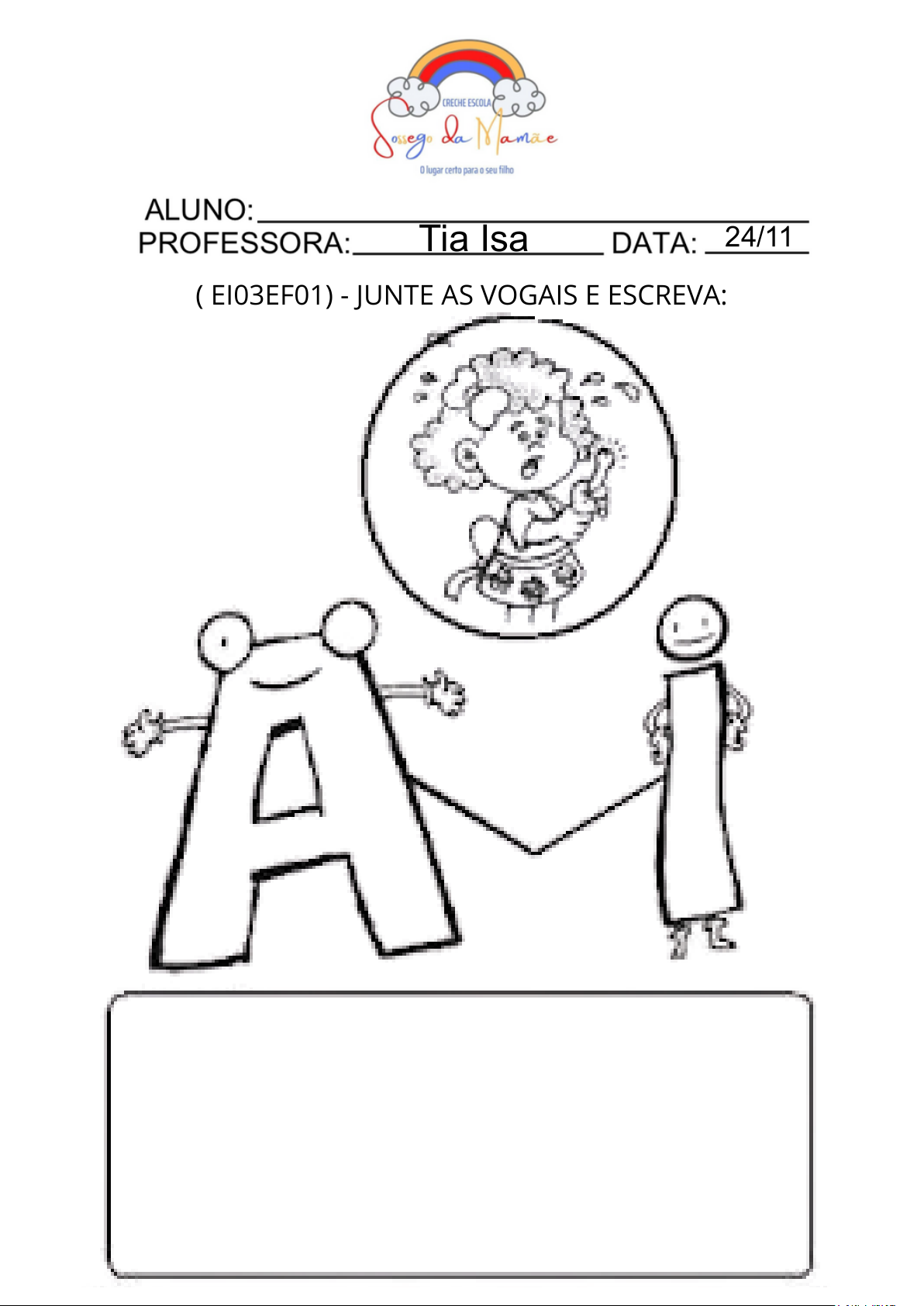 Tia Isa 24/11 ( EI03EF01) - JUNTE AS VOGAIS E ESCREVA: Tia Isa 24/11 ( EI03EF01) - ESCREVA AS JUNÇÕES DAS VOGAIS ABAIXO: Tia Isa 24/11 ( EI03EF01) - COMPLETE O NOME DAS FIGURAS COM OS ENCONTROS VOCÁLICOS