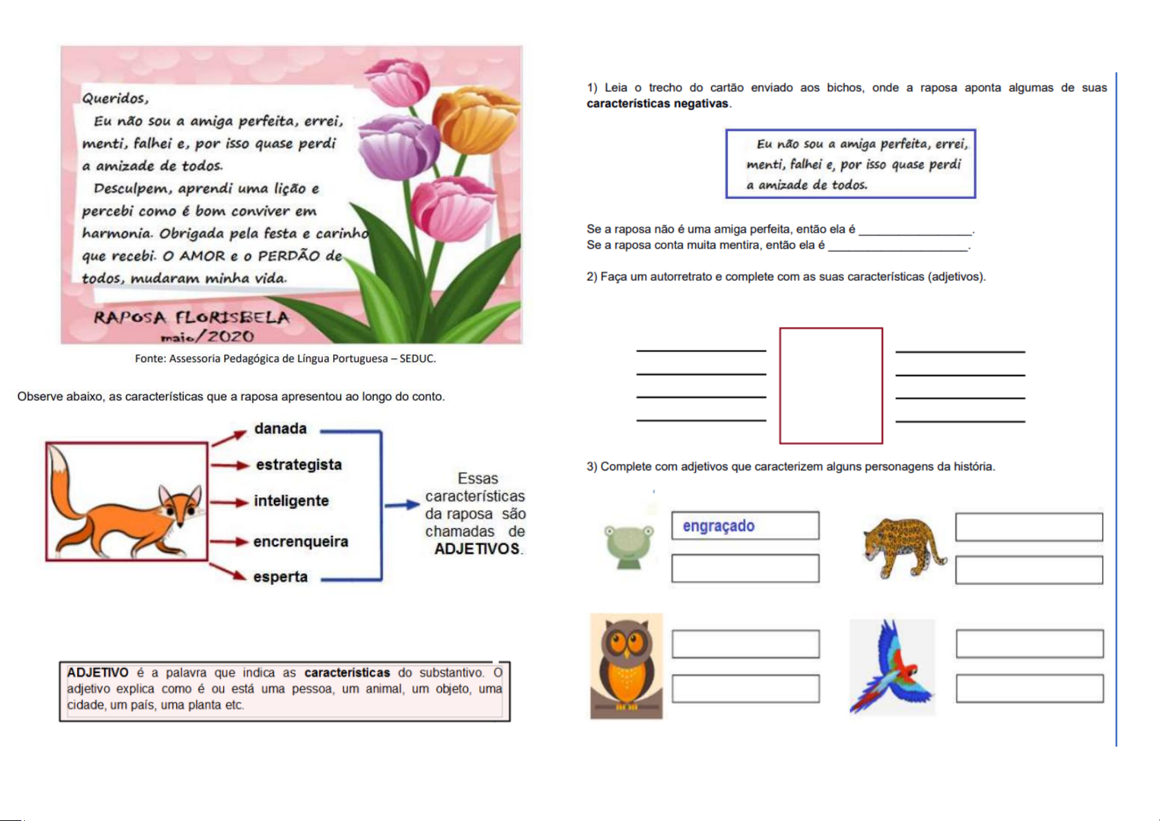 1) Leia trecho do cartão enviado aos bichos, onde a raposa aponta algumas de suas Queridos, características negativas. Eu não sou a amiga perfeita, errei, menti, falhei e, por isso quase perdi Eu não sou a amiga perfeita, errei, a amizade de todos. menti, falhei e, por isso quase perdi Desculpem, aprendi uma lição e a amizade de todos. percebi como é bom conviver em harmonia. Obrigada pela festa e carinho Se a raposa não é uma amiga perfeita, então ela é Se a raposa conta muita mentira, então ela é que recebi. AMOR e PERDÃO de todos, mudaram minha vida. 2) Faça um autorretrato e complete com as suas características (adjetivos). RAPOSA FLORISBELA maio/2020 Fonte: Assessoria Pedagógica de Língua Portuguesa SEDUC. Observe abaixo, as características que a raposa apresentou ao longo do conto. danada estrategista 3) Complete com adjetivos que caracterizem alguns personagens da história. Essas inteligente características da raposa são chamadas de engraçado encrenqueira ADJETIVOS. esperta ADJETIVO é a palavra que indica as caracteristicas do substantivo. adjetivo explica como é ou está uma pessoa, um animal, um objeto, uma cidade, um país, uma planta etc.